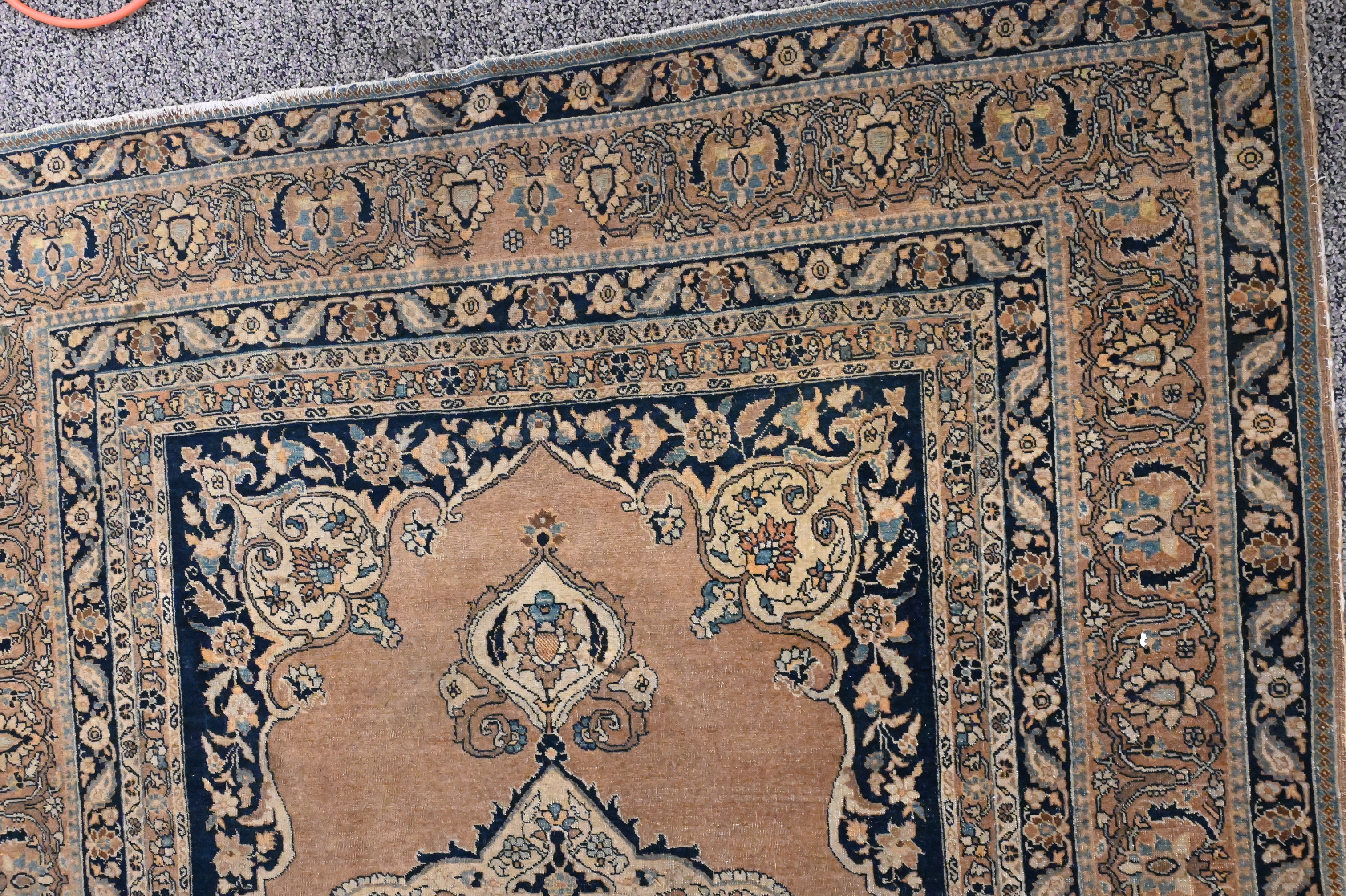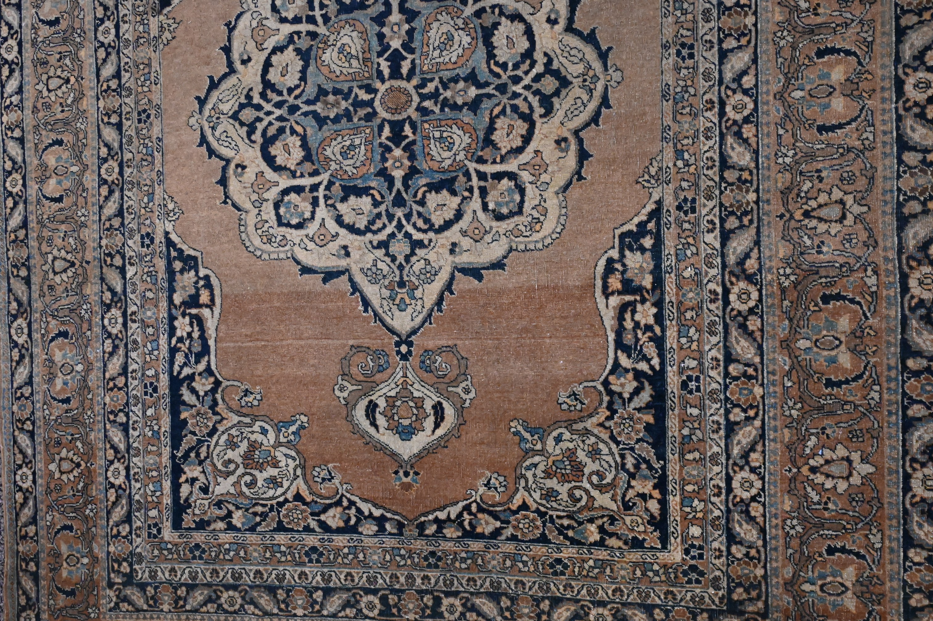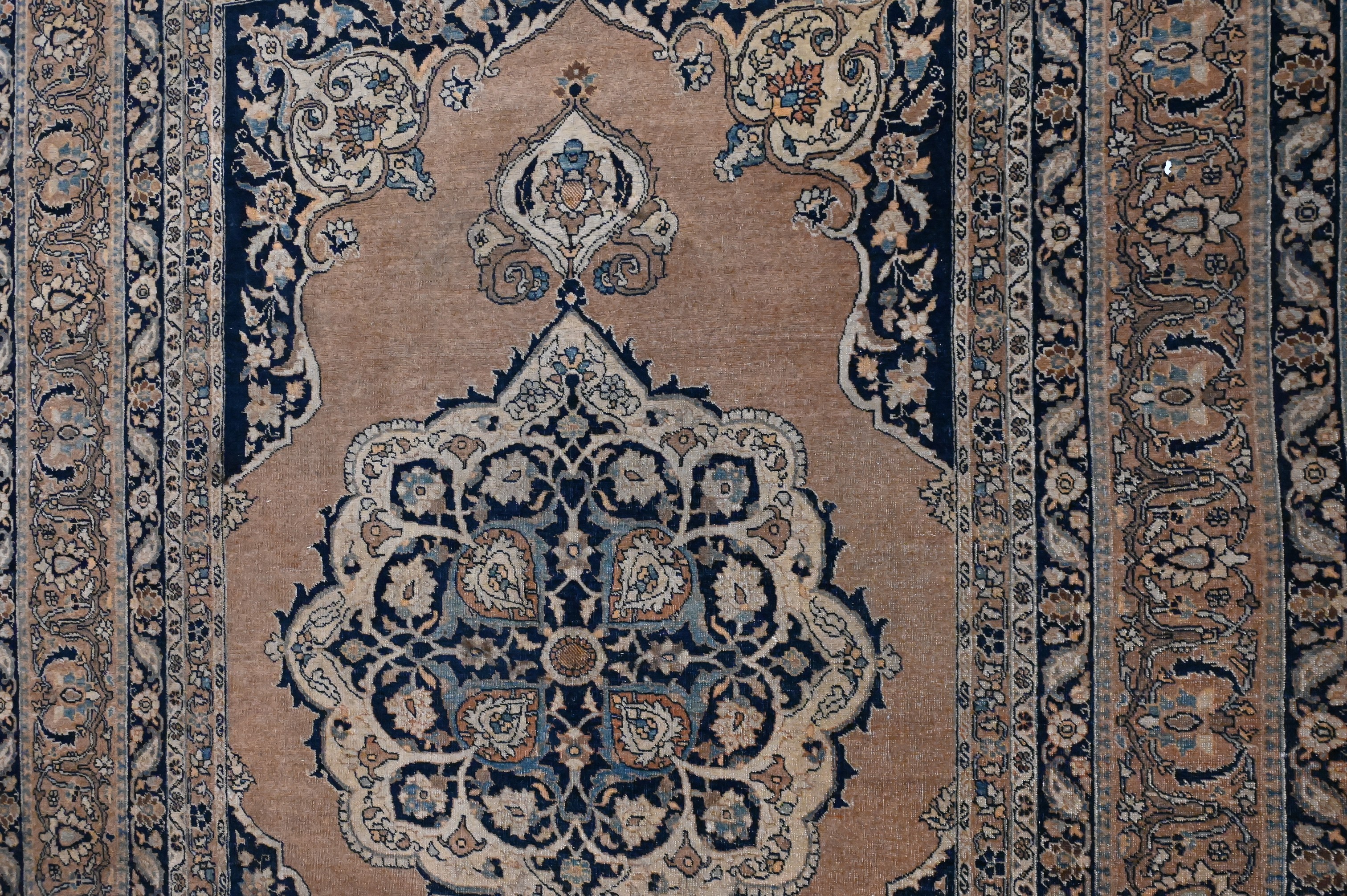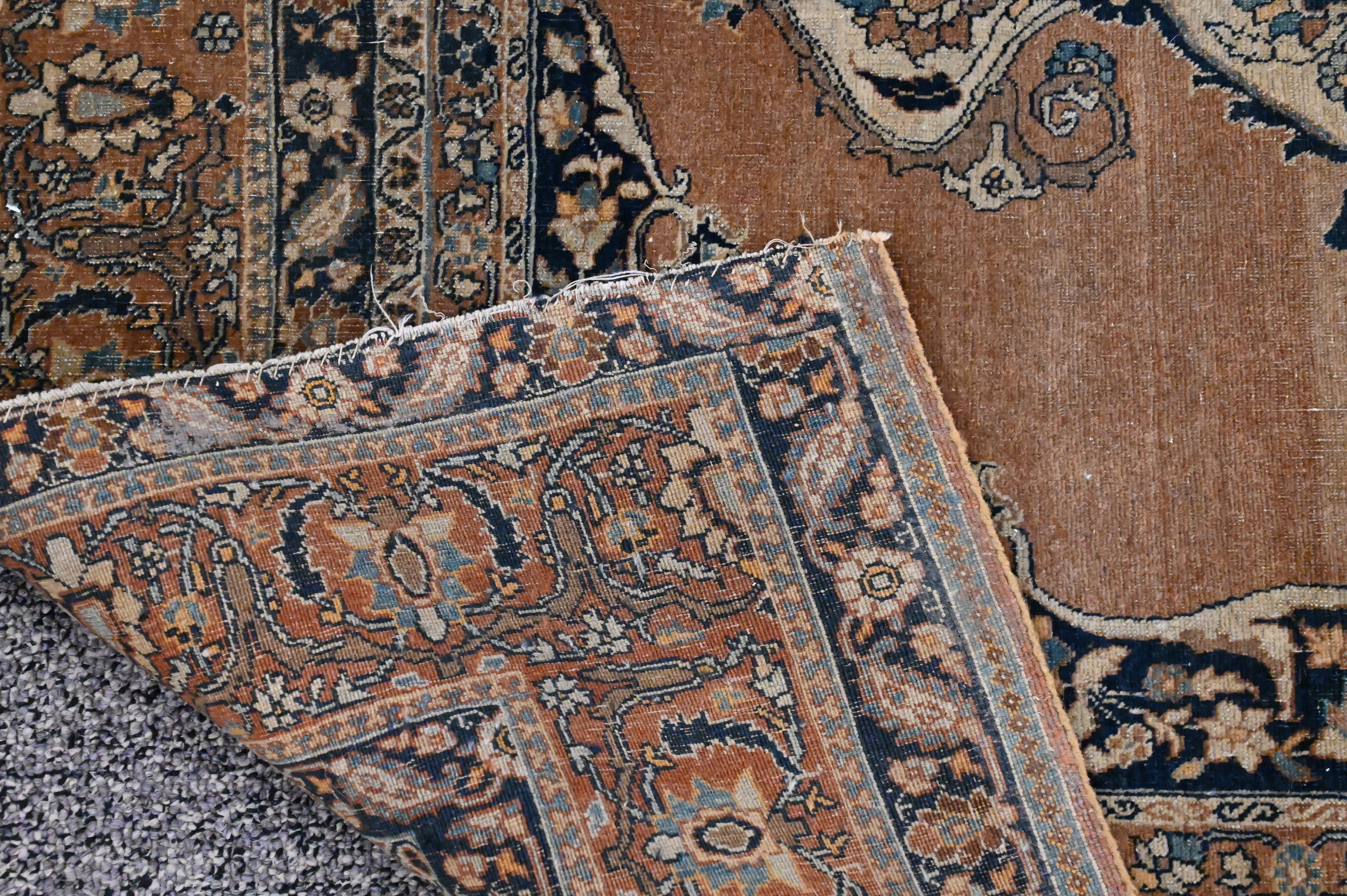 A Persian Farahan Sarouk carpet featuring a central medallion with pendants, surrounded by floral and scrolling vine motifs, in a palette of camel, navy, ivory, and pale blue. Multiple floral borders frame the field.