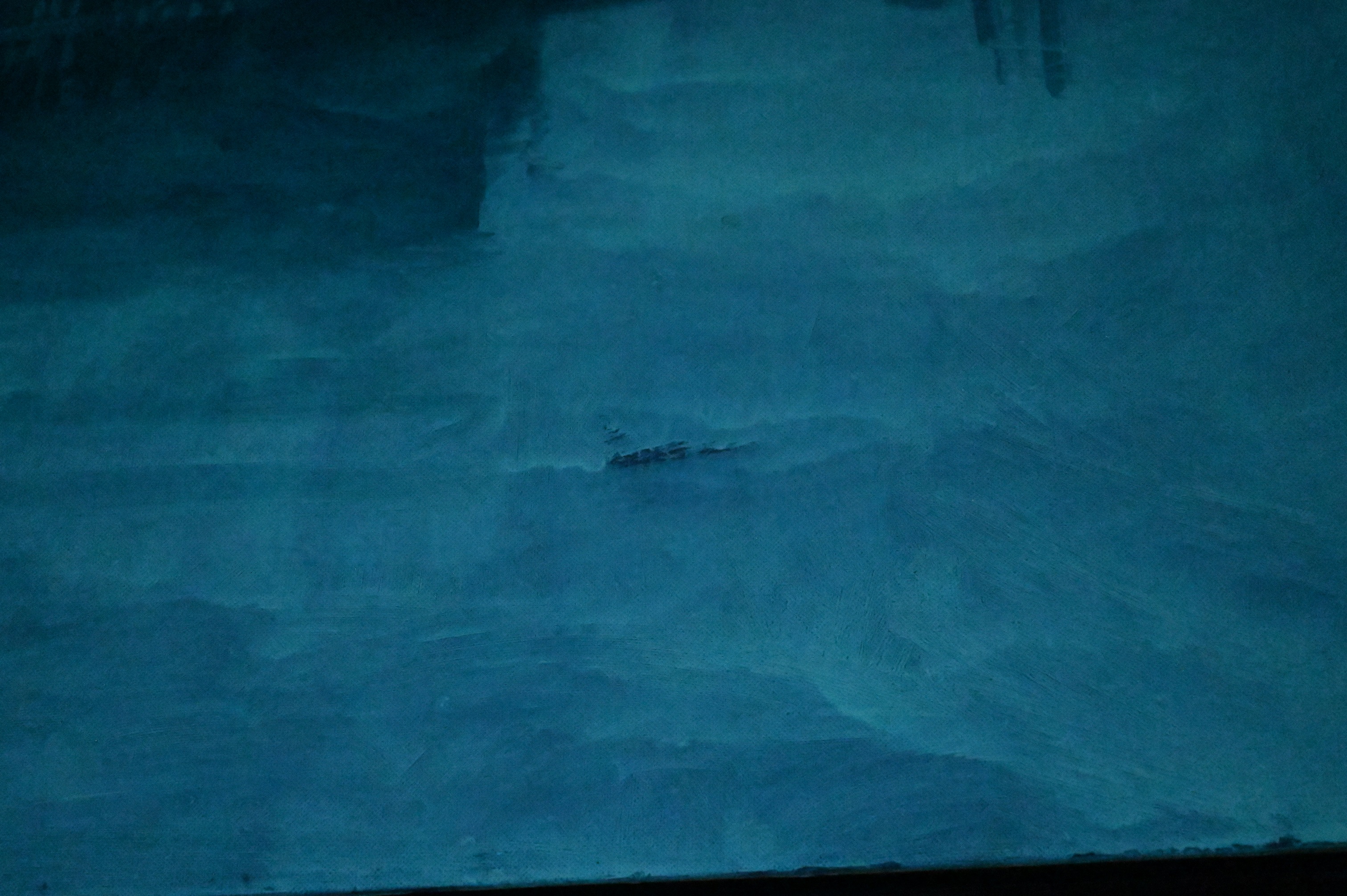 Black light: visible varnish and varnish streaks, inpainting concentrating in lower left, and right border, see photos