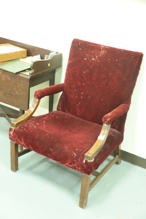 George III mahogany library open armchair on squared legs, 18th century. Provenance: Collection of Anne Jones Willis and the late John Ralph Willis, New Jersey