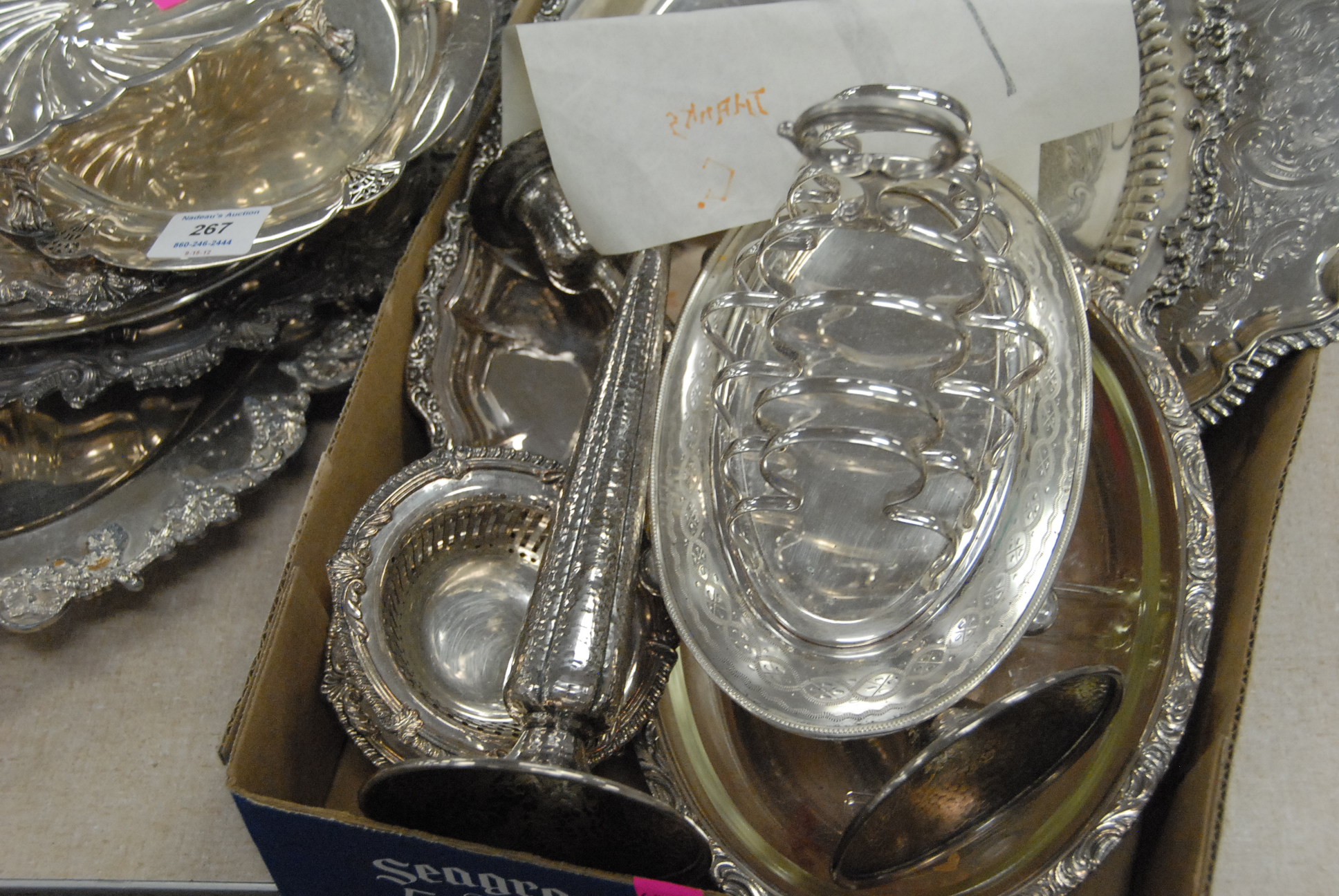 Lot 267: Group lot of silver plated items including toast holder, covered dish, several trays, bowls, candlesticks.