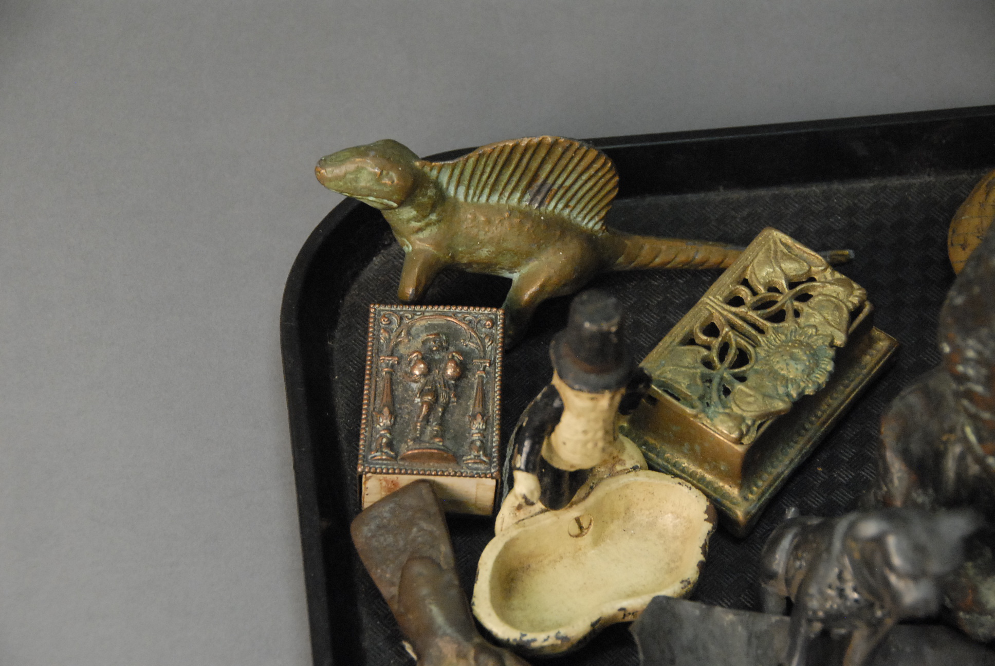 Lot 267: Group of metal and bronze pieces to include souvenir, and fair items, bronze head, pewter dog, boxes, match holders, etc.