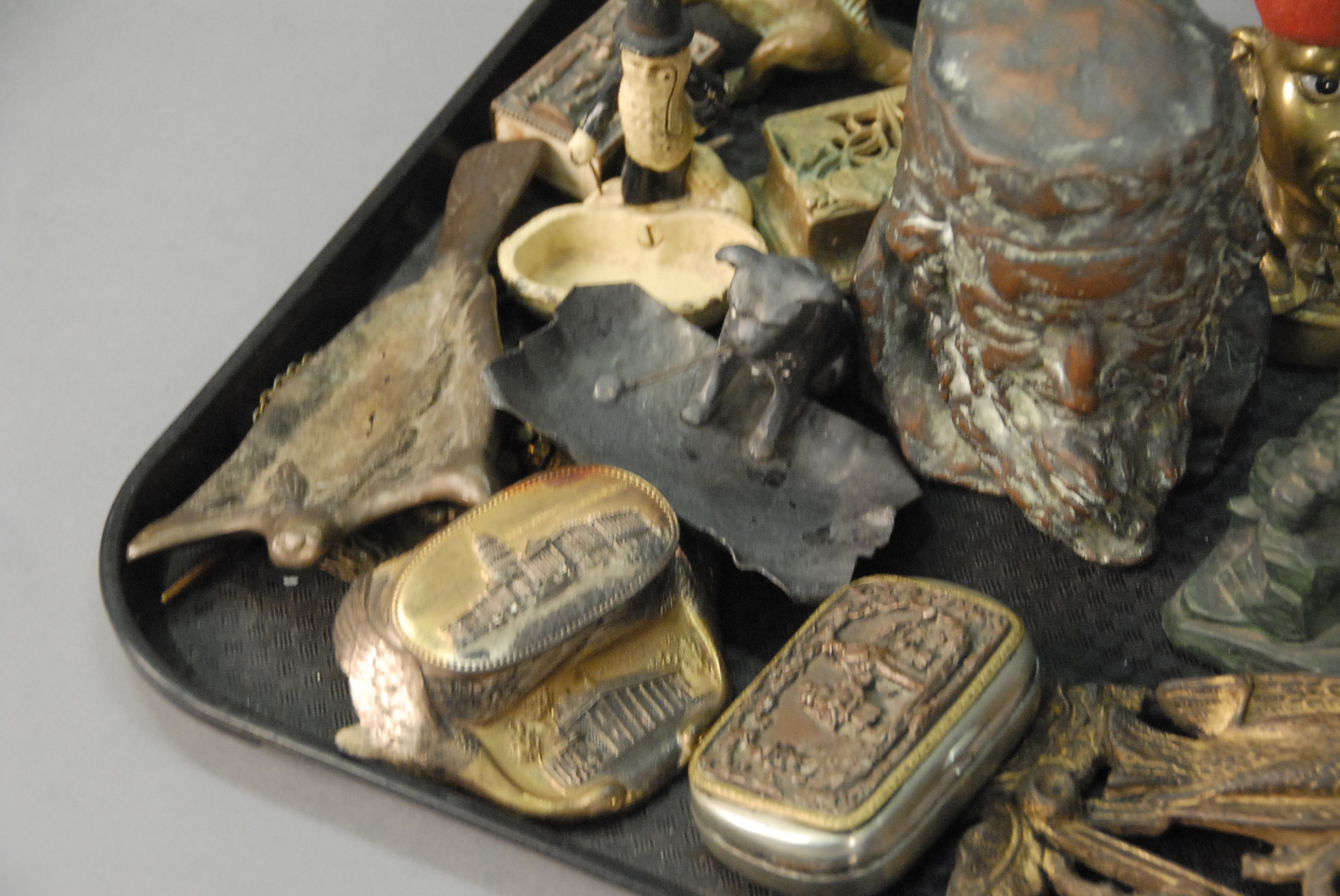 Group of metal and bronze pieces to include souvenir, and fair items, bronze head, pewter dog, boxes, match holders, etc.