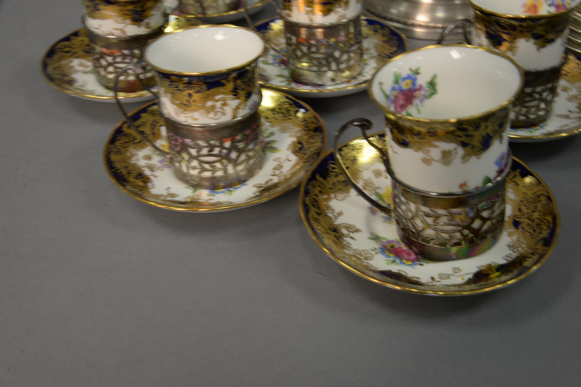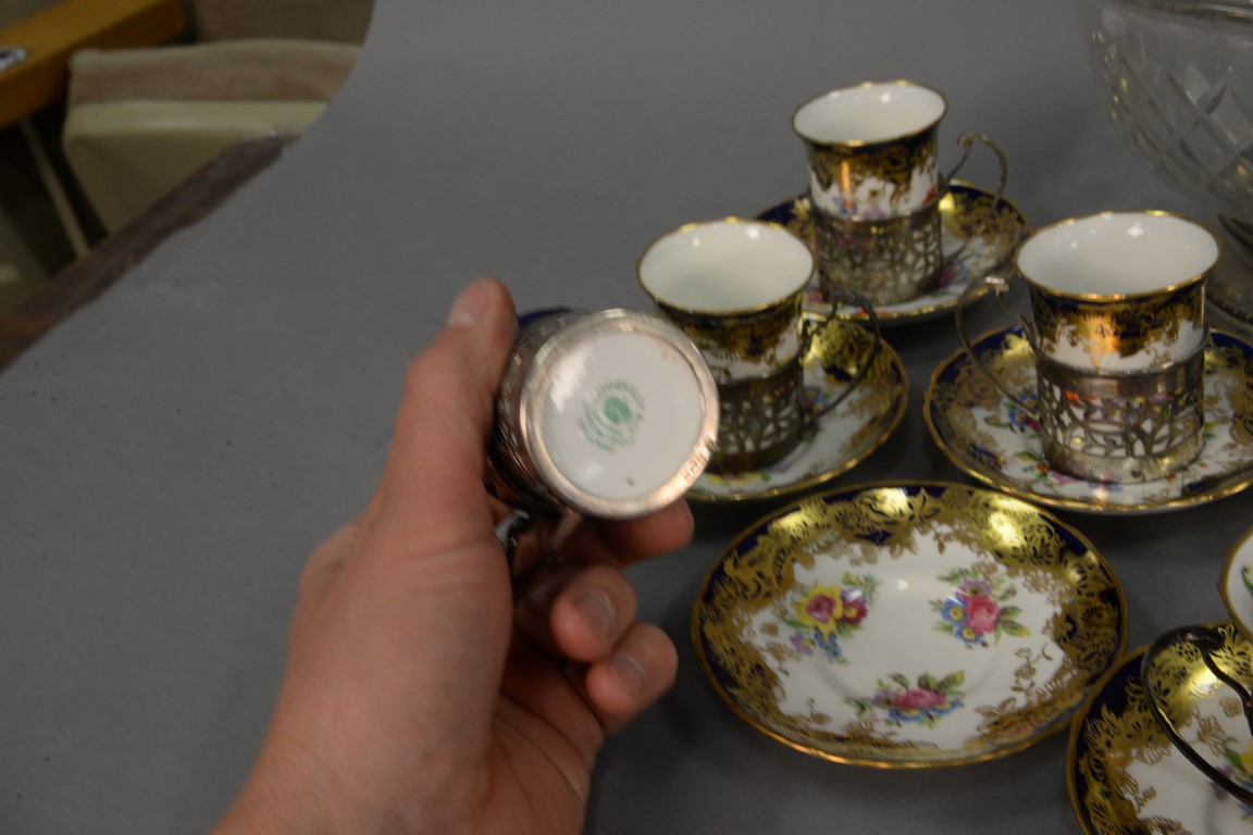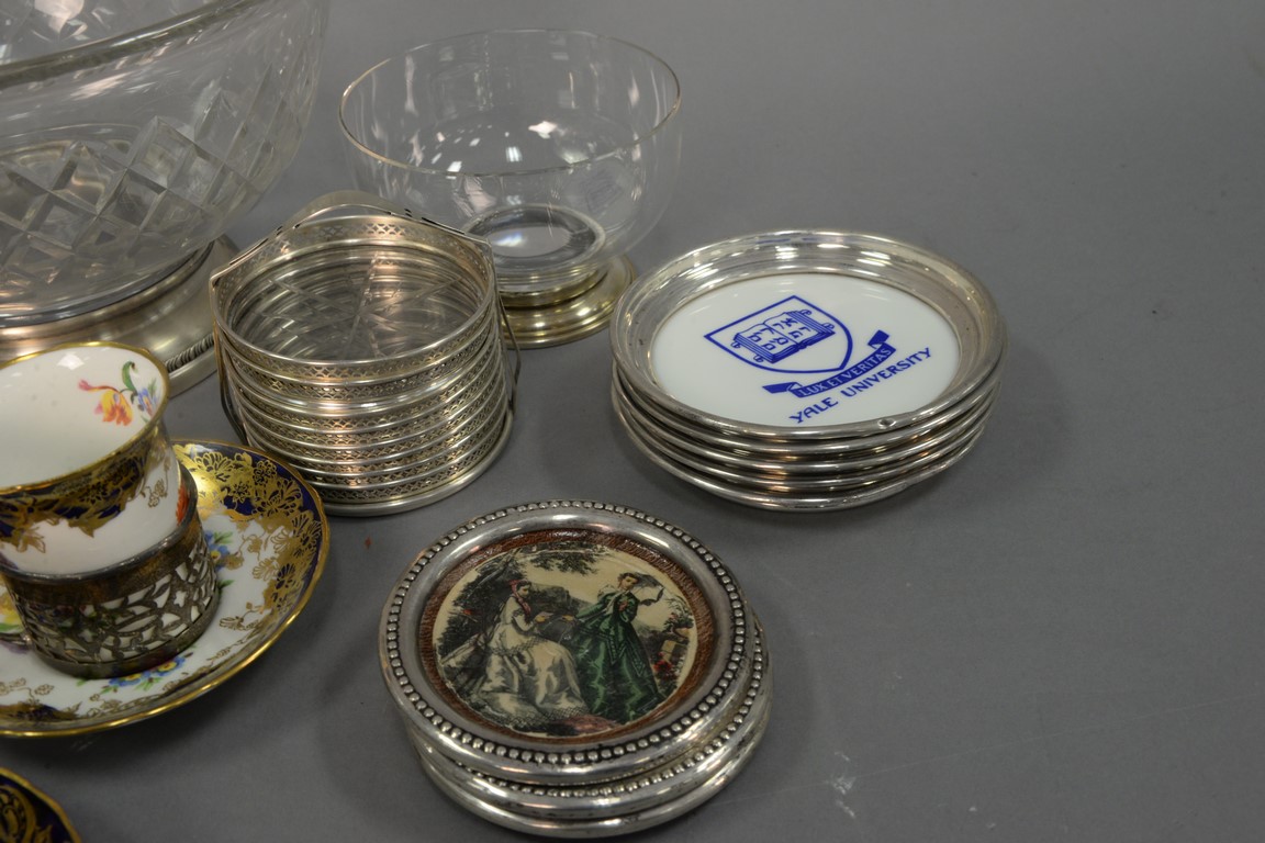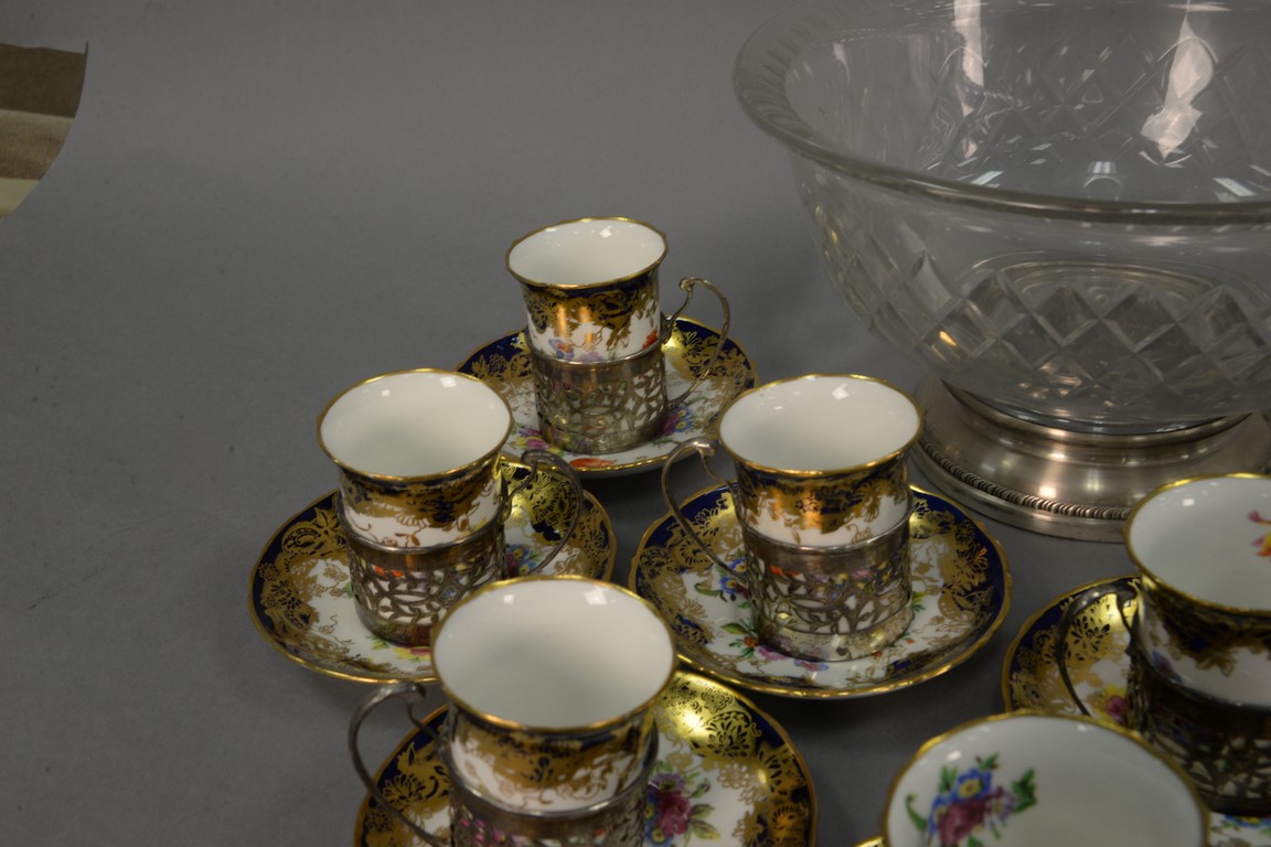 Lot 267: Group of weighted sterling silver to include a sterling footed crystal bowl ht. 5 1/2in., coasters, six demitasse cups and saucers.