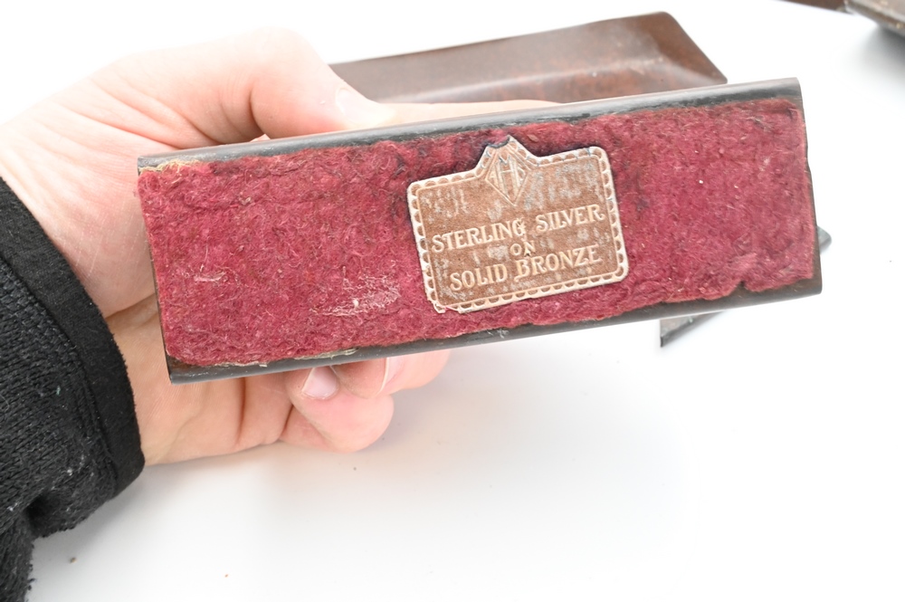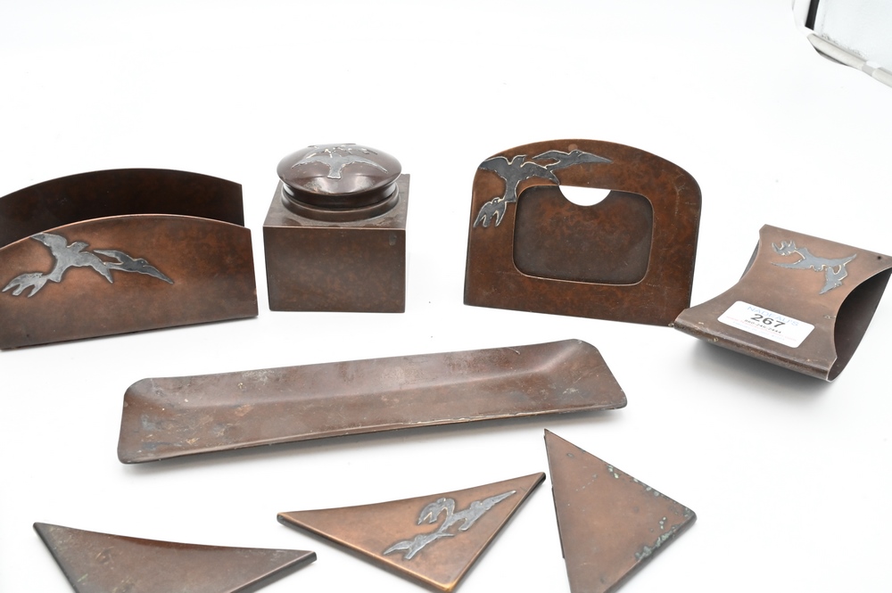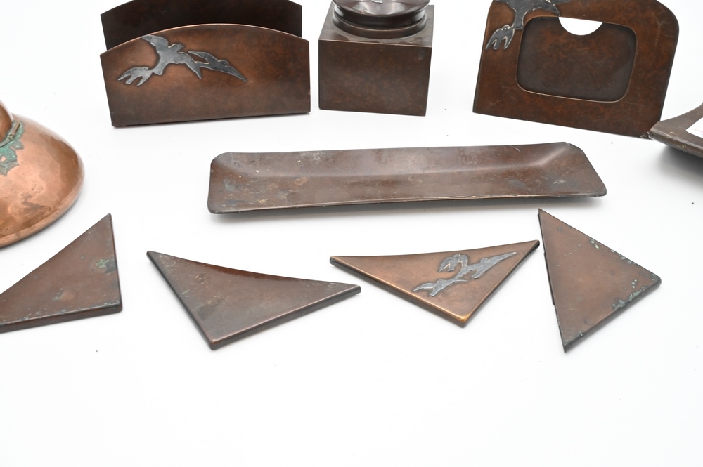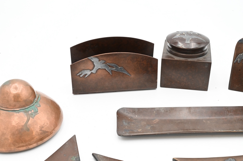 Lot 267: Heinz Arts and Crafts Bronze and Sterling Desk Set, to include calendar frame, envelope holder, blotter ends, copper inkwell, etc, inkwell height 2 3/4 inches.