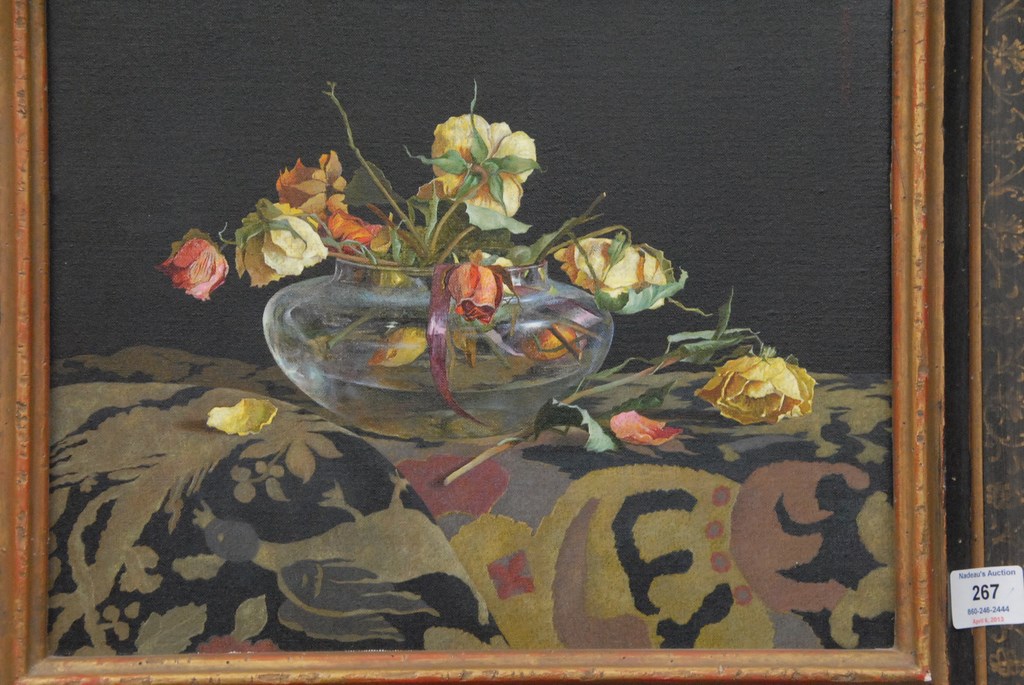 Lot 267: John Bazadona 1948-2000 STILL LIFE WITH ROSES oil on canvas signed upper right Bazadona Cooley Gallery label on reverse 12 x 15