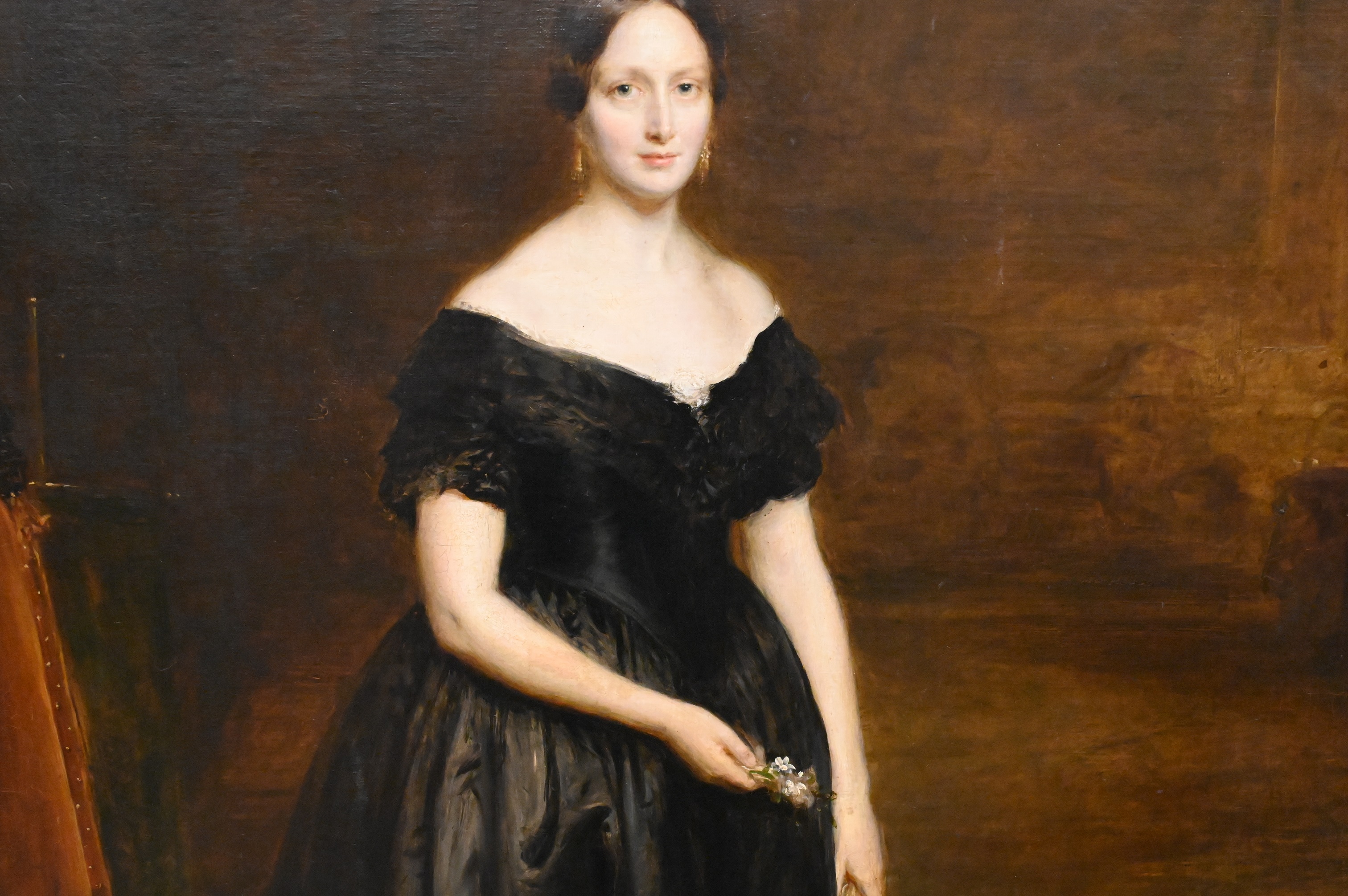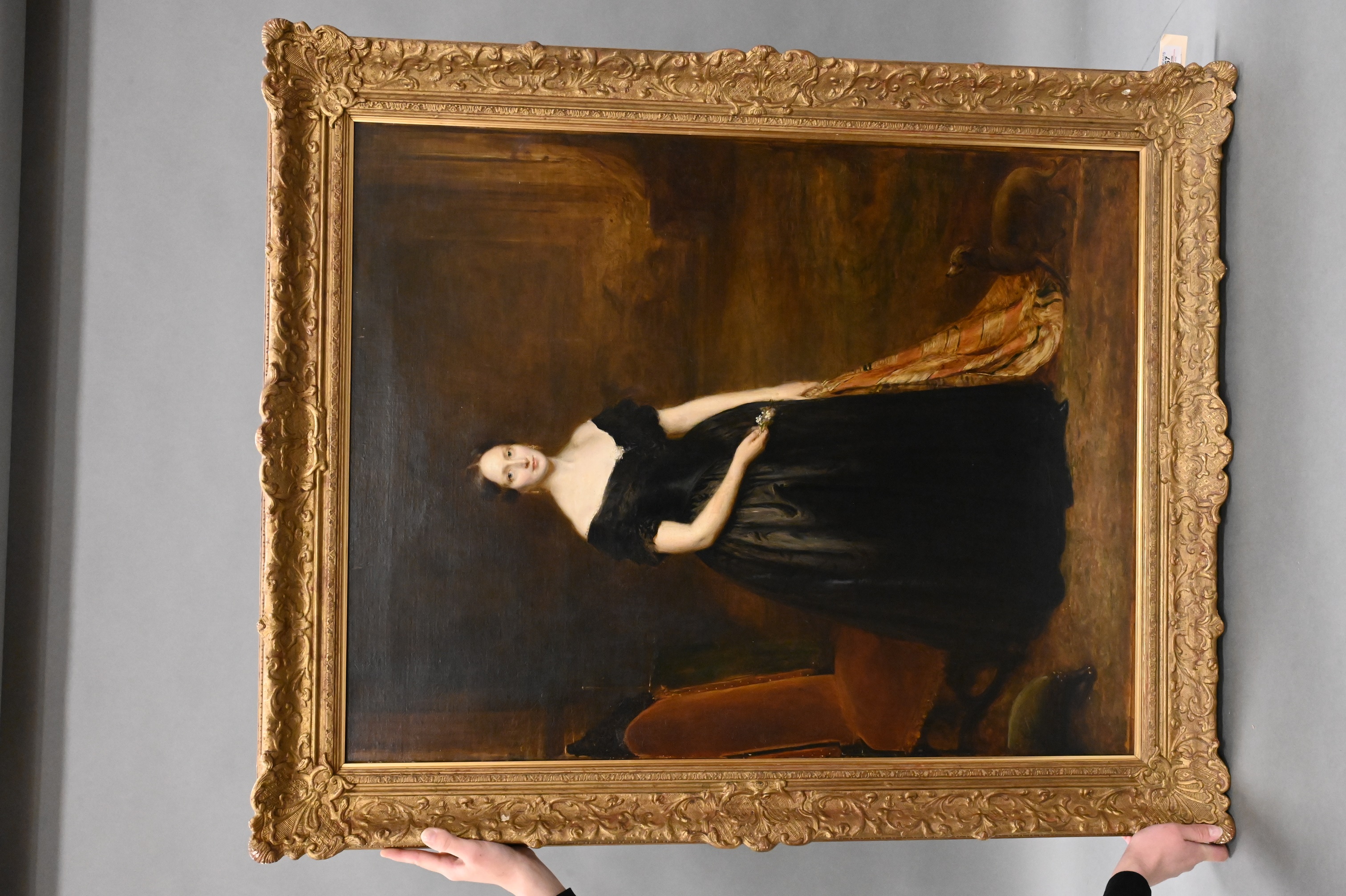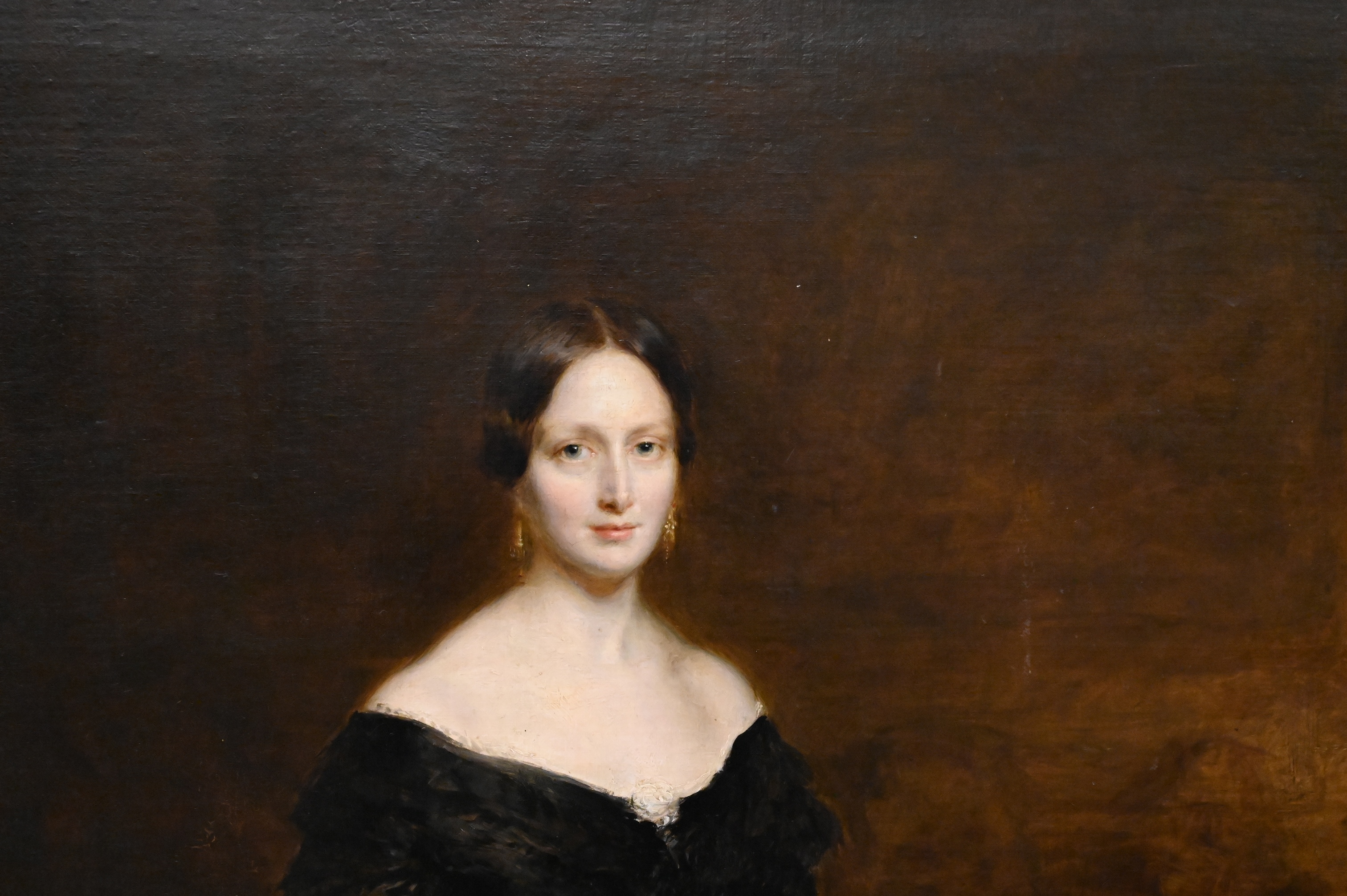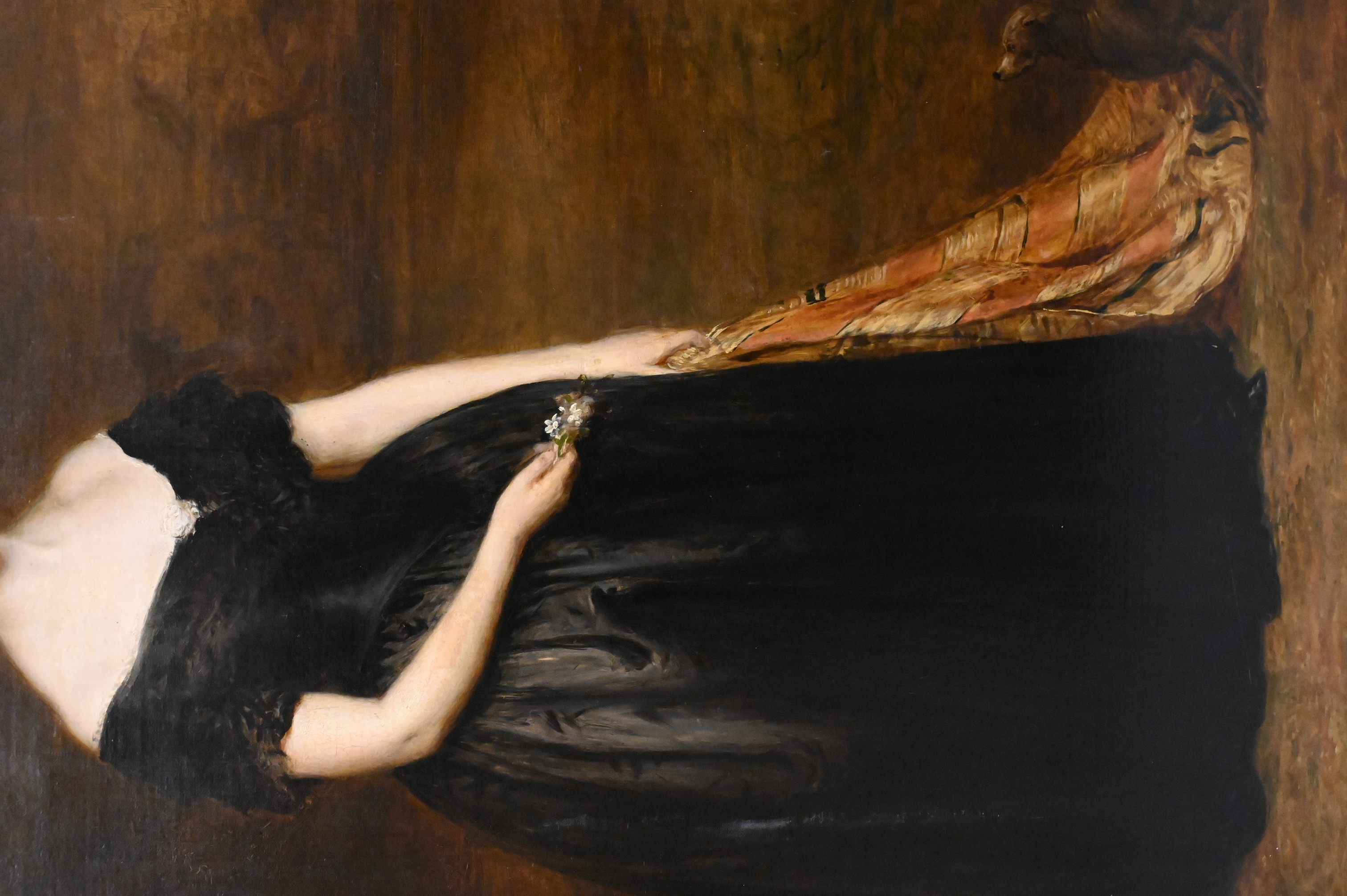 Full length portrait of a lady in a black dress along with her small dog in a parlor
