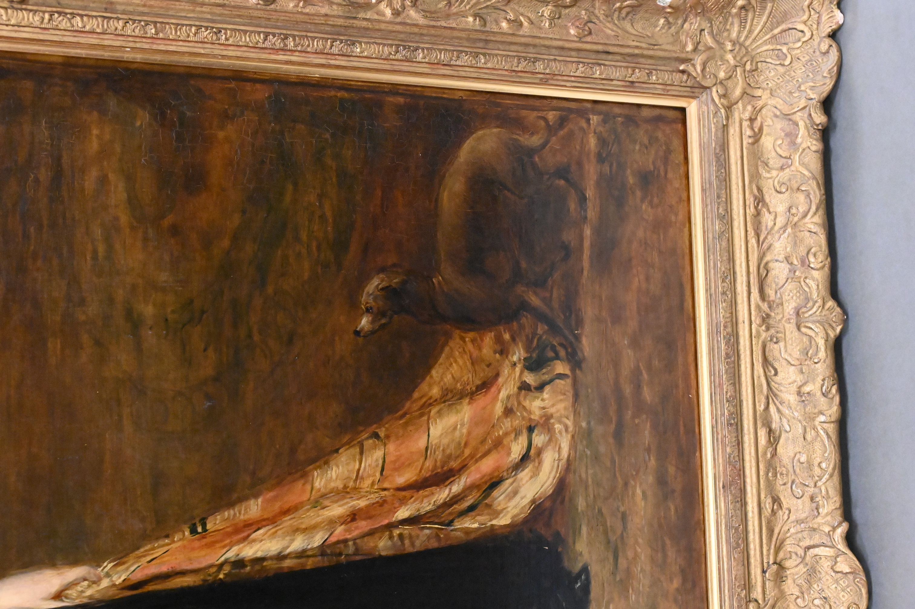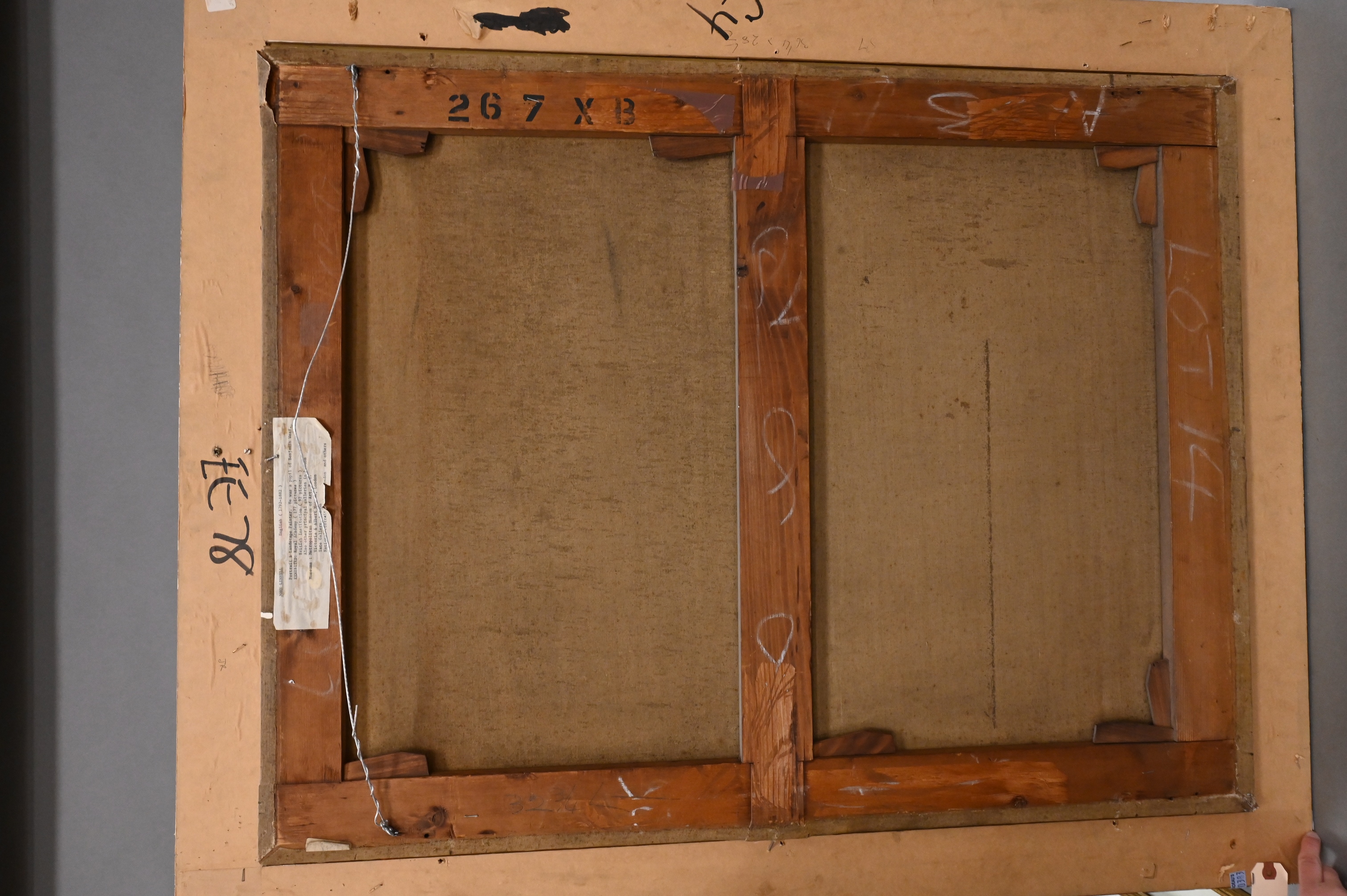 Condition: Restretched relined canvas, edge wear, in painting, craquelure throughout, some paint loss