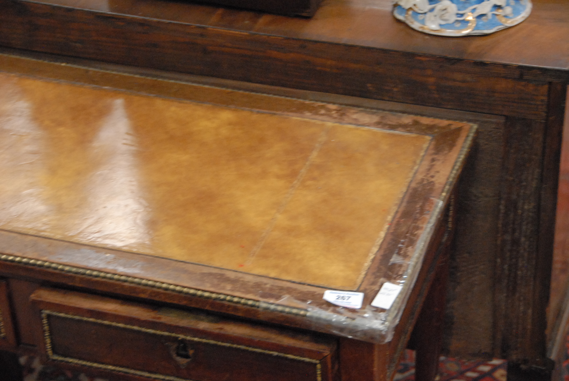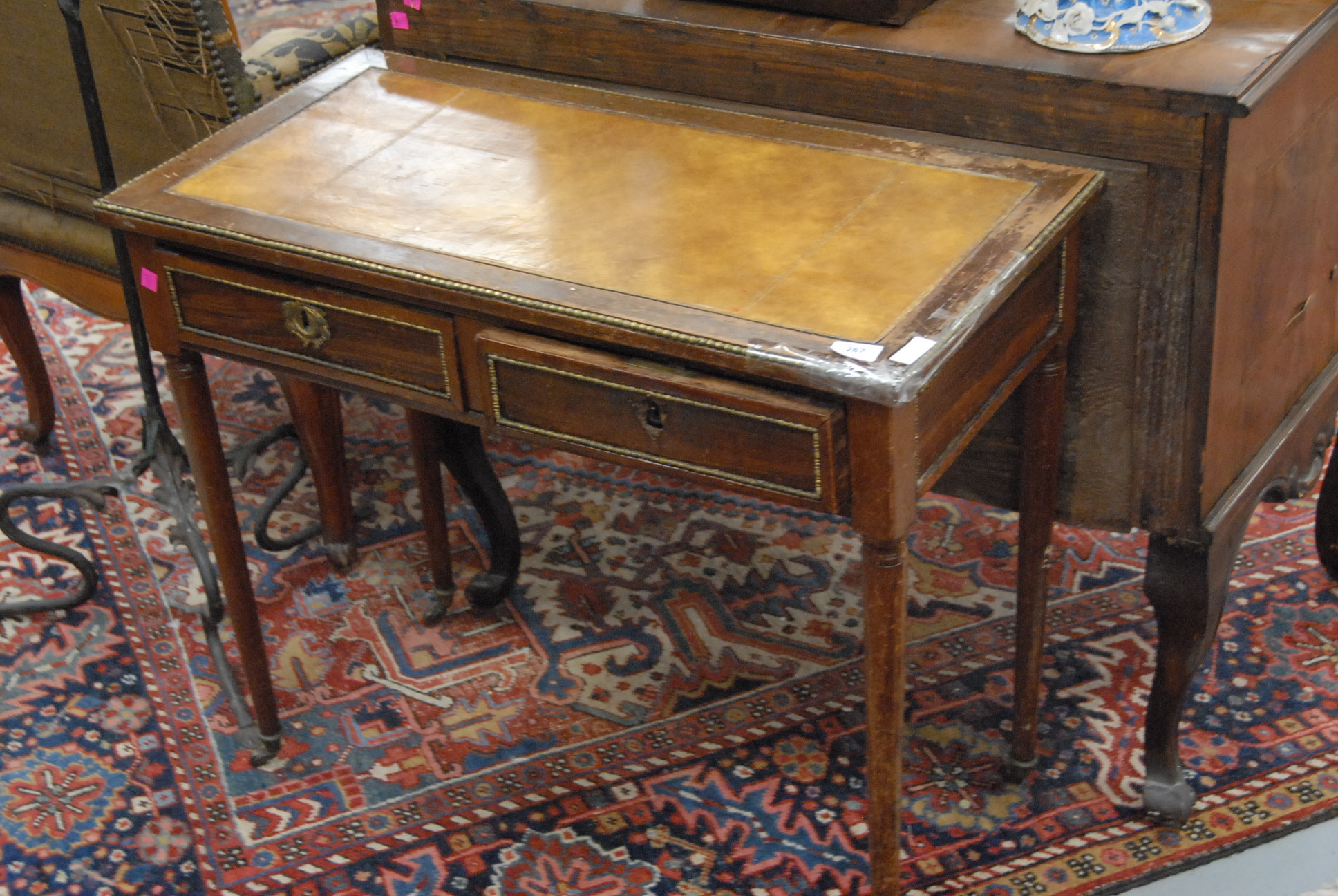 Lot 267: Louis XVI writing table with inset leather top, brass trimmed with two drawers, 19th century. ht. 27in. wd. 32in.