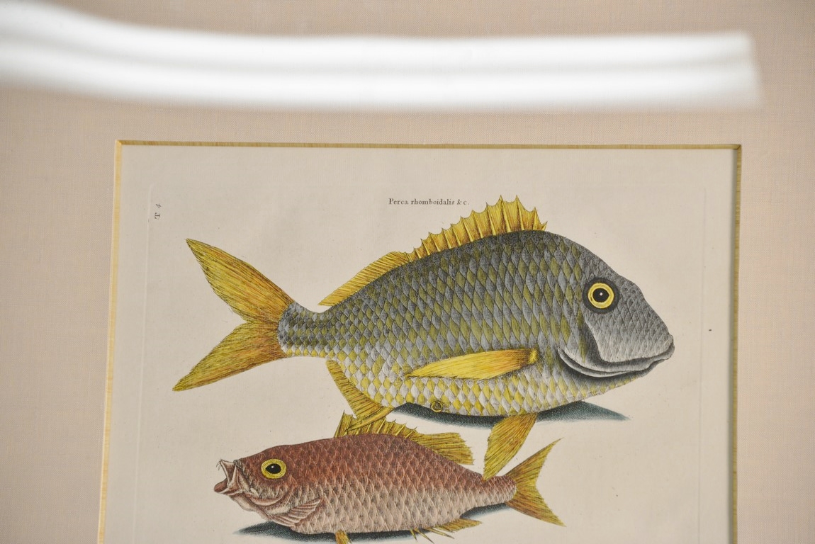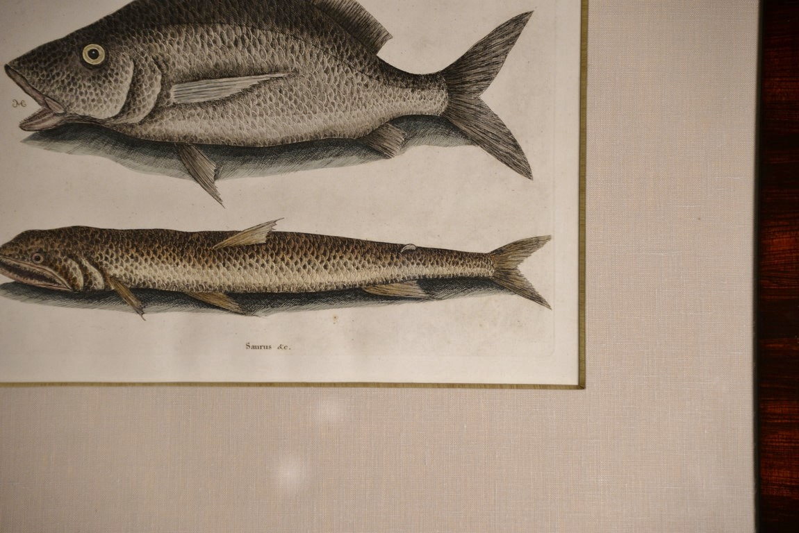 Mark Catesby 1679-1749 pair of hand colored copper plate engravings The Margate-fish Perca, The Sea Sparrow Hawk Saurus Plate #2 and The Pork Fish Perca Rhomboidalis The Schoolmaste Perca Plunis Plate # 4 From The Natural History of Carolina, Florida and the Bahama Islands framed by W. Graham Arader III sight size: 11 1/2 x 15 Provenance: Property from Credit Suisse’s Americana Collection