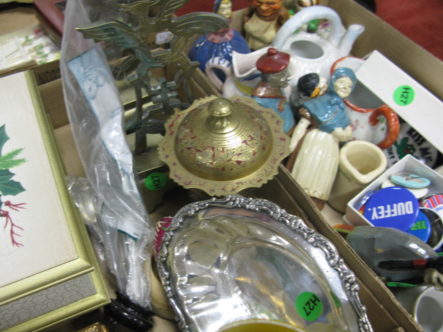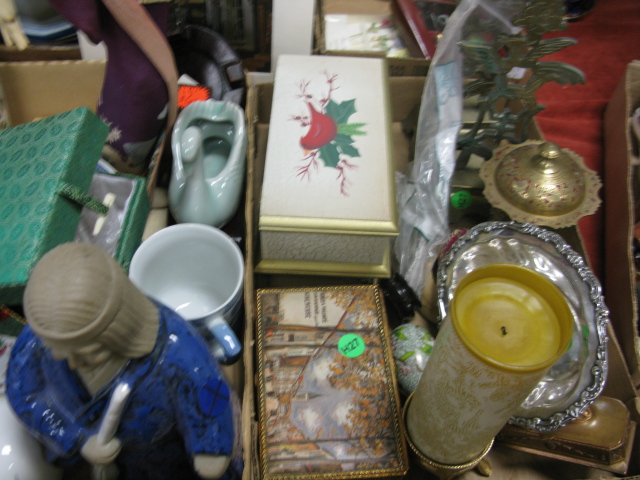 Seven box lots china, glassware, curios, 2 blue and white jars, book ends, unframed prints, Oriental doll, slop bucket and misc.