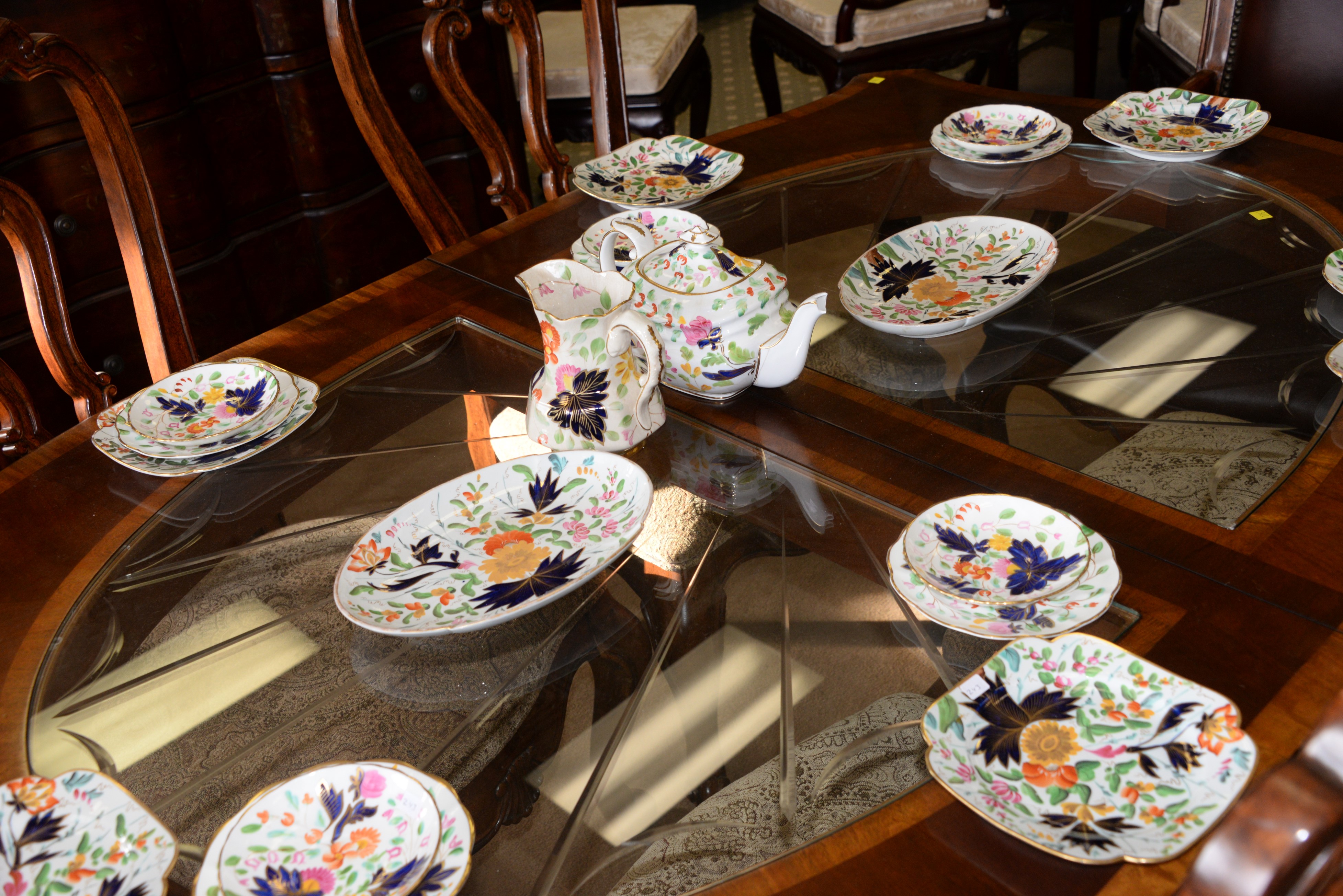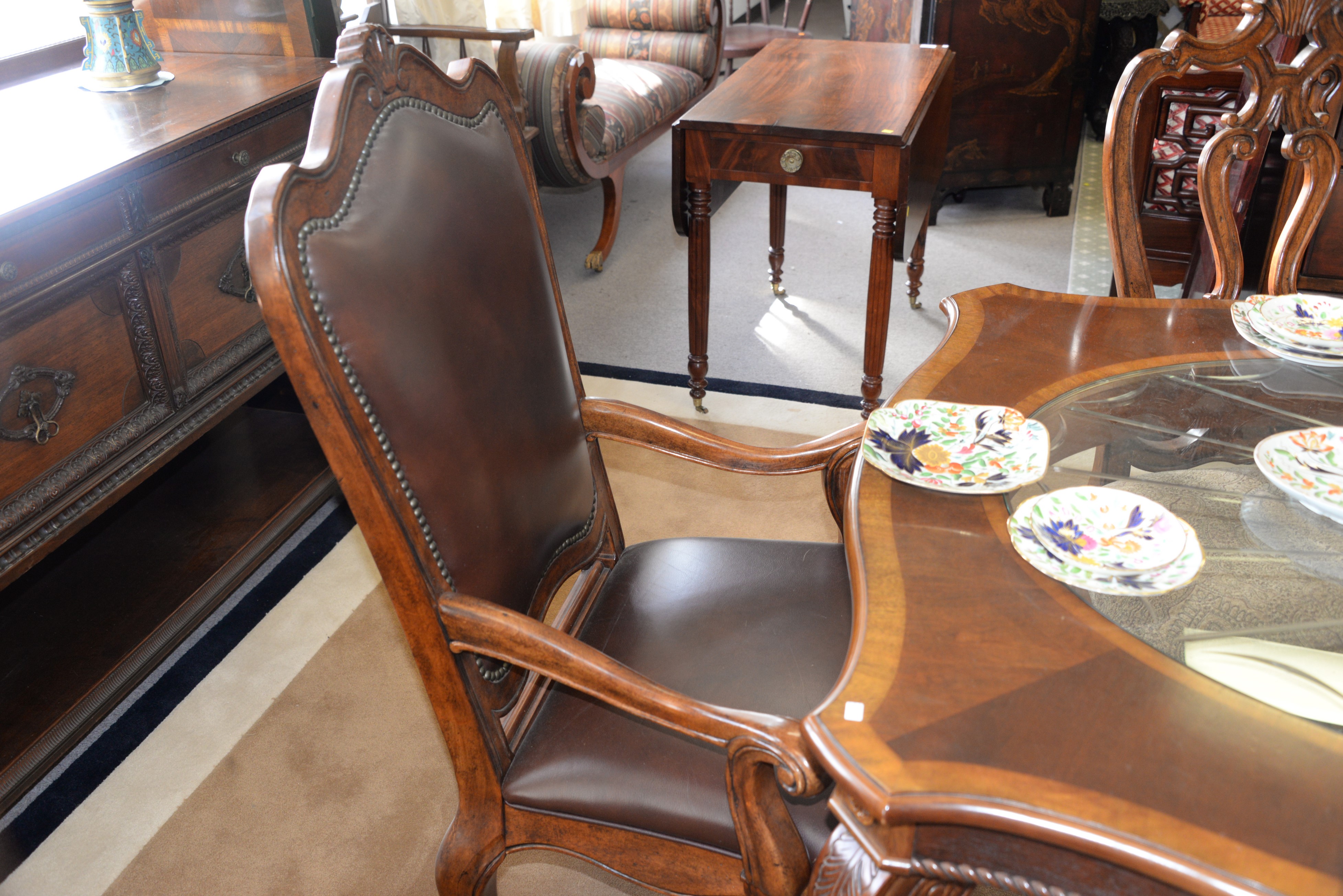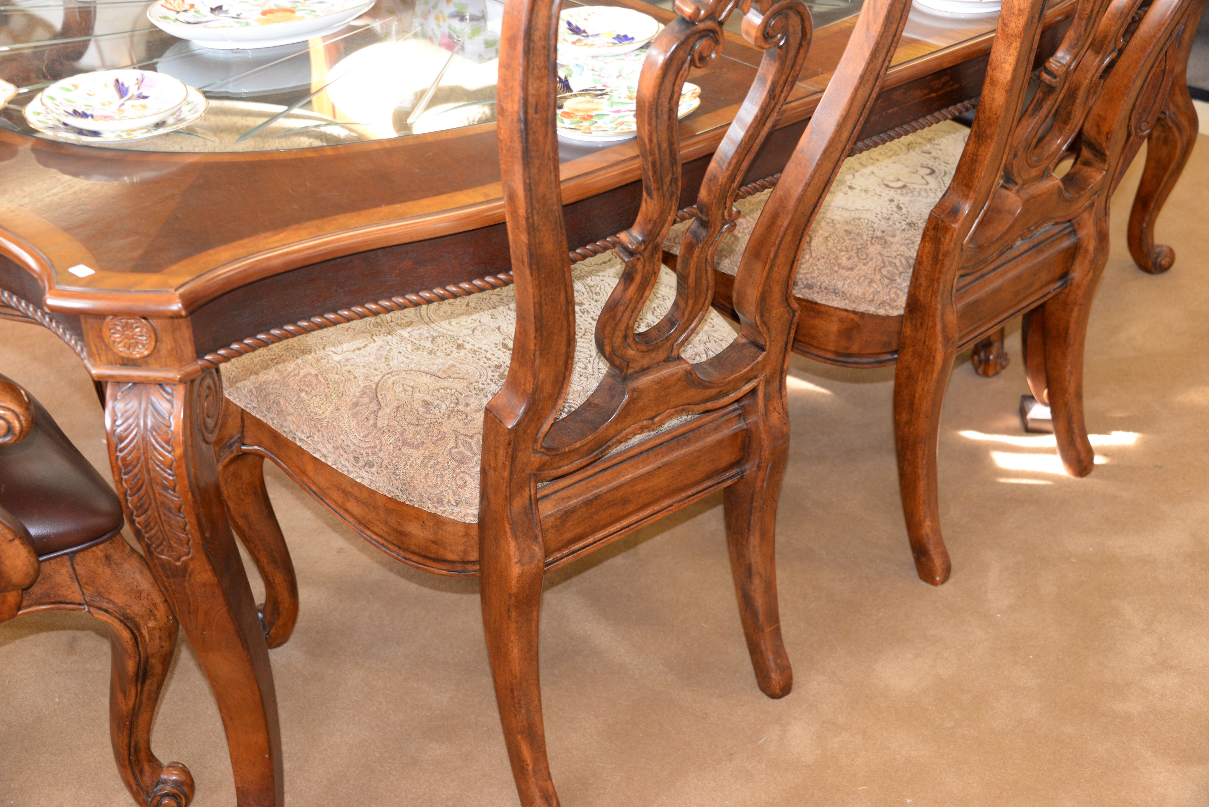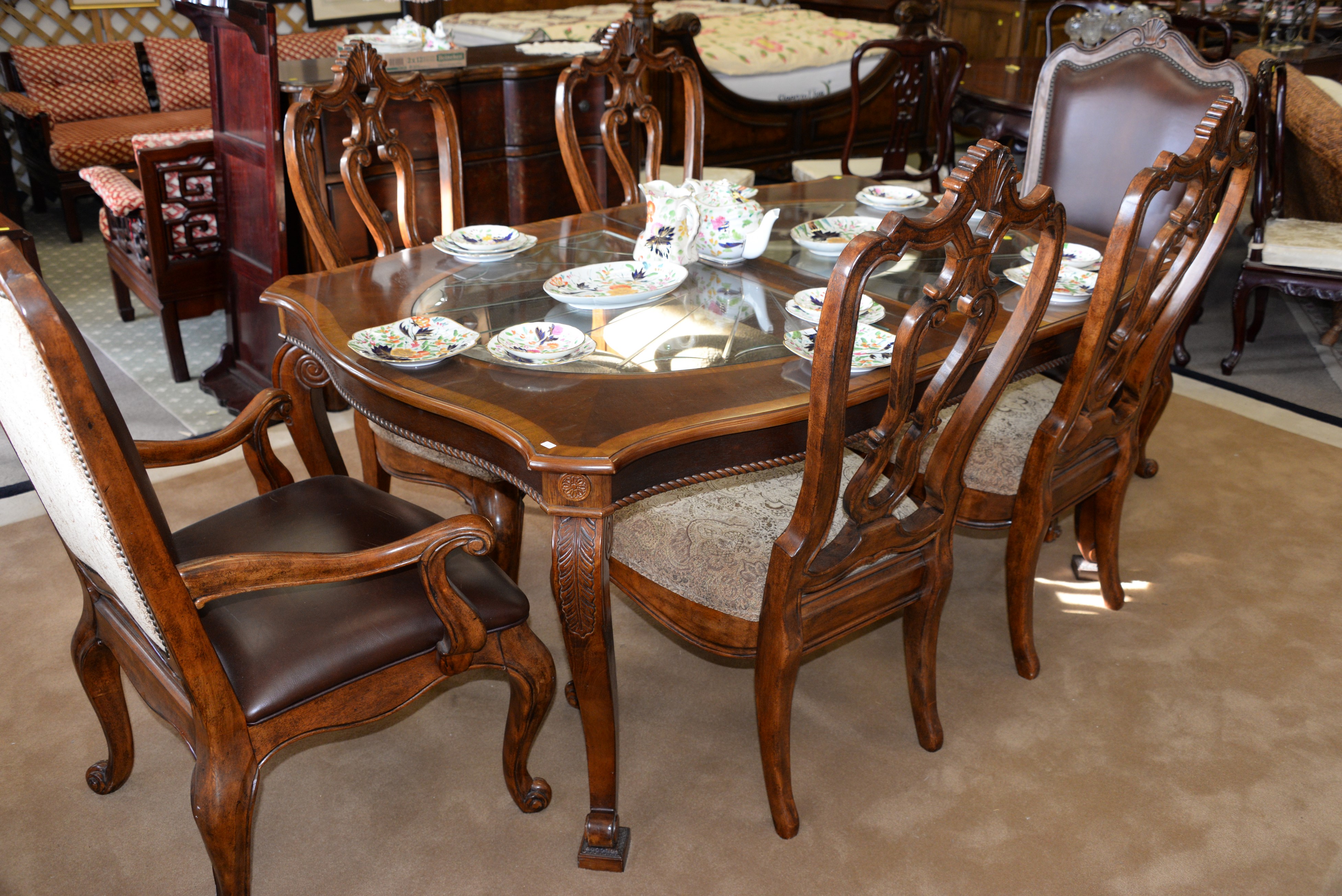 Lot 267: Seven piece contemporary dining set with glass inserts and two leaves along with a contemporary armchair. ht. 30 in. top: 44 x 67