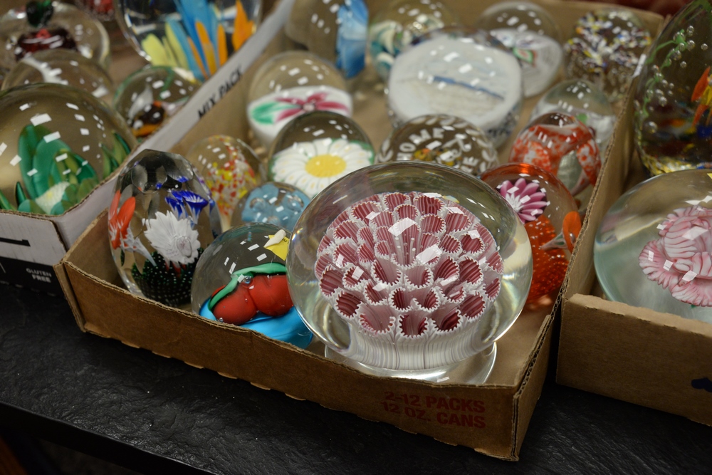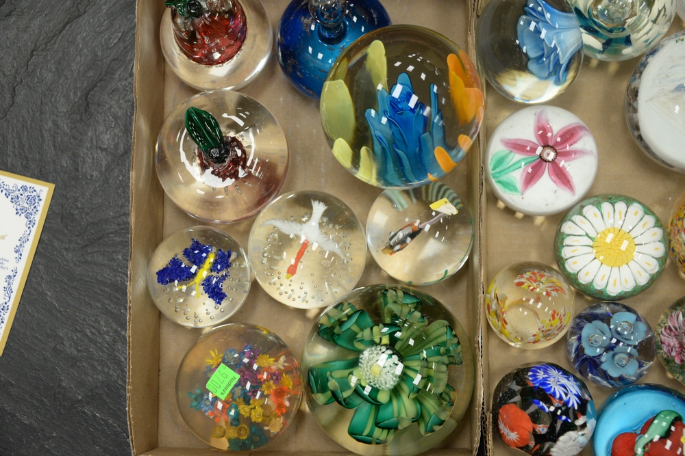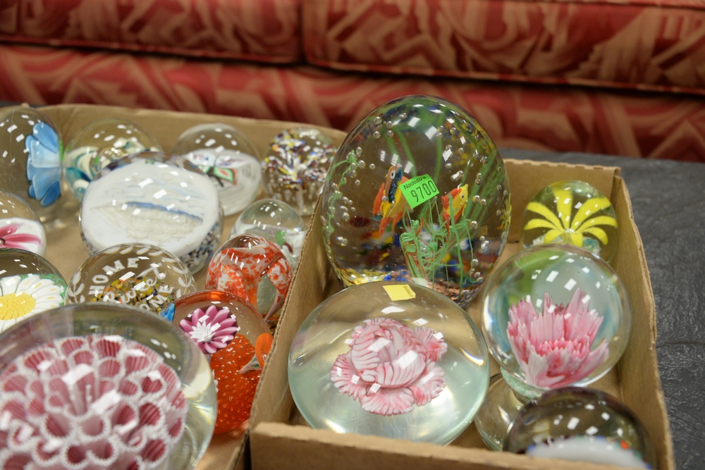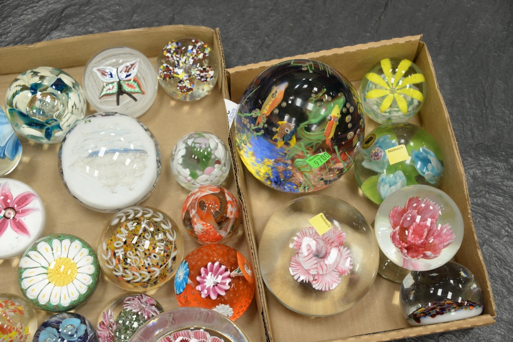 Three Box Lots of Glass Paperweights, to include three oversized examples, two having Fornasa de Murano labels, most not marked. Provenance: Estate of James Wadhams.