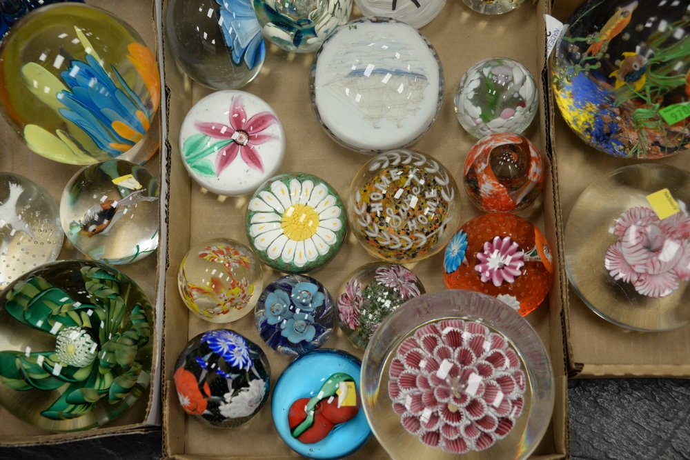 Lot 267: Three Box Lots of Glass Paperweights, to include three oversized examples, two having Fornasa de Murano labels, most not marked. Pro…