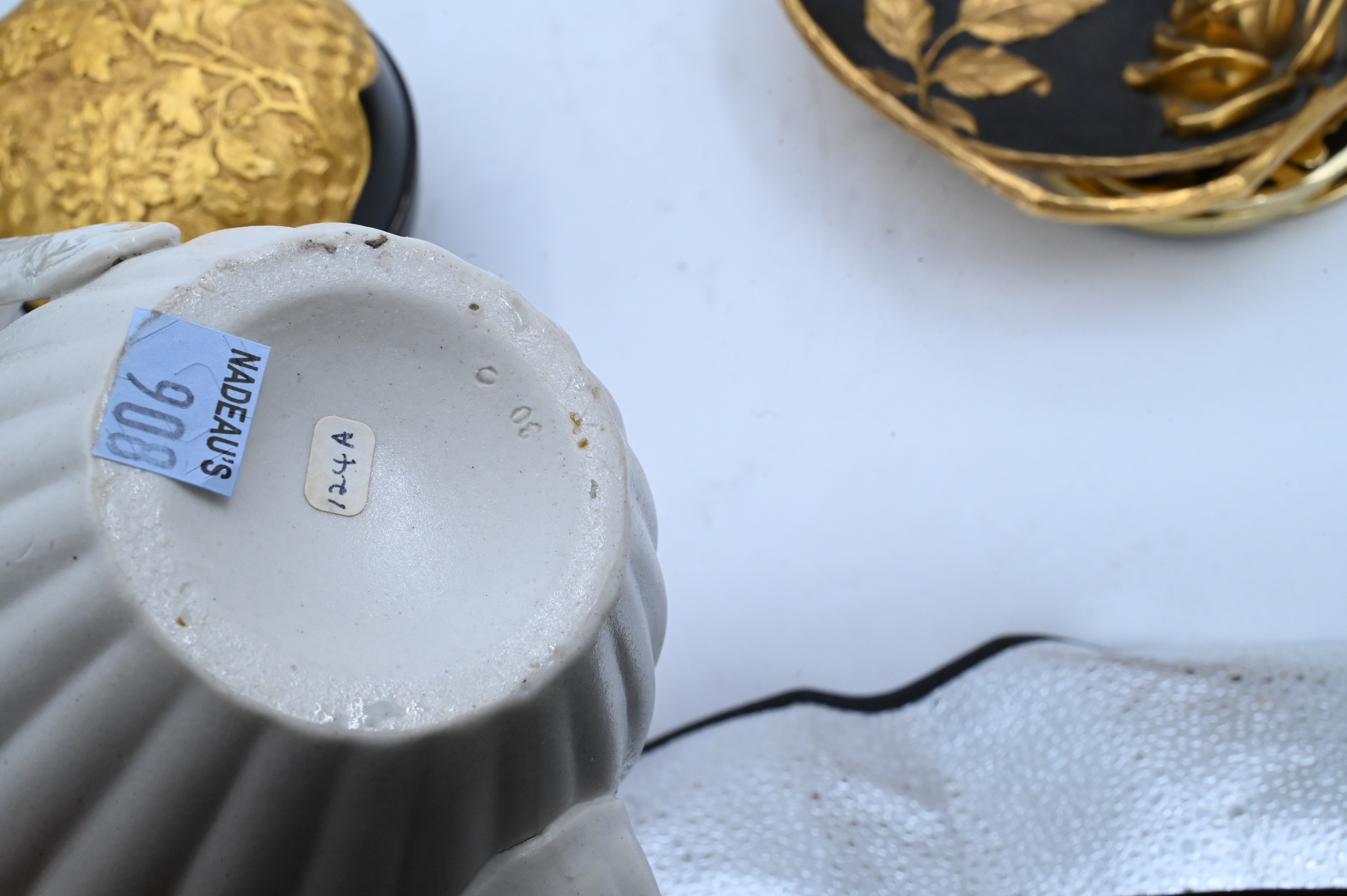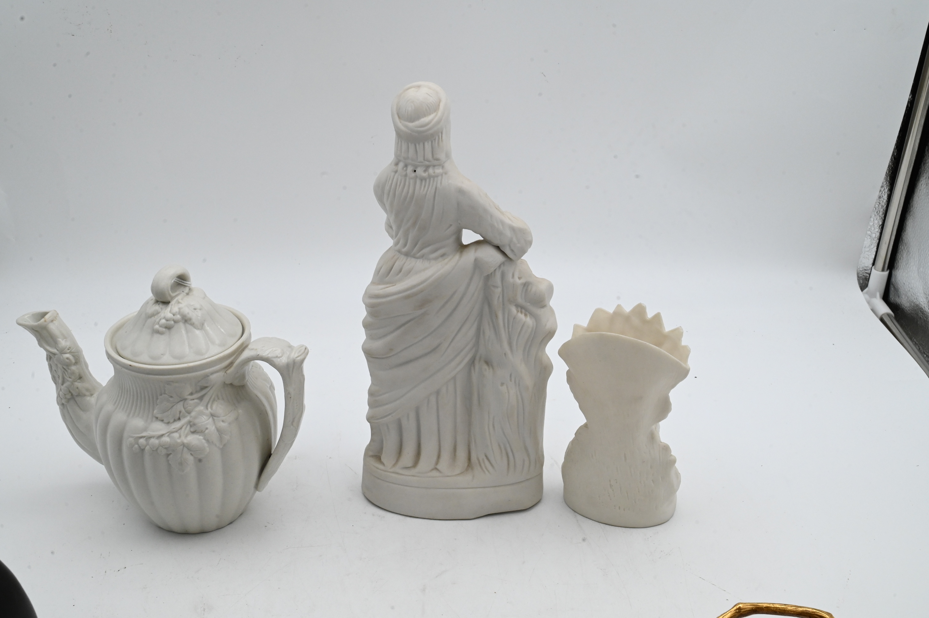 female Biblical figure of Ruth harvesting wheat, small spill vase with hunter and dog, along with fluted teapot having grape vine motif, 19th century