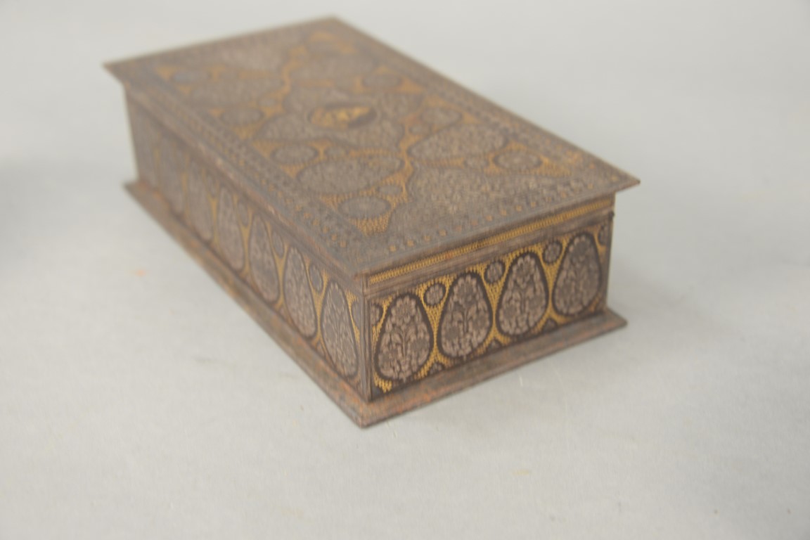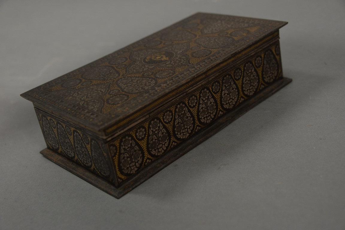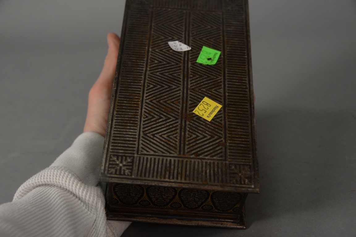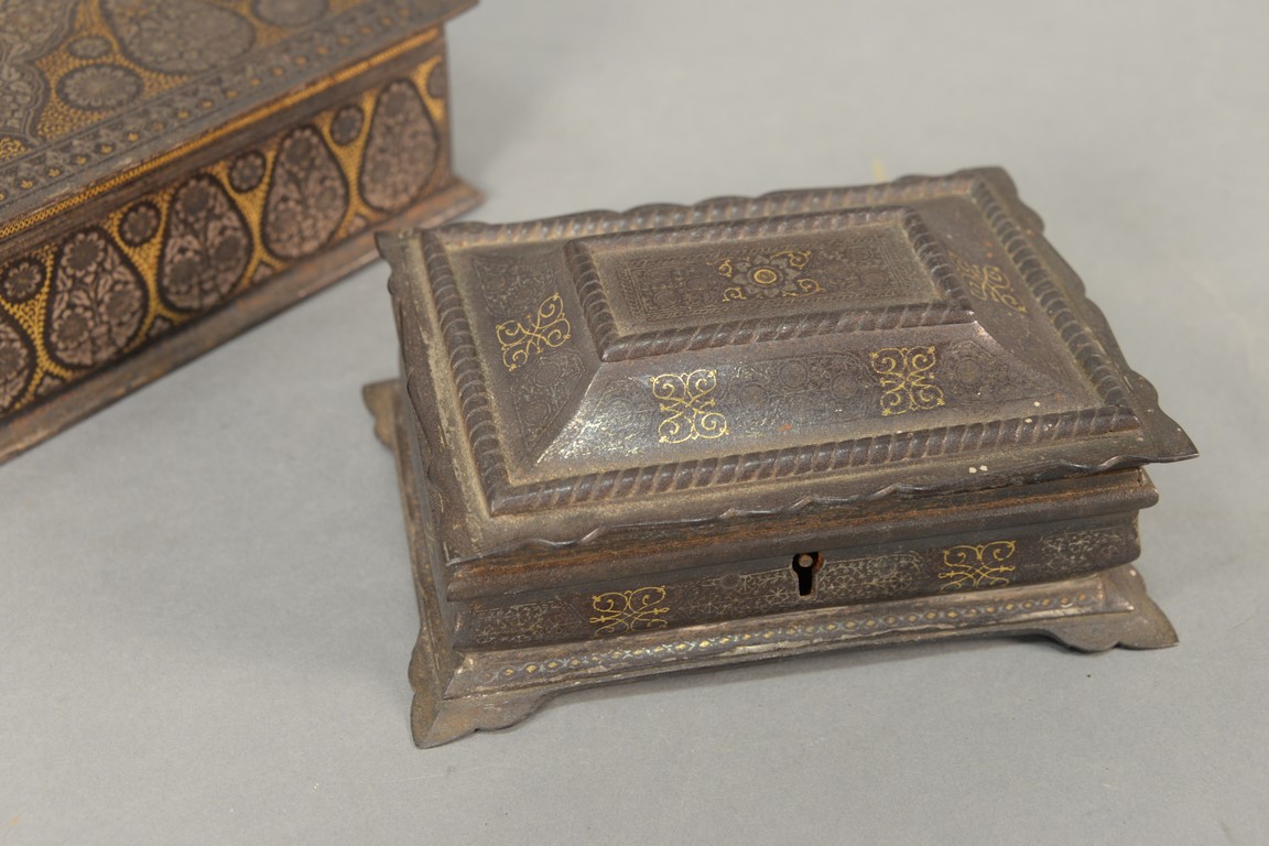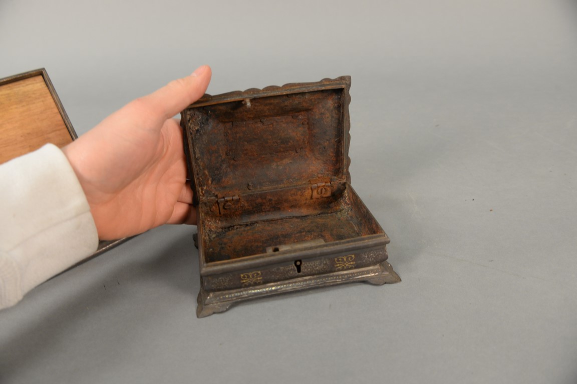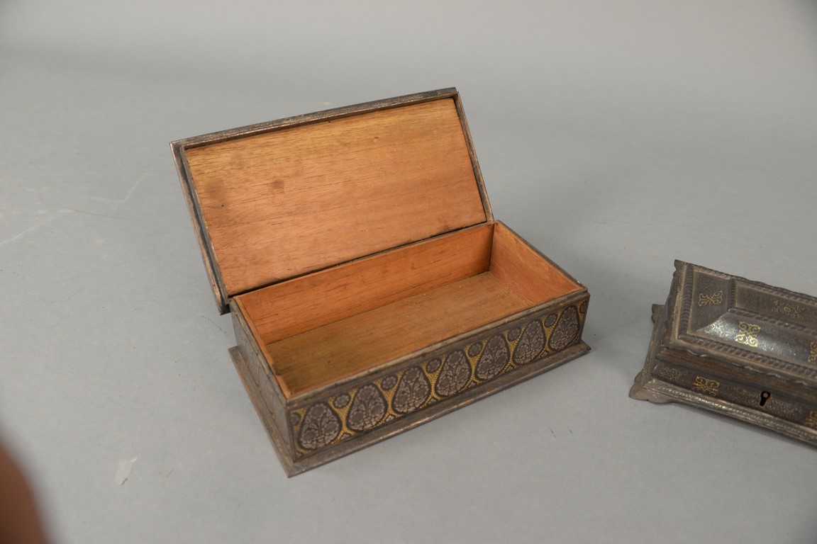 Lot 267: Two metal hinged covered mixed metal boxes including a box with silver and gold inlays having wood interior and crown and cannon on …