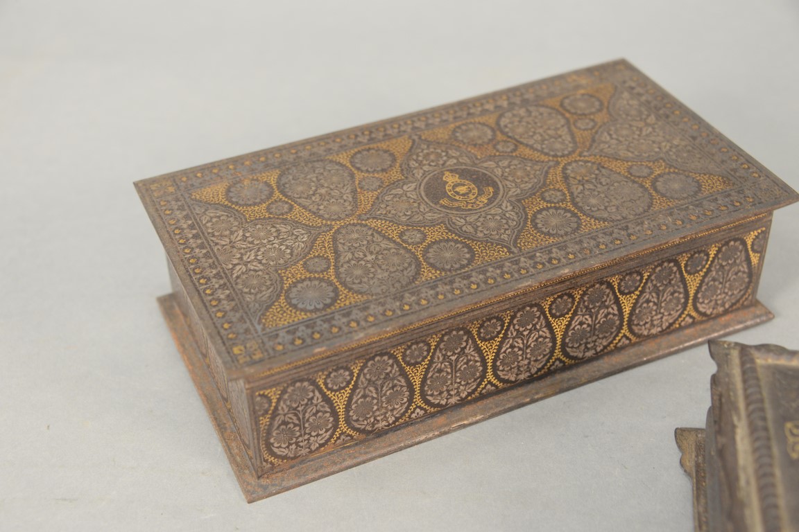 Two metal hinged covered mixed metal boxes including a box with silver and gold inlays having wood interior and crown and cannon on cover marked Mountain Battery 31st and the other jewelry box with key lock top having brass and silver inlays.