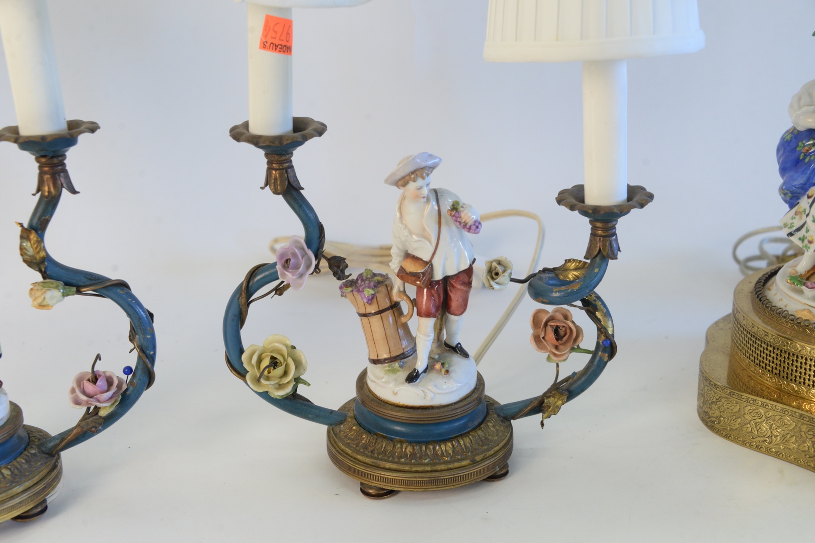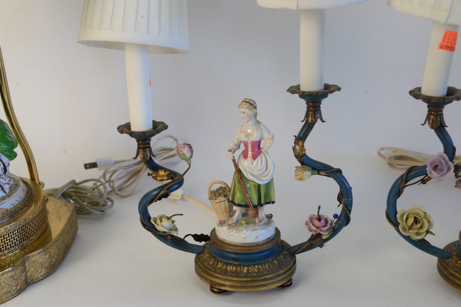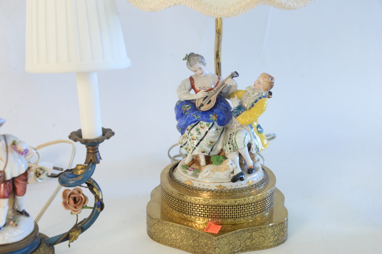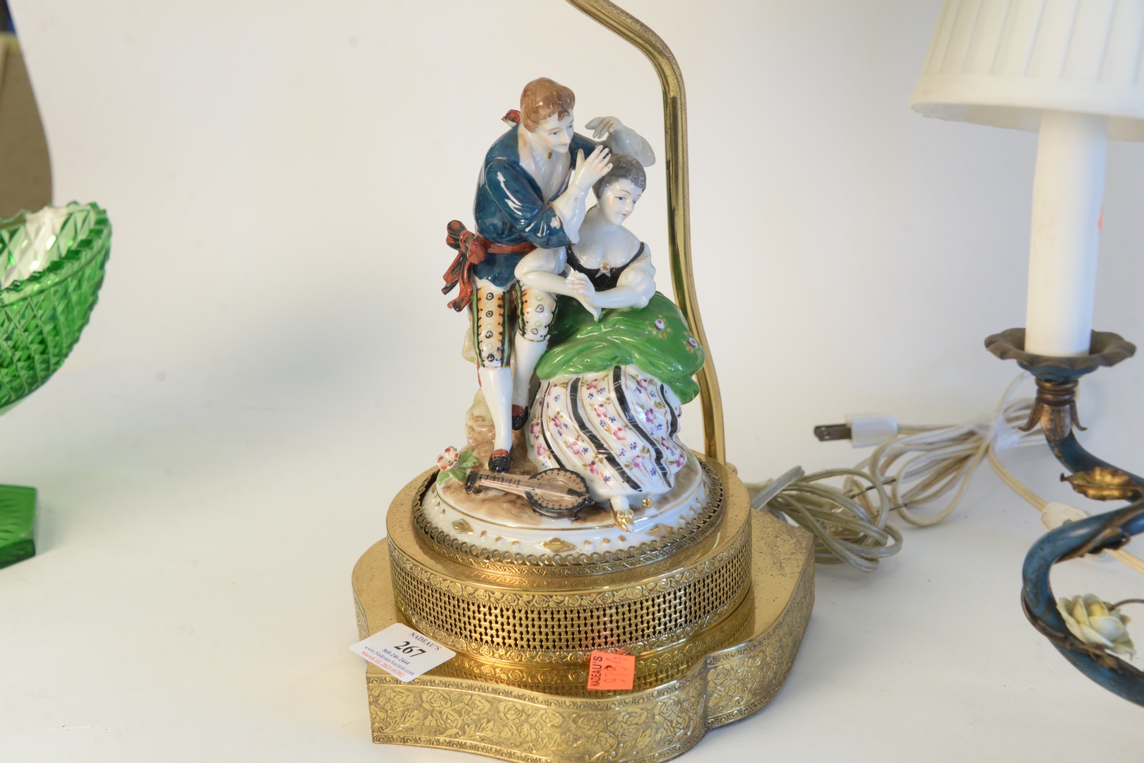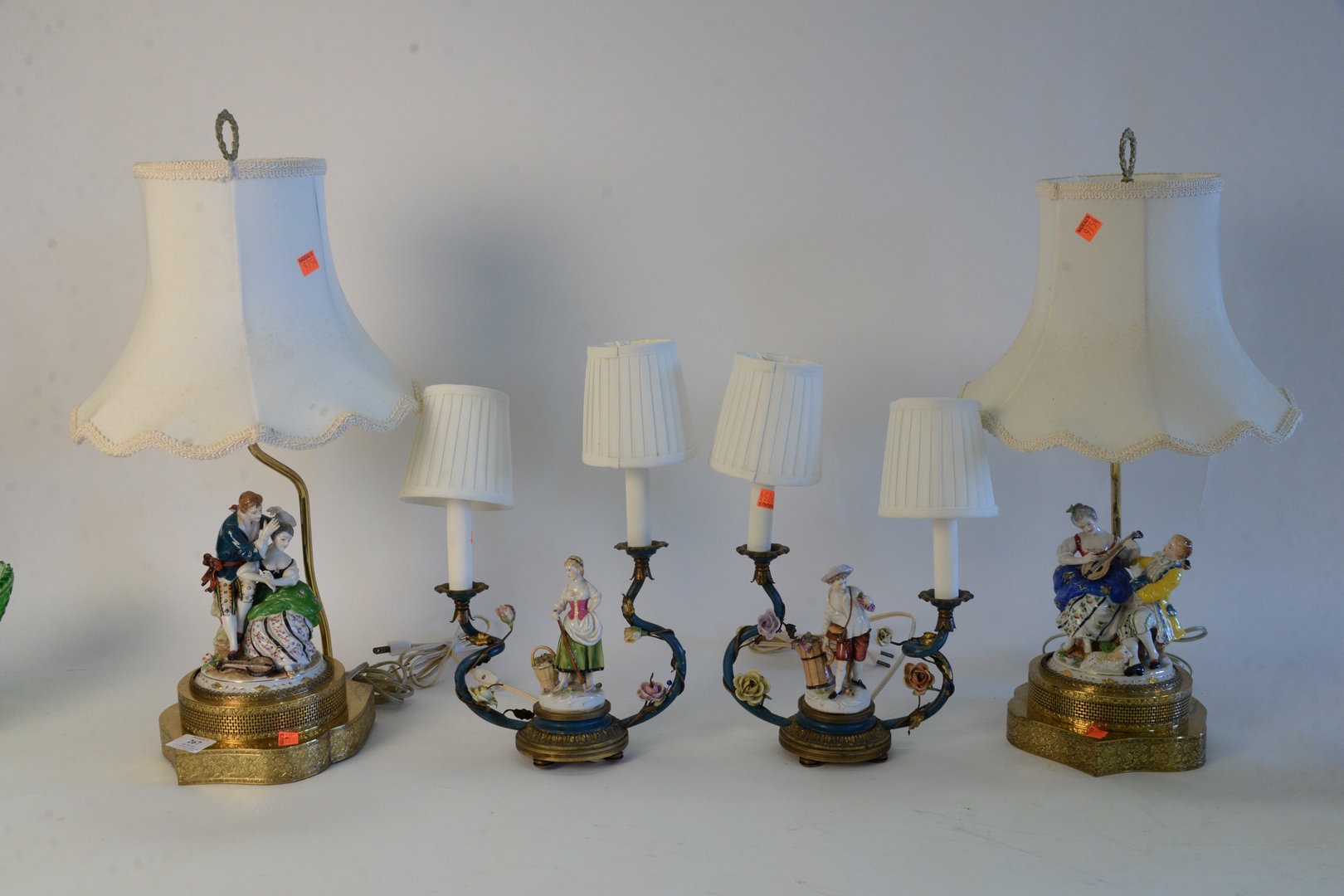 Lot 267: Two Pairs of Figural Table Lamps, to include pair of German porcelain figural lamps, on pierced brass bases, not marked, height 23 i…