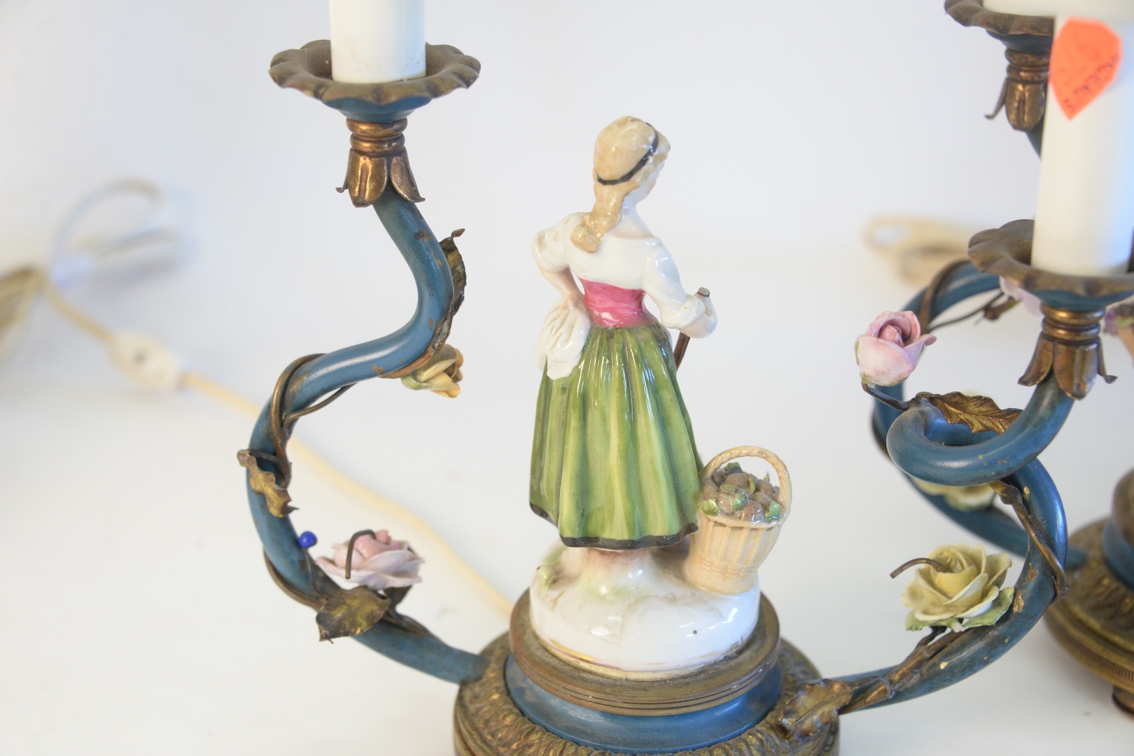 Two Pairs of Figural Table Lamps, to include pair of German porcelain figural lamps, on pierced brass bases, not marked, height 23 inches along with 19th Century German porcelain figures with two lights each, height 14 1/2 inches.