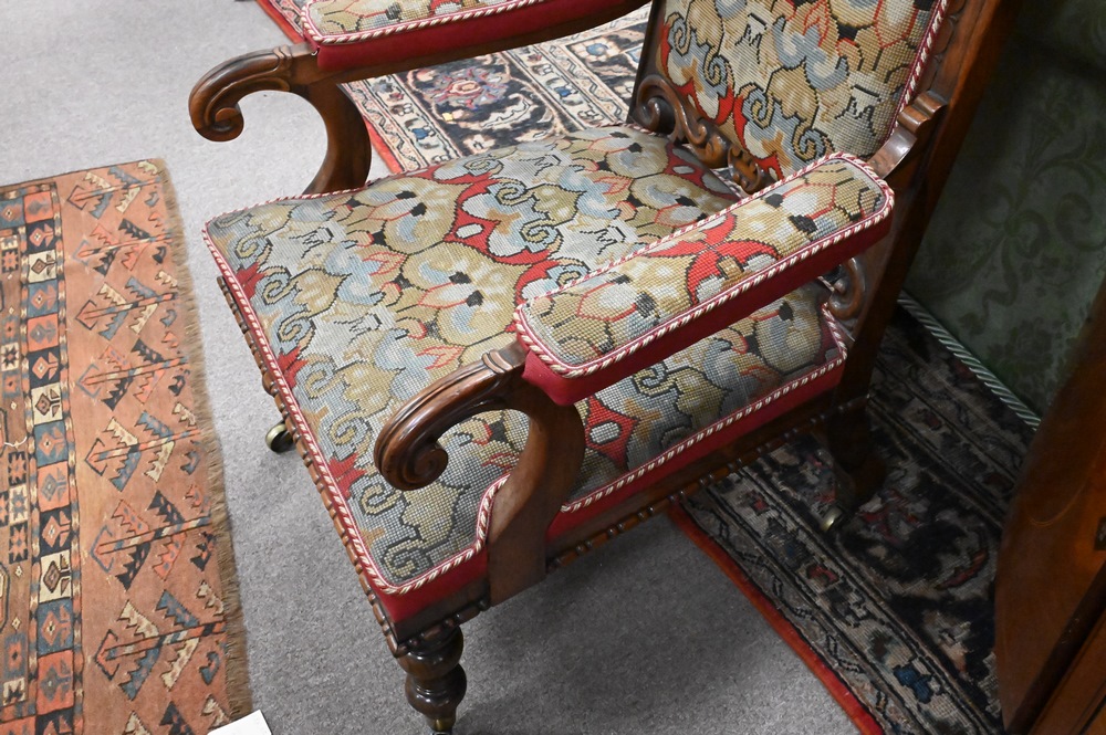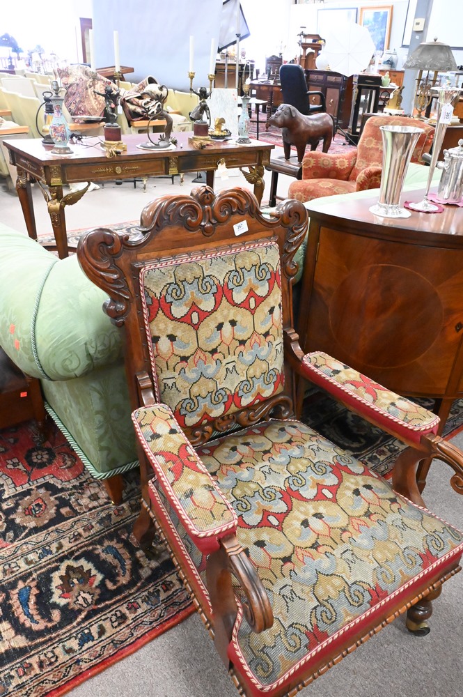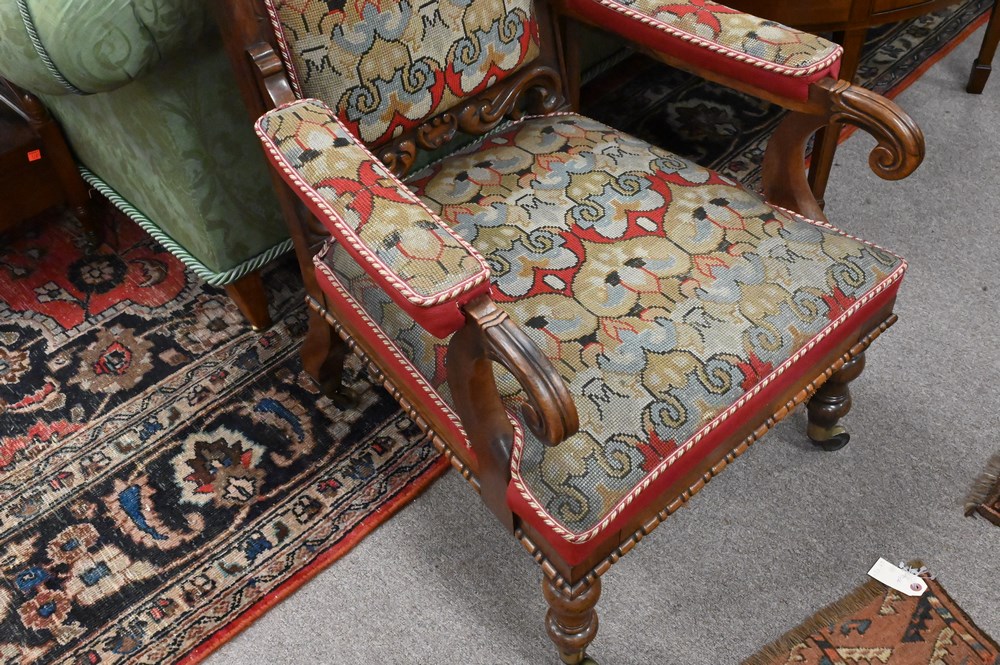 Victorian Rosewood Armchair, having carved frame and needlepoint upholstery on brass wheels, height 40 inches, width 23 inches.
