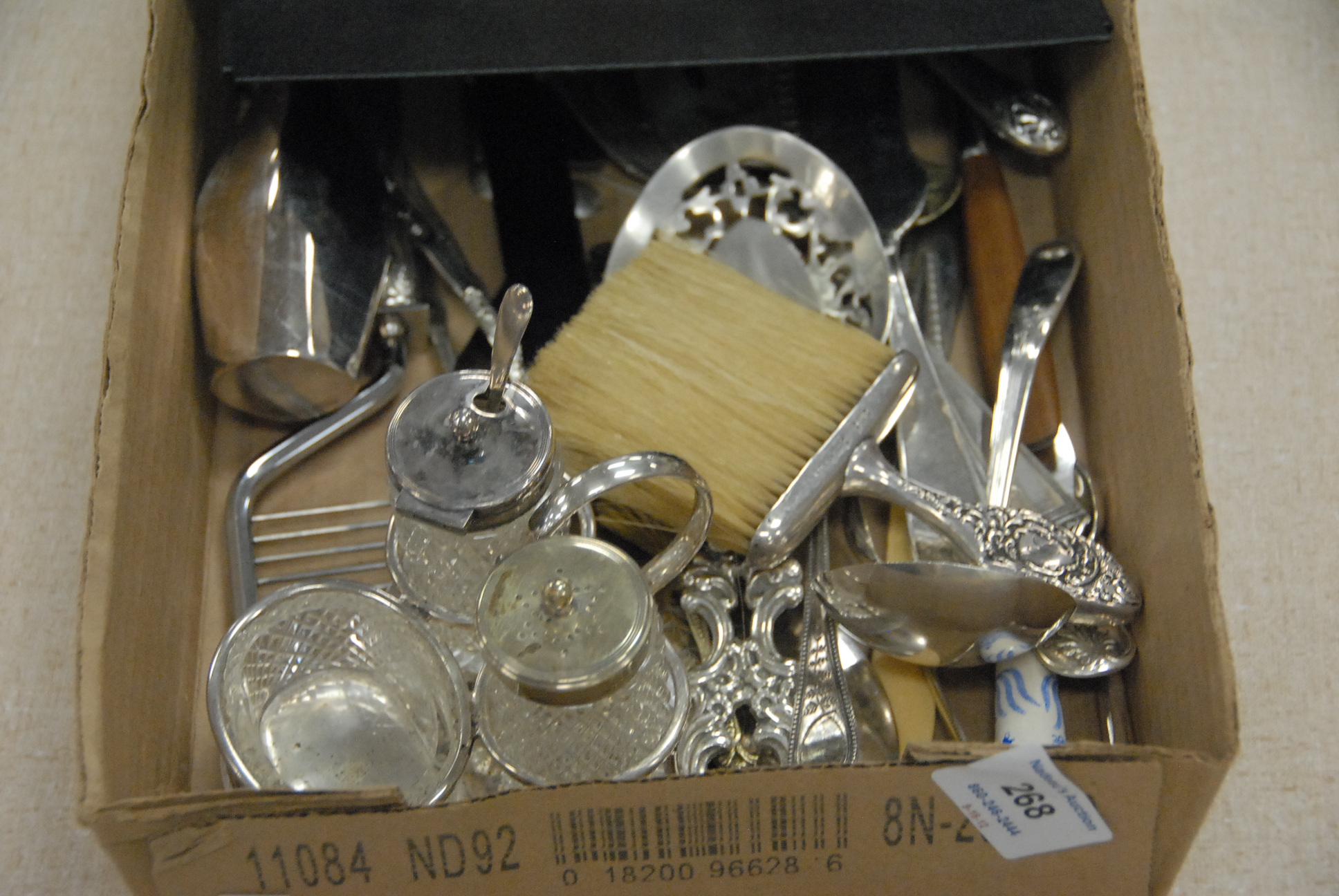 Lot 268: Box lot four knife rests, silver handled pieces, and several serving pieces mostly silver plate.