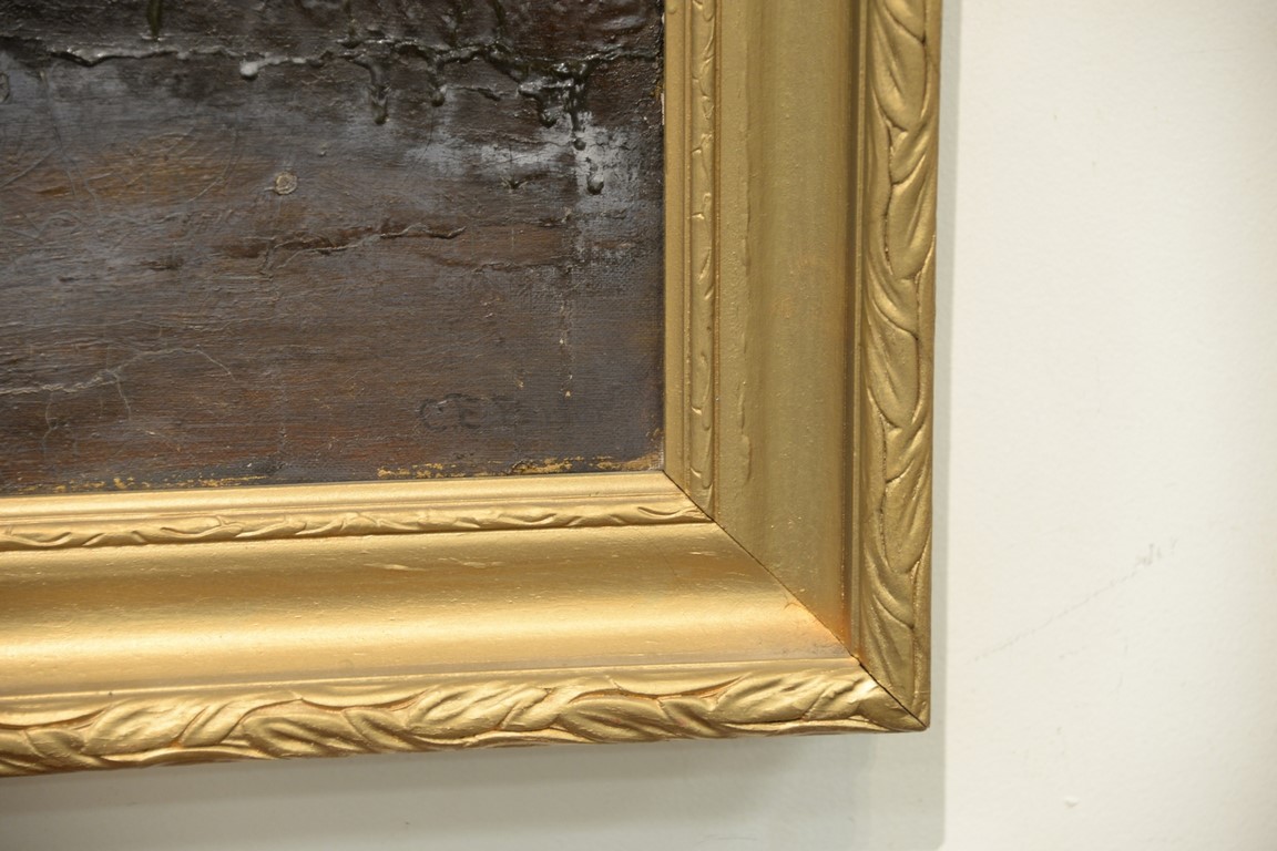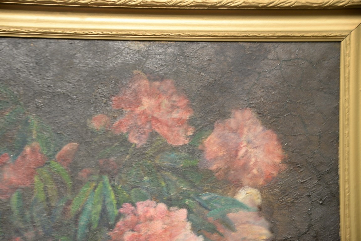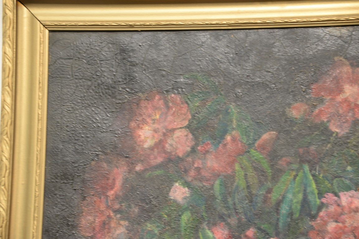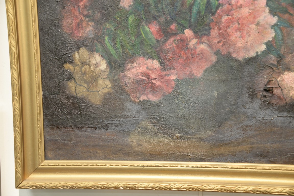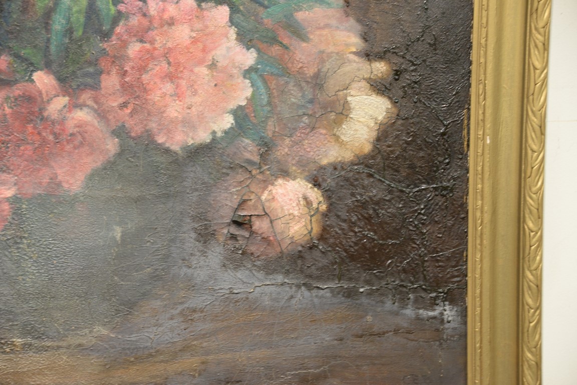 Charles Ethan Porter 1847-1923, oil on canvas, Still Life of Peonies and Roses in a Large Vase, signed lower right: C.E. Porter, fire/smoke damage to surface, 25 x 30, Literature: The Connecticut Gallery, Inc., Charles Ethan Porter, p.96, fig. 51 left wall