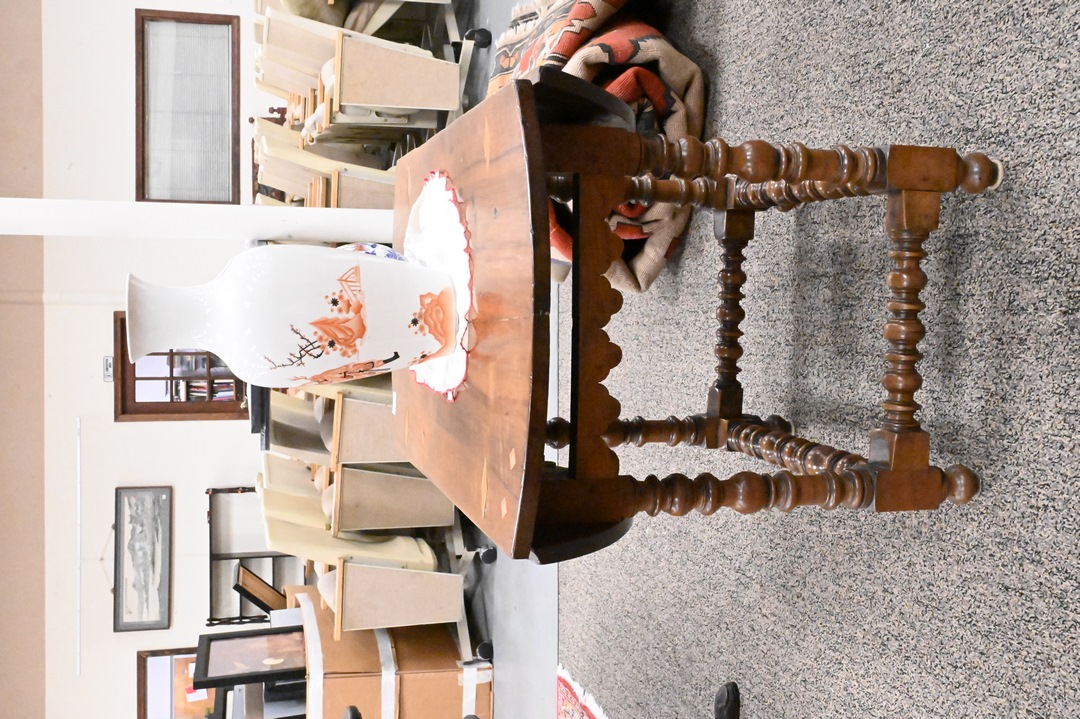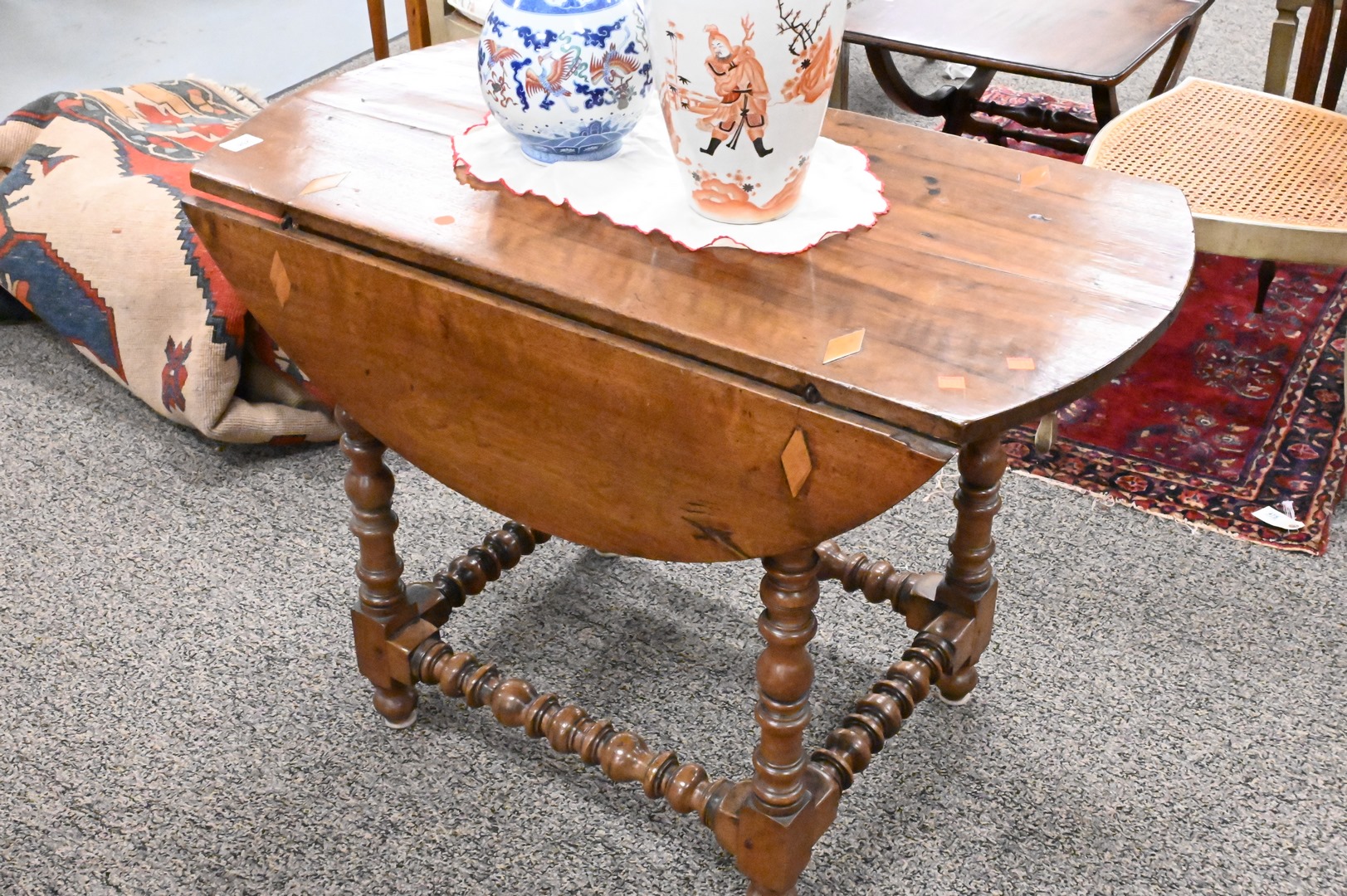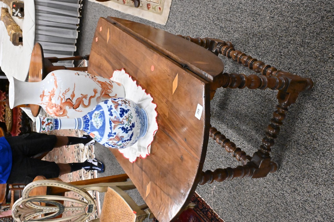 Continental Walnut Drop Leaf Table, on spool turned legs, height 27 inches, top 19″ x 38″. Provenance: Estate of Peter Tillou, Litchfield, Connecticut.
