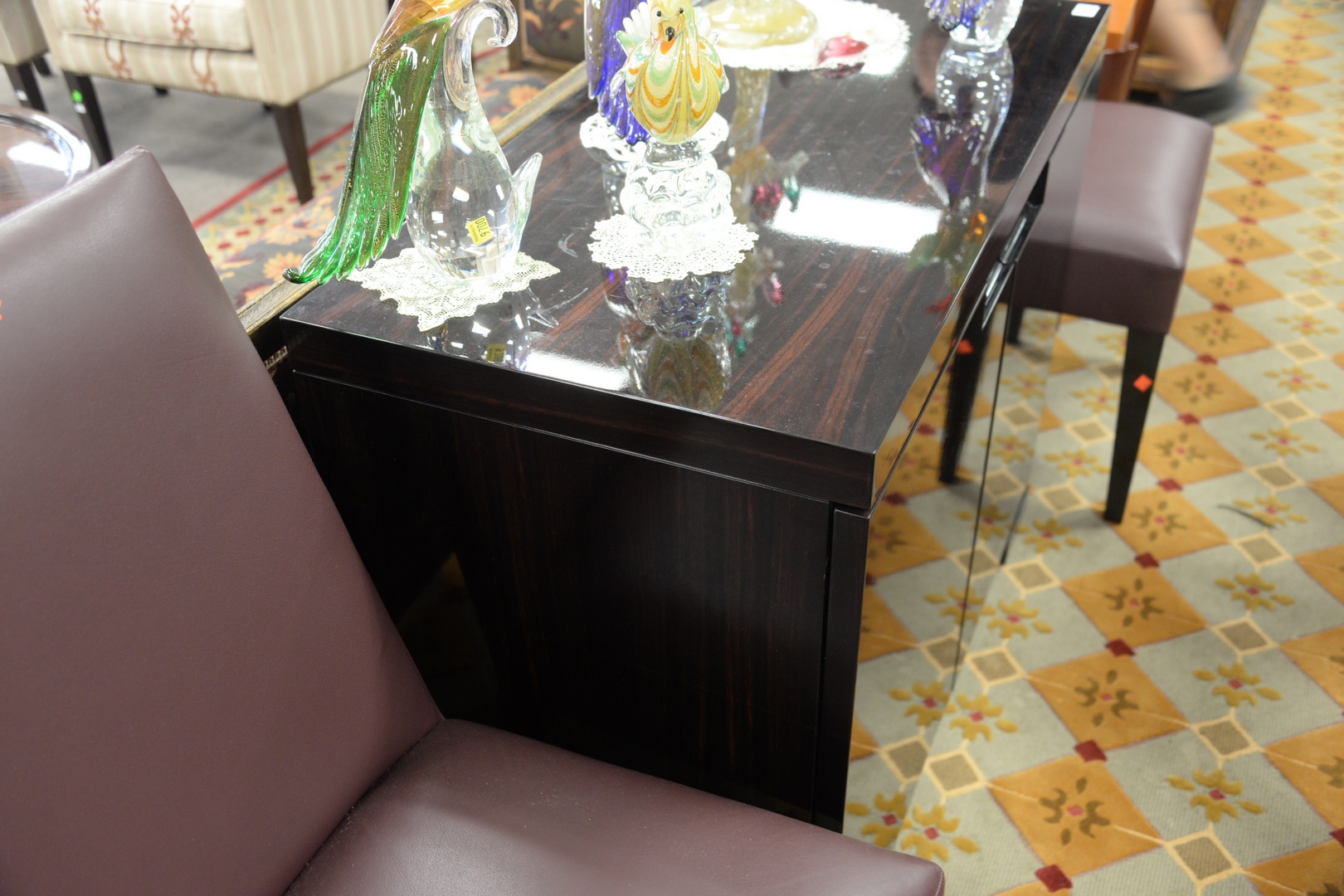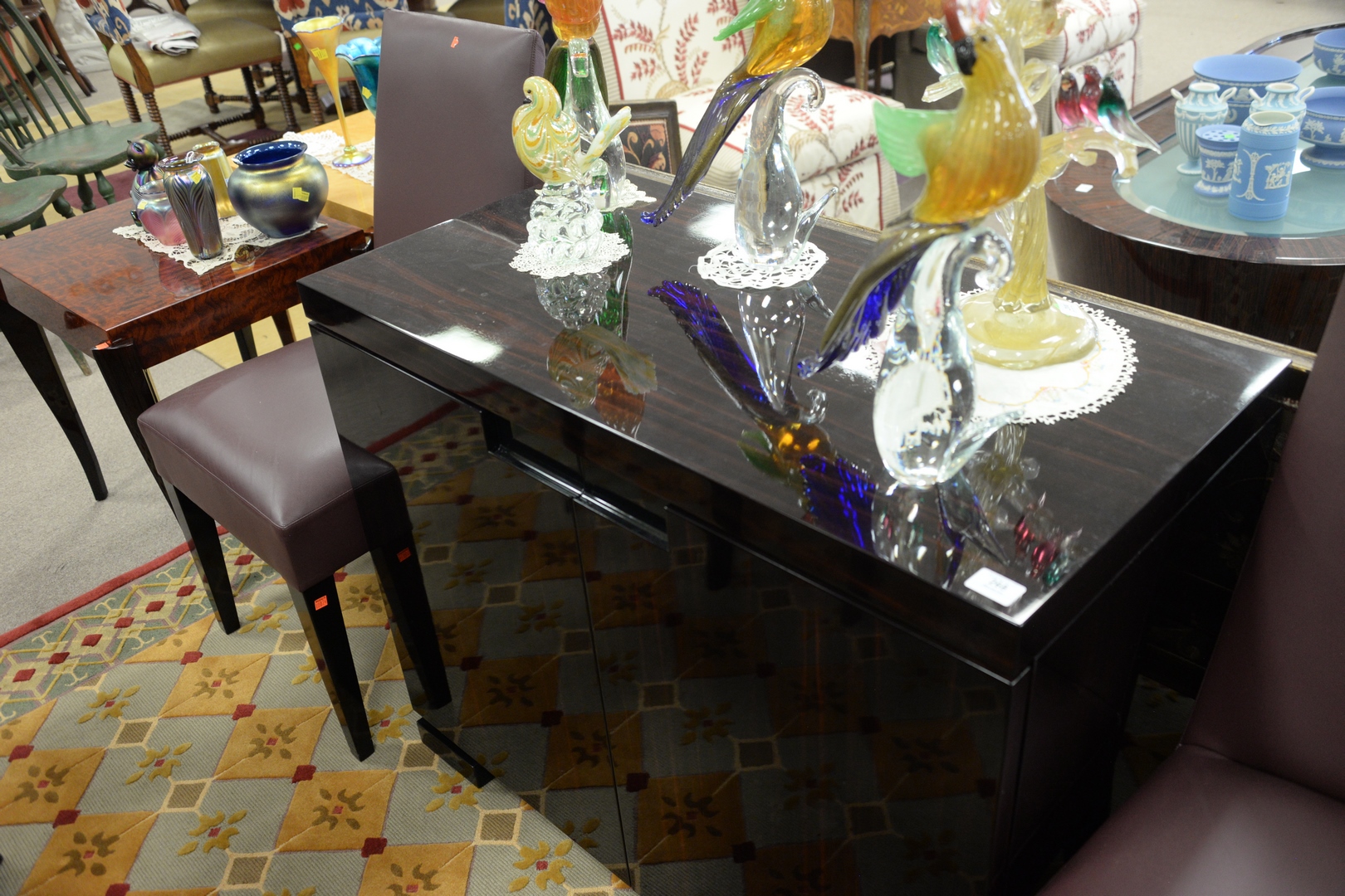 Lot 268: Dakota Jackson Lacquered Macassar Ebony Server, having two doors opening to two interior shelves, height 32 inches, top 40″ x 19 3/4″.