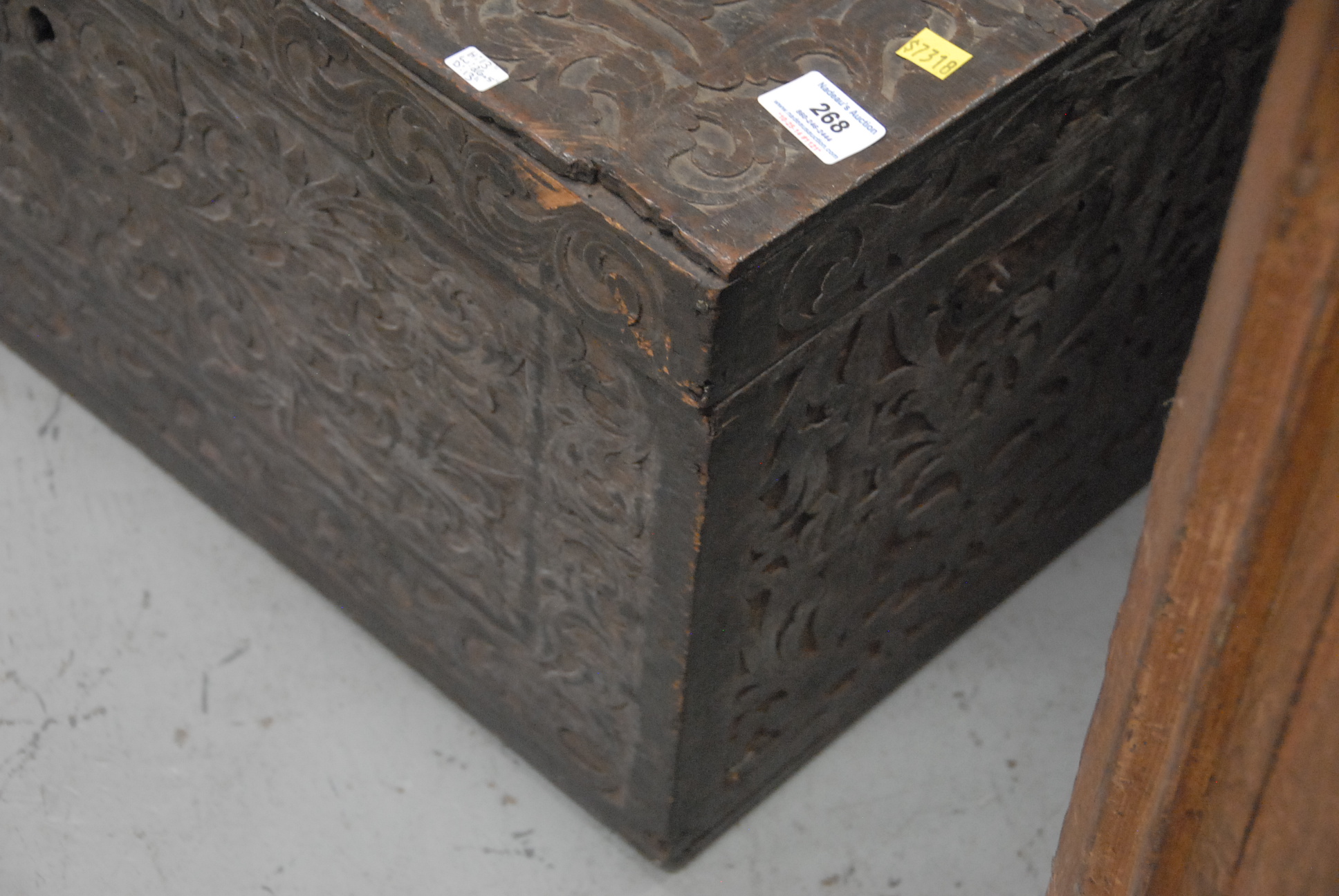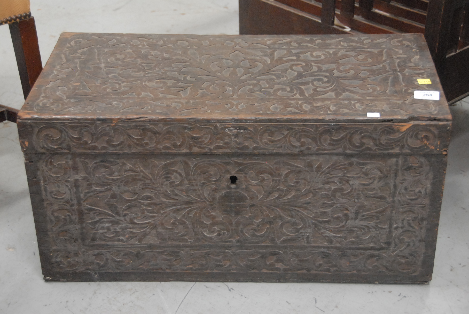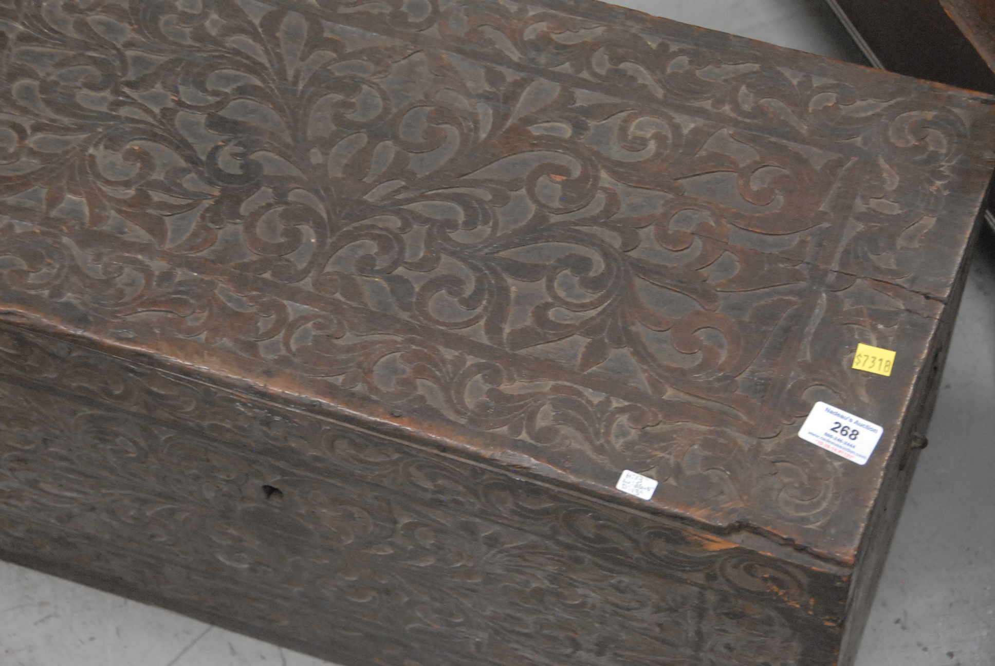 Lot 268: English lift top chest with all over floral and scroll carving, probably 18th century. ht. 13 in. wd. 26 1/2 in. dp. 13 in.