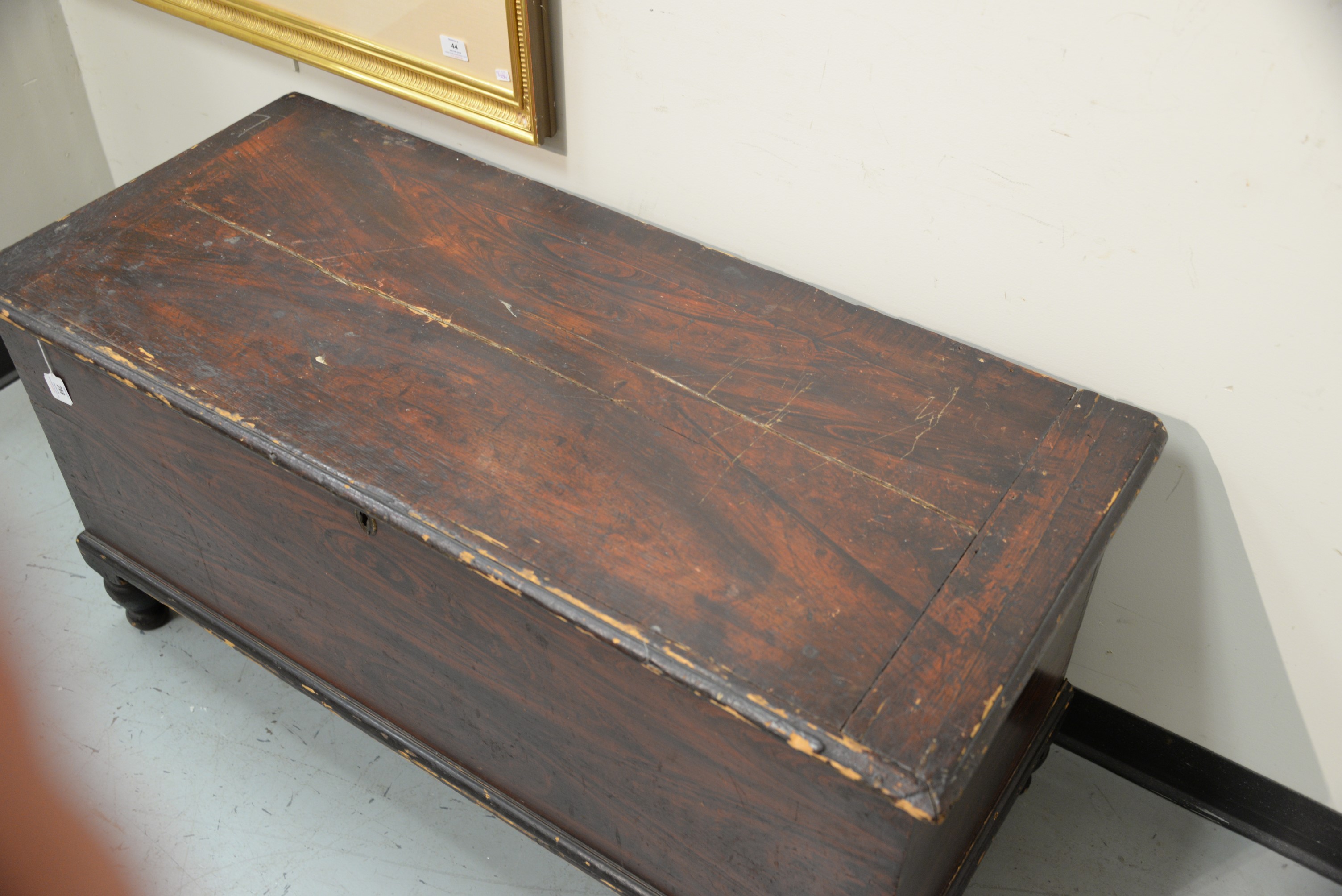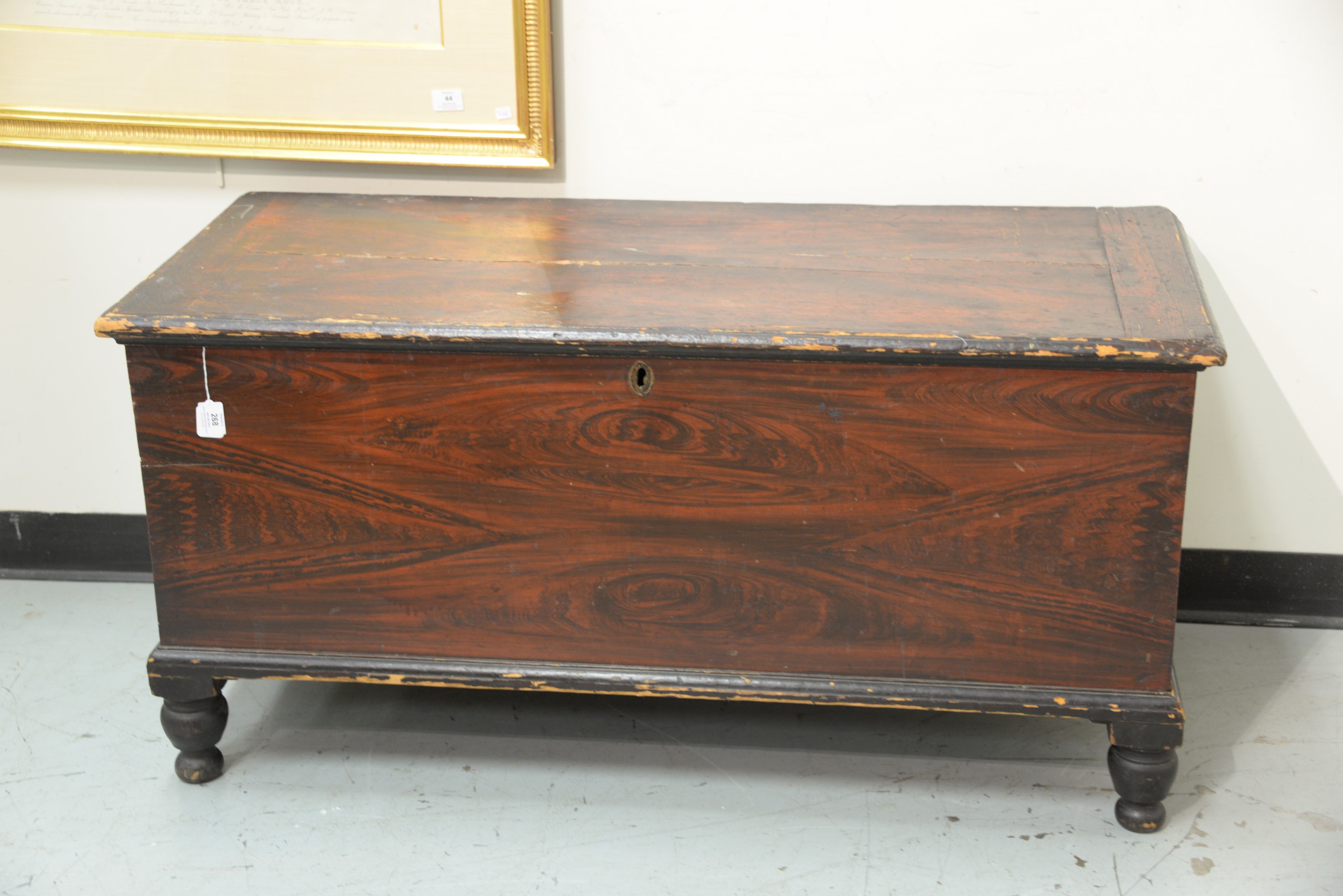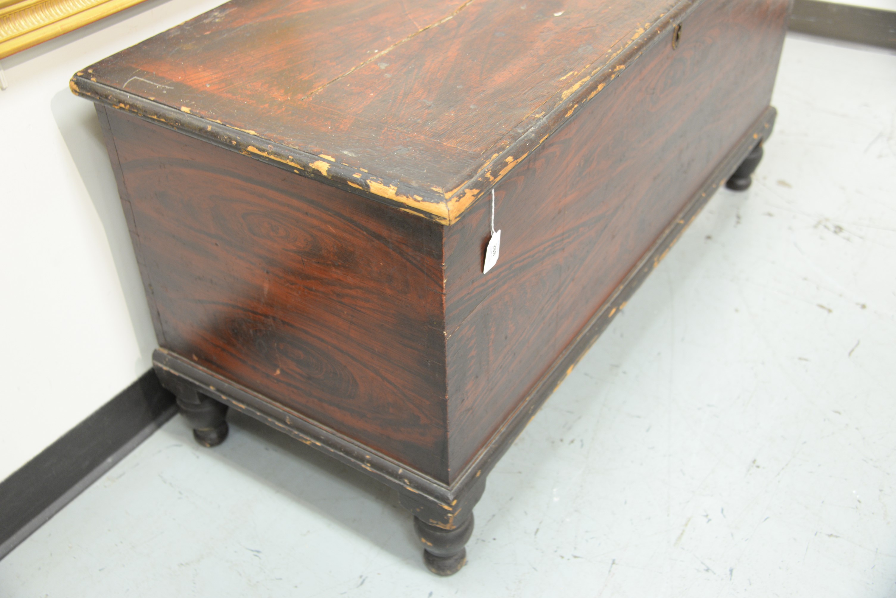 Lot 268: Federal blanket chest having lift top, all set on turned legs, circa 1820-30. ht. 31 in. case wd. 23 3/4 in. dp. 14 in.