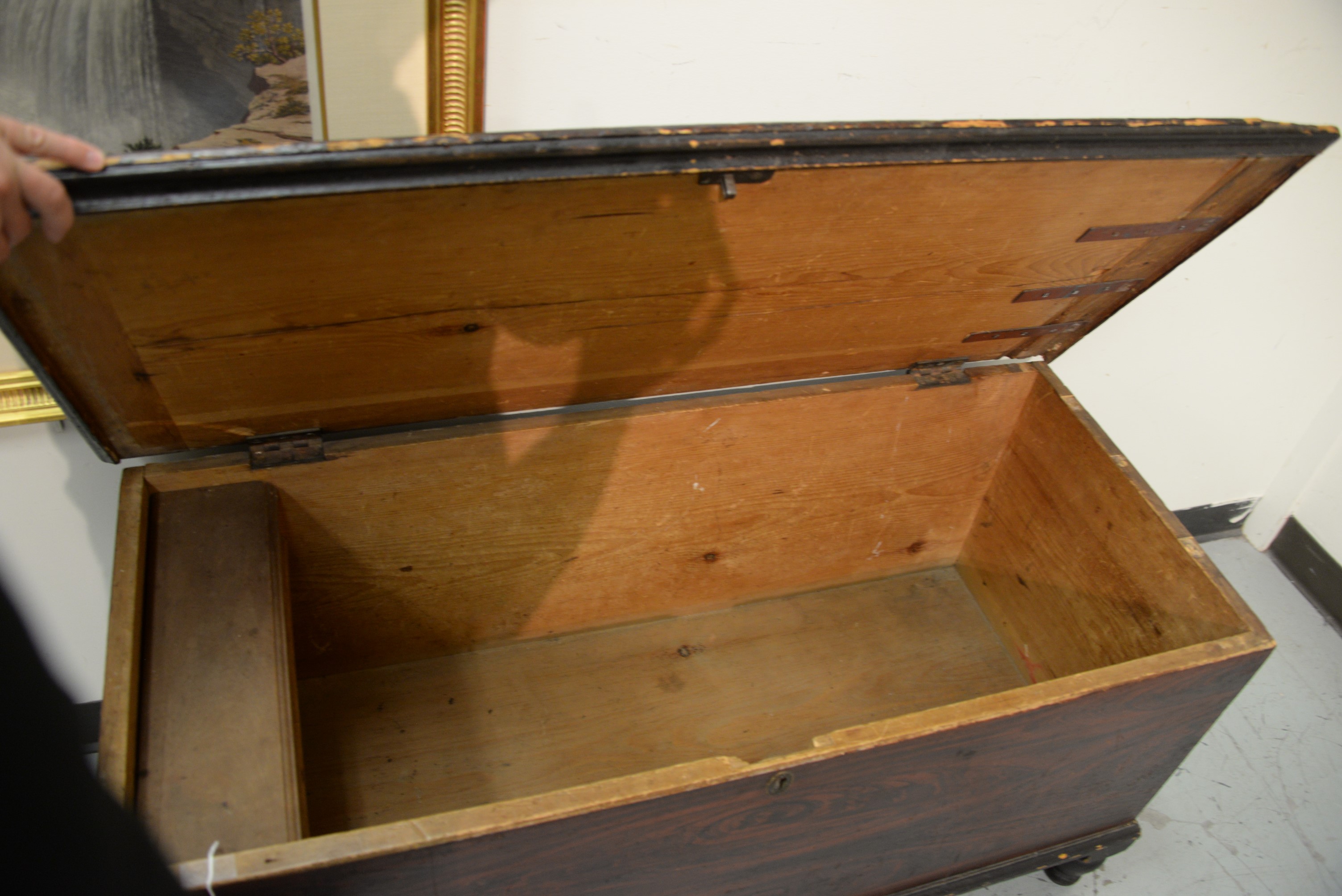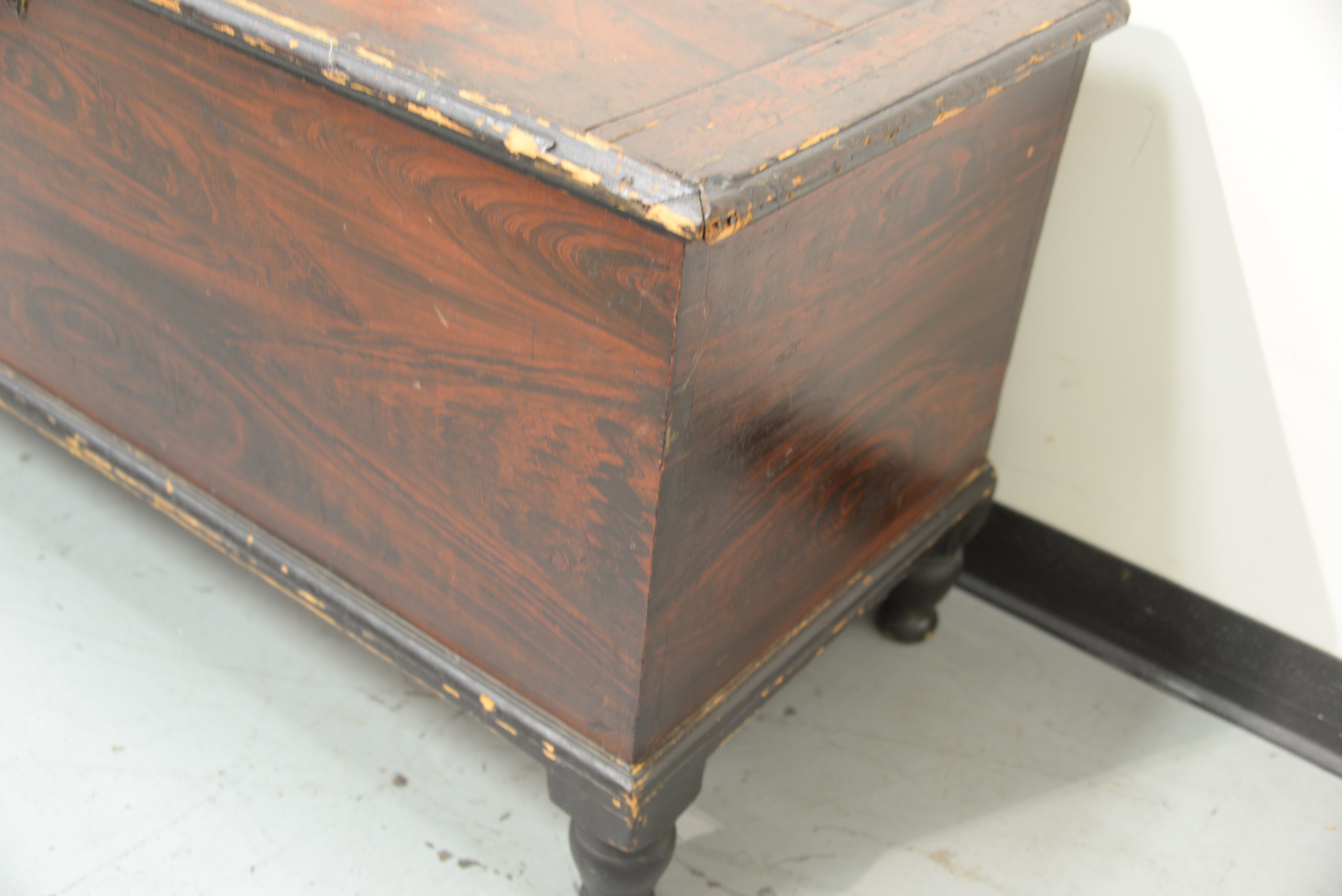 Federal blanket chest having lift top, all set on turned legs, circa 1820-30. ht. 31 in. case wd. 23 3/4 in. dp. 14 in.
