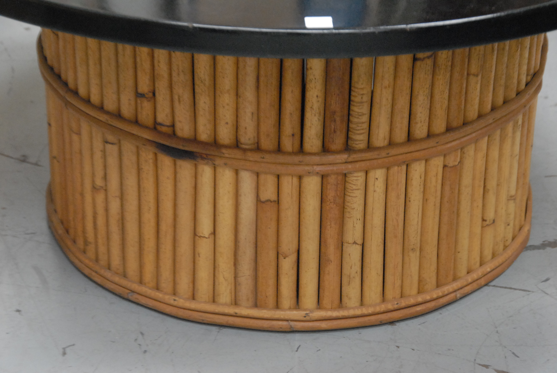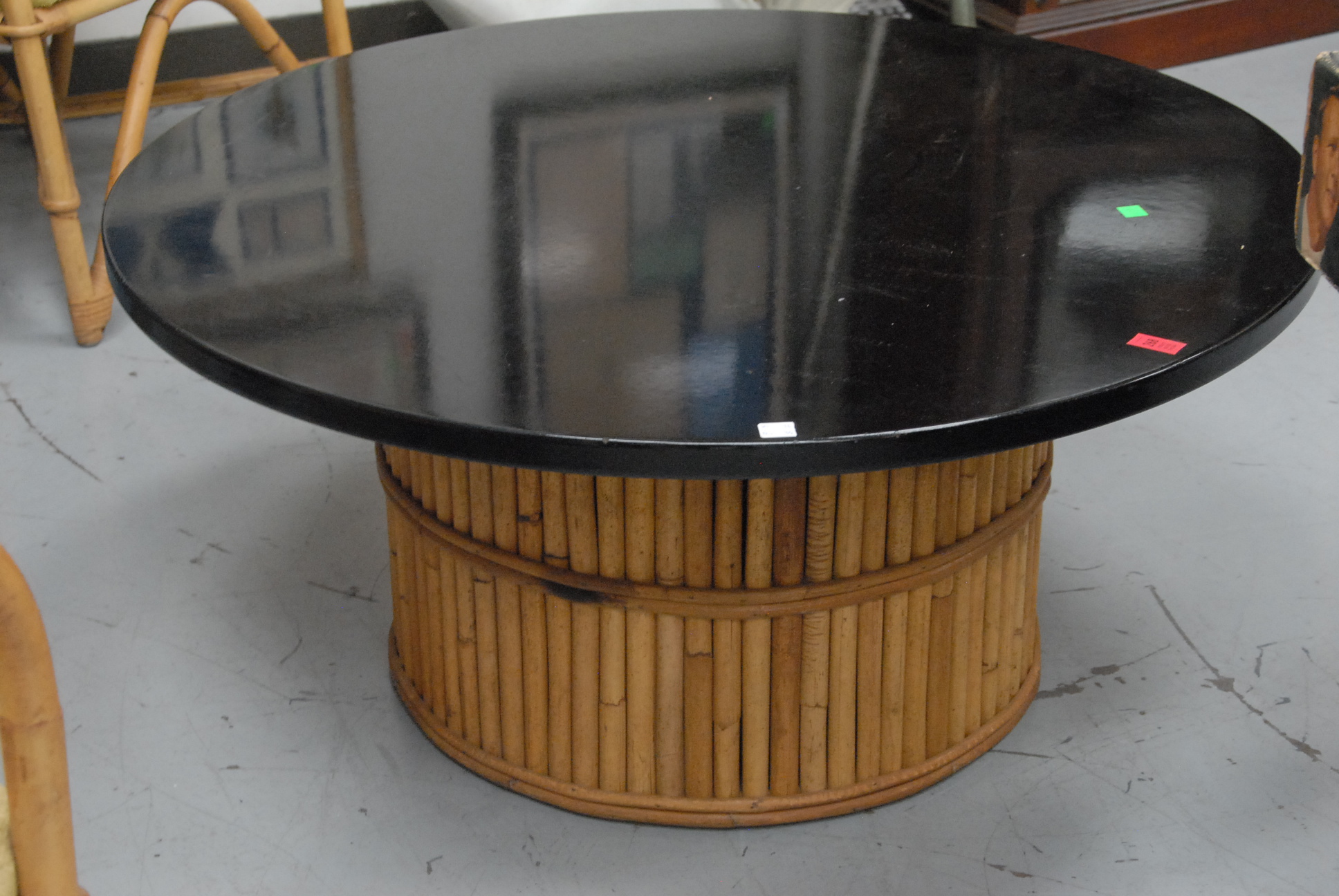 Lot 268: Ficks Reed circa 1935 round coffee table having a round black lacquered top set on a round bamboo base in the style of Paul Frankl,…