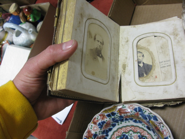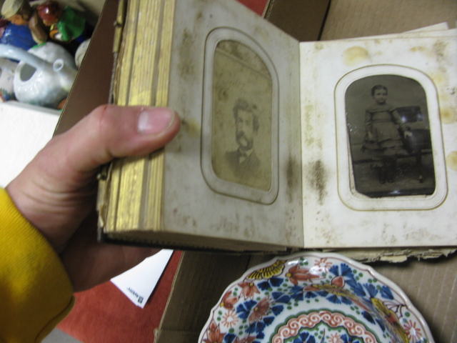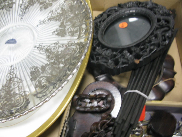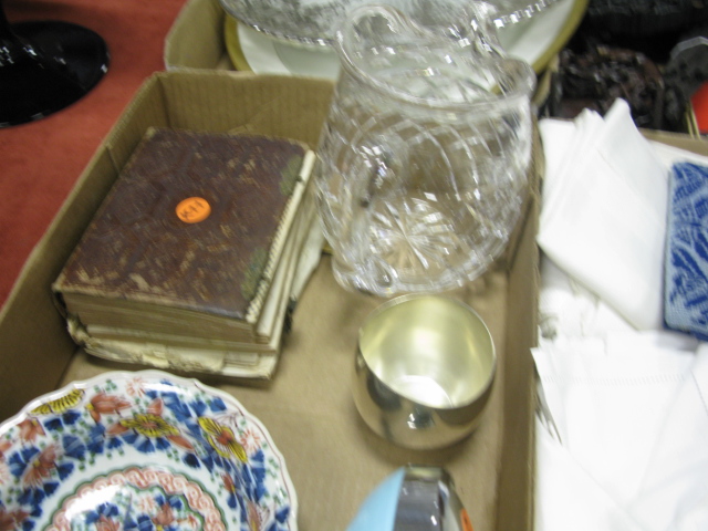 Four box lots to include Waterford crystal pitcher, silver overlay dish, rubbing, small print, rolled up print, 2 platters, photo album with tin types, Mideastern style bowl, sterling silver steiff cup, alarm clock, misc. linen, teakwood carved picture frame, teakwood stand, teakwood chopstick and skeleton keys.