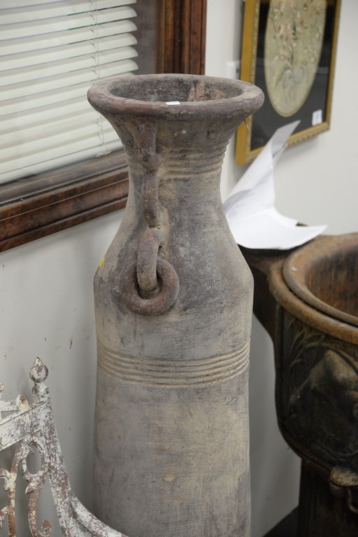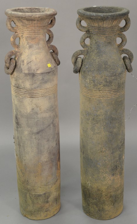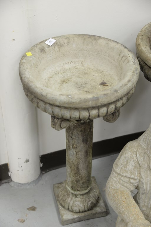Lot 268: Four piece lot to include a pair of cement birdbaths and a pair of earthenware tall urns, ht. 47 1/2in.