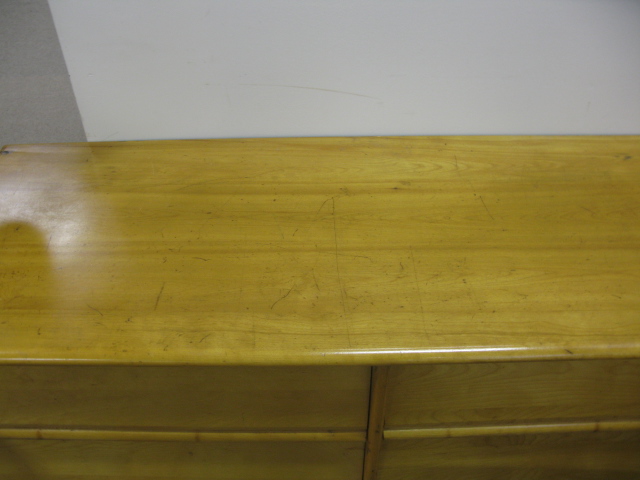 Four piece lot to include Haywood Wakefield small sideboard, Herman Miller tray modern Bentwood armchair and floor lamp