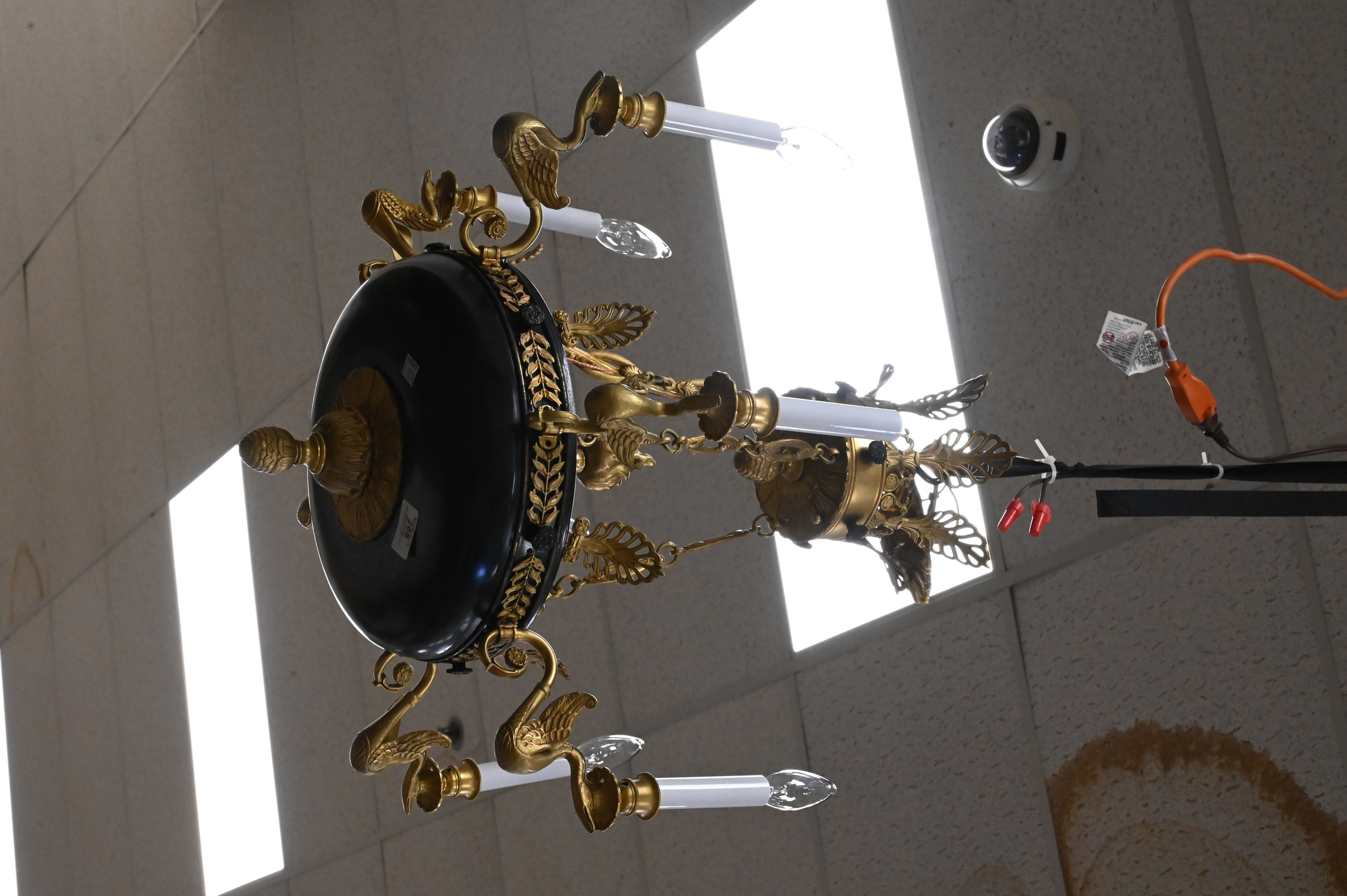 having black metal body surmounted by torch form finial bronze mounts and six swan form lights