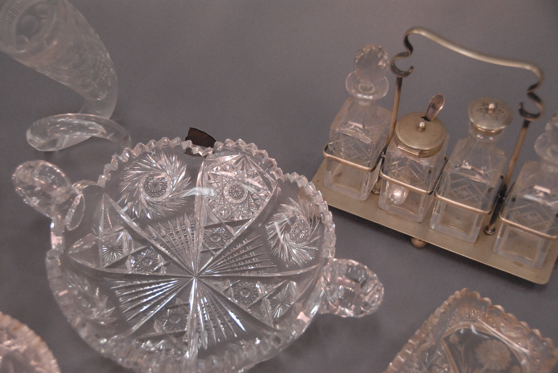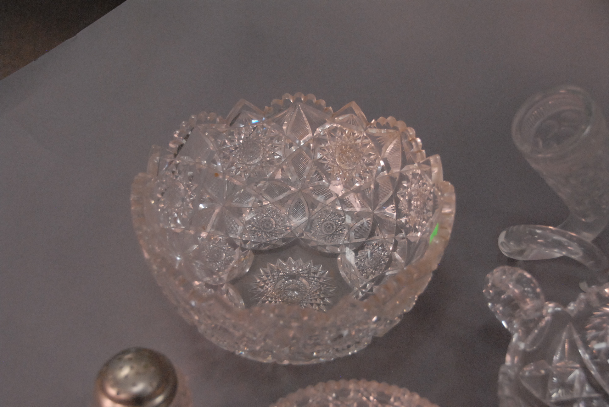Group of crystal and cutglass to include bowls, vases, and decanter set.
