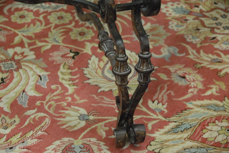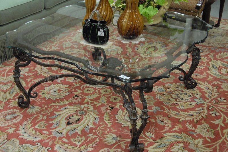 Iron and glass top coffee table with shaped top, ht. 22 in. top: 48 x 48.