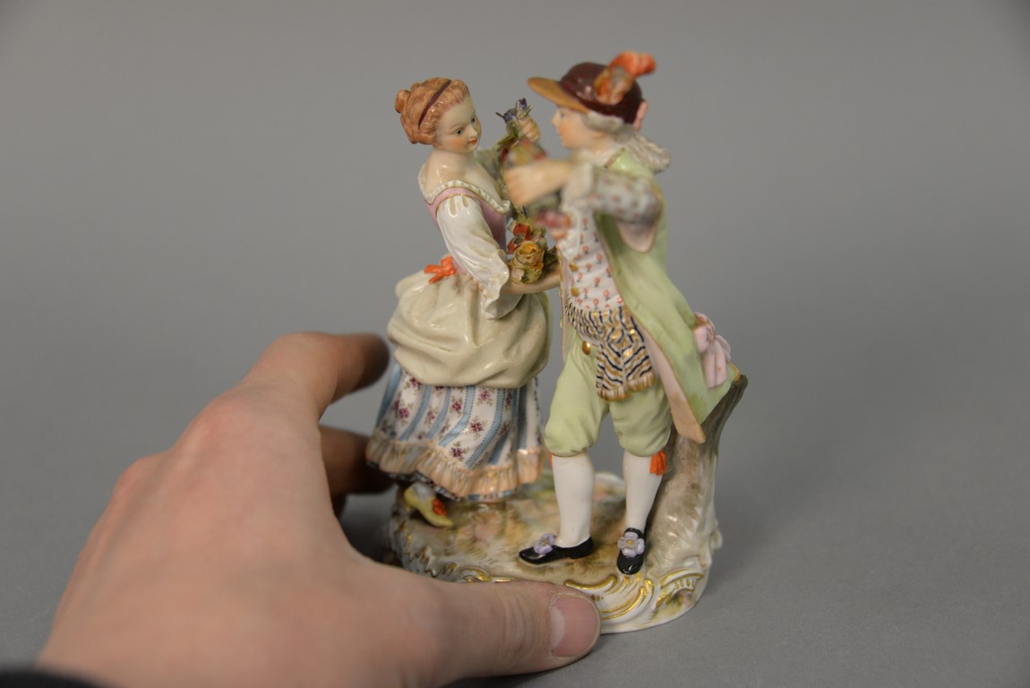 Lot 268: Meissen Figure having a man and a woman dancing with cross sword mark on bottom small chips on flowers and the feather on the hat h…