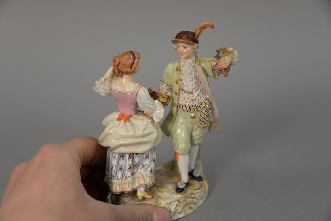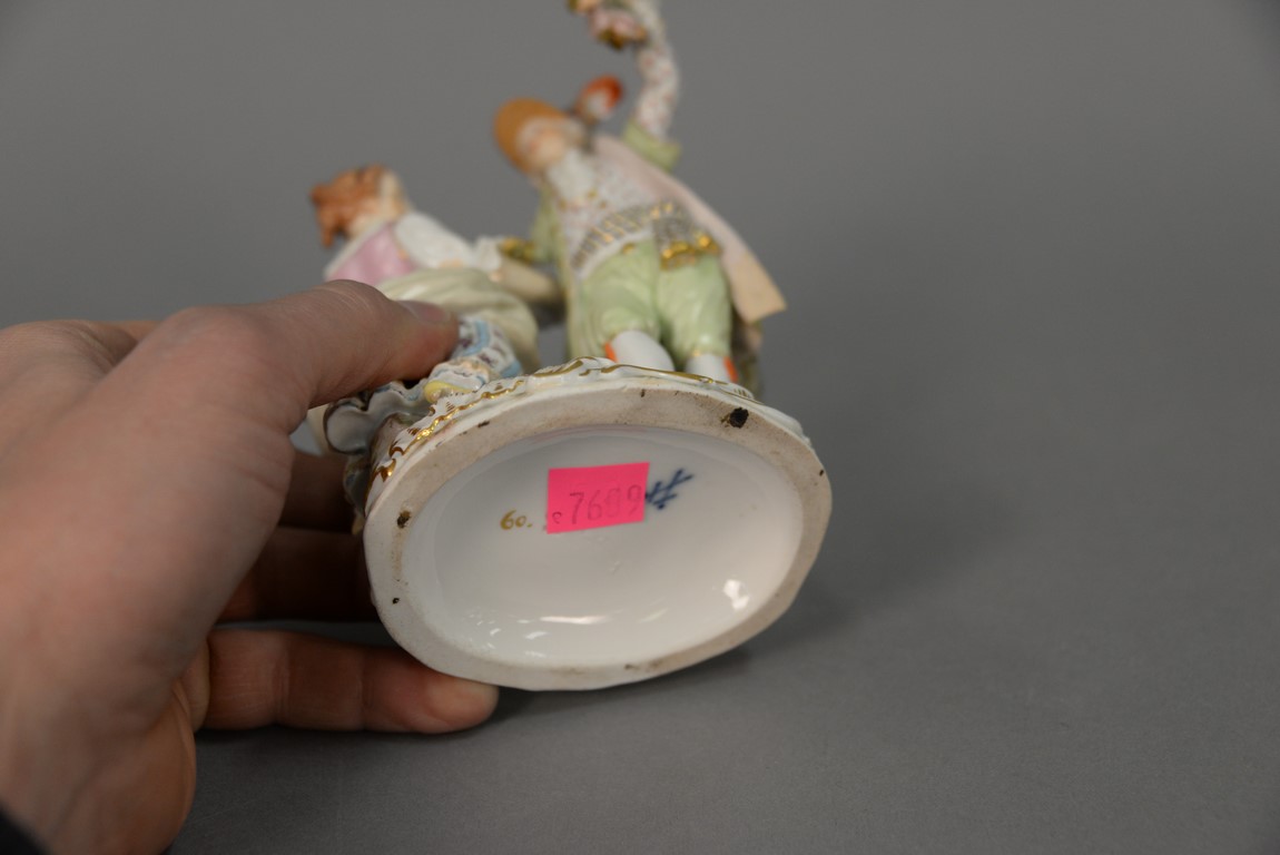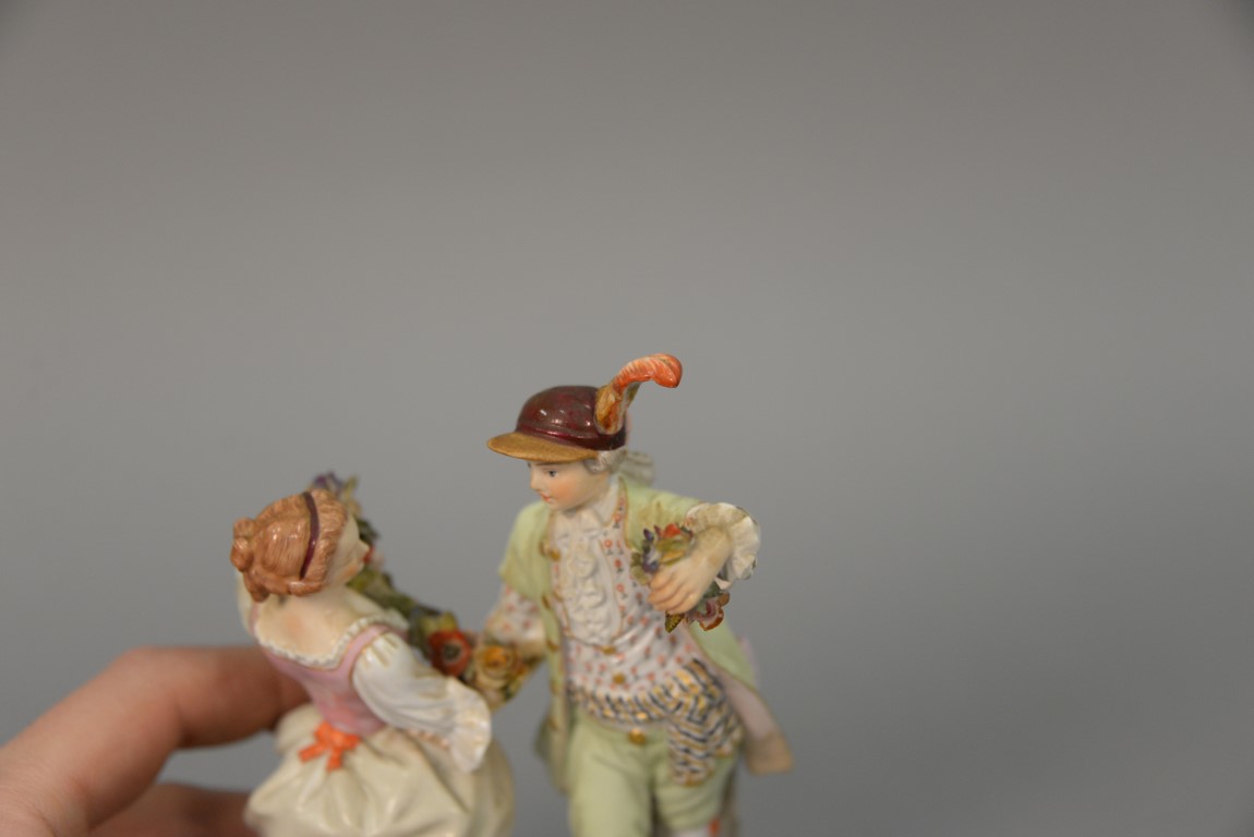 Meissen Figure having a man and a woman dancing with cross sword mark on bottom small chips on flowers and the feather on the hat has been broken and repaired. ht. 6 in.