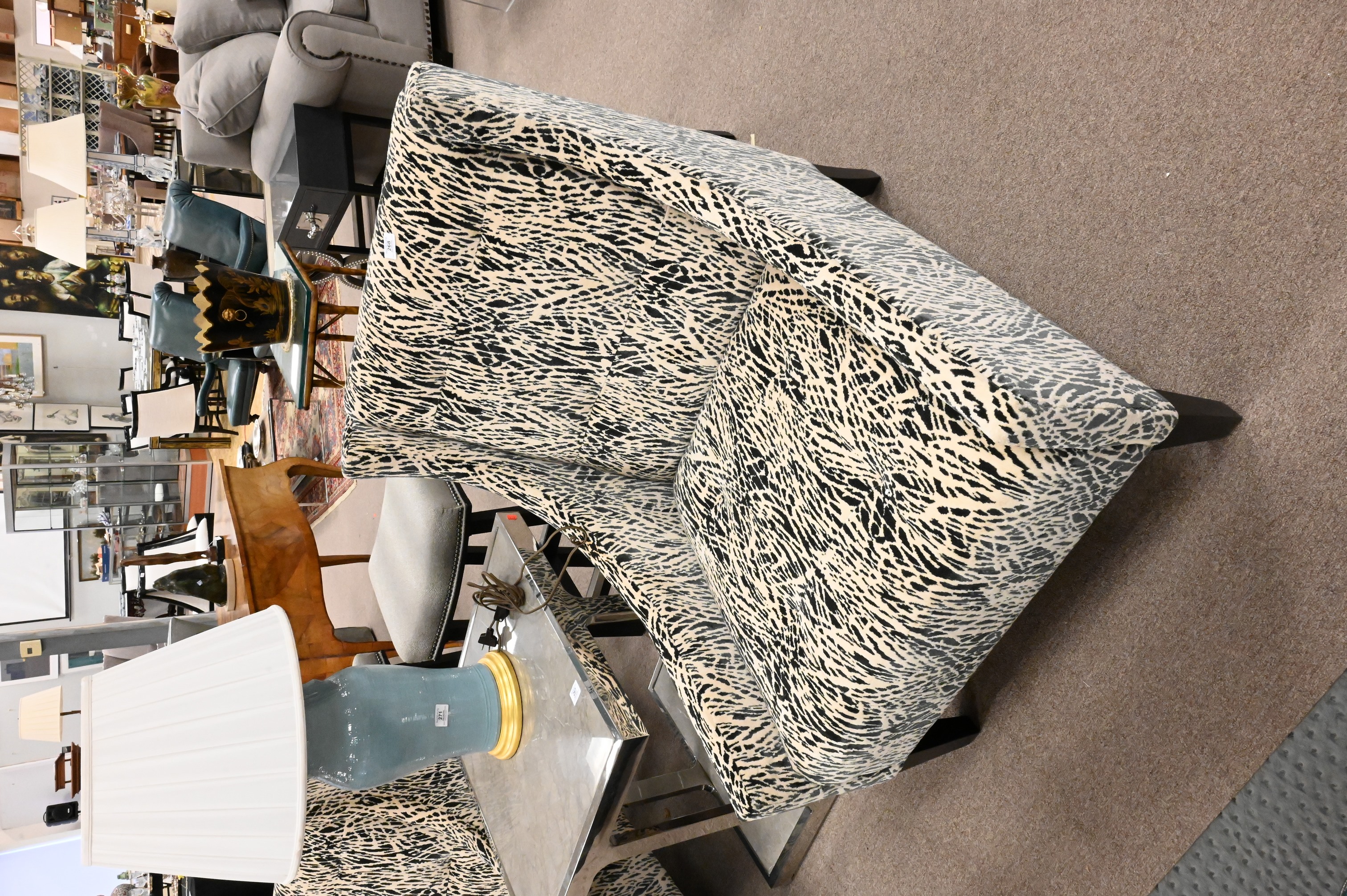 having campden natural upholstery, set on ebonized legs