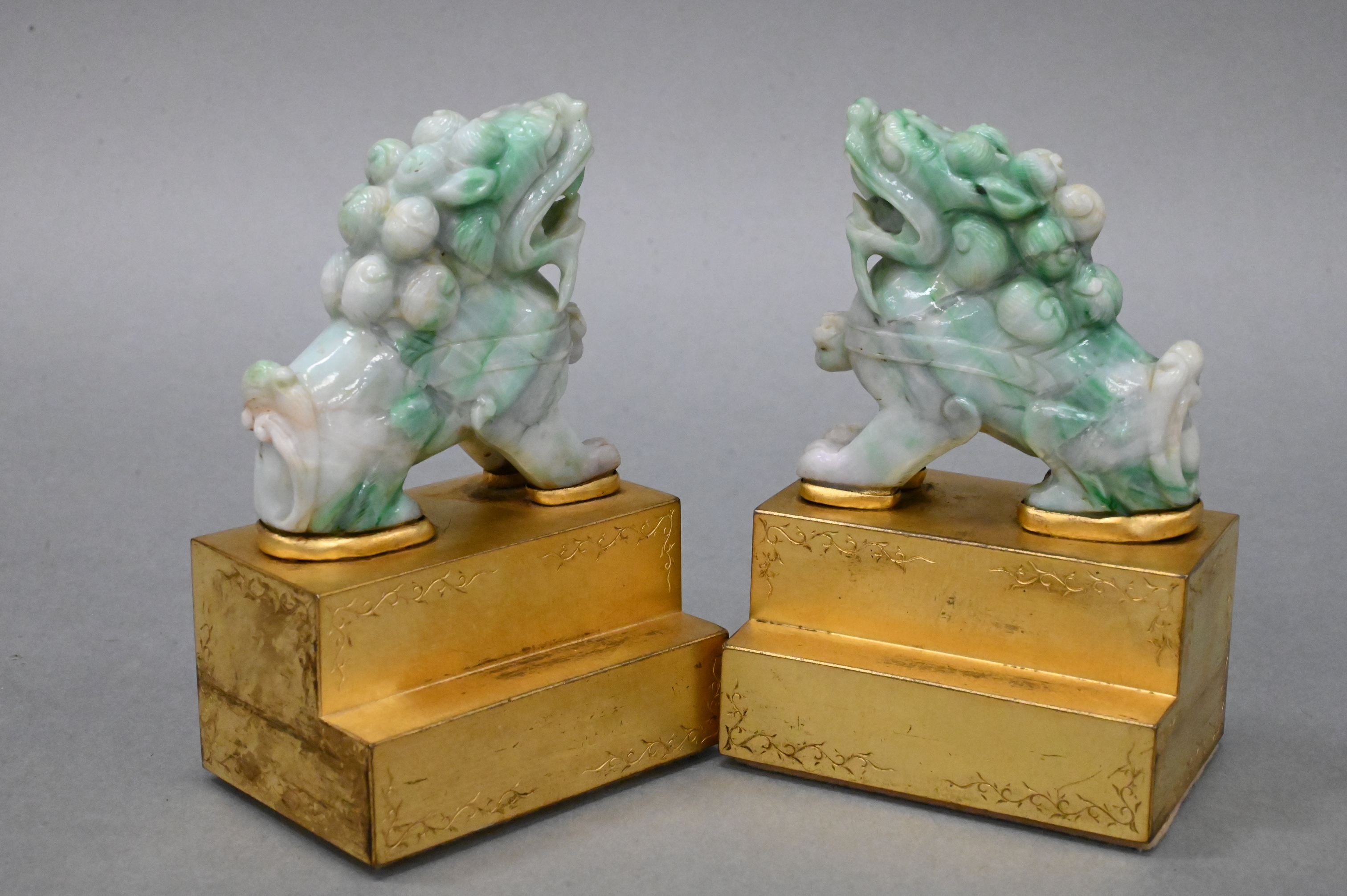 green and white carved stone featuring swirling manes, open mouths, in a sitting position, mounted on gilt metal pedestal base