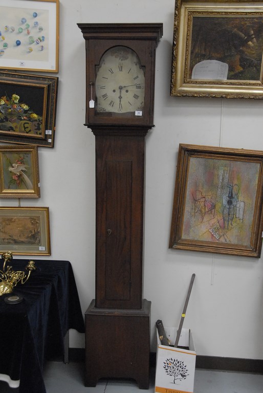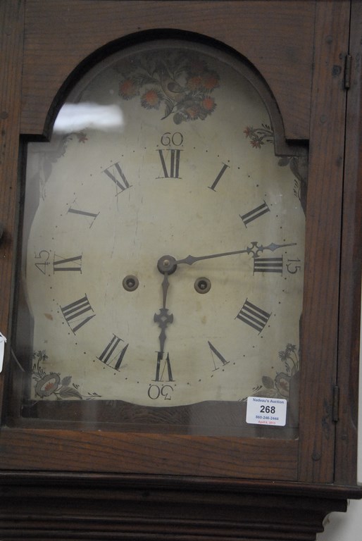 Lot 268: Primitive oak tall clock with painted wood dial, late 18th – early 19th century. ht. 87in. wd. 12in.
