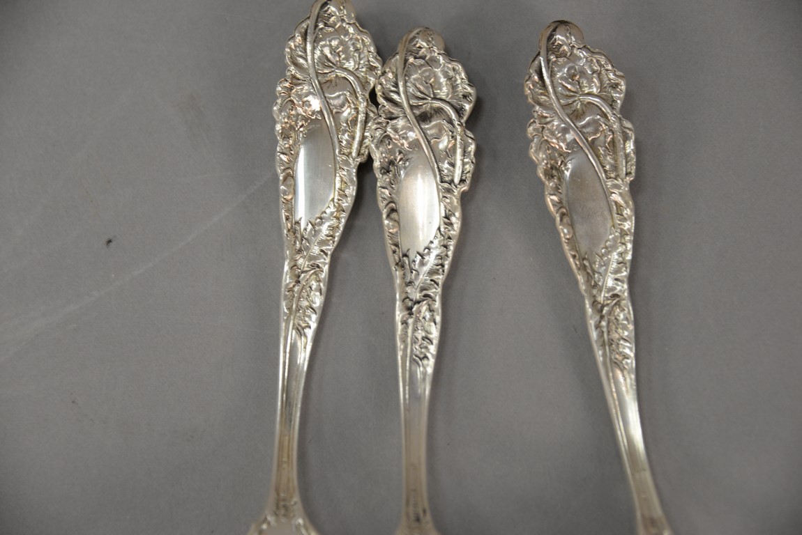 Lot 268: Reed & Barton Love Disarmed three sterling silver serving pieces to include two pie servers lg. 9 1/2 in. and jelly cake server lg. 10 in. 11.5 t oz.