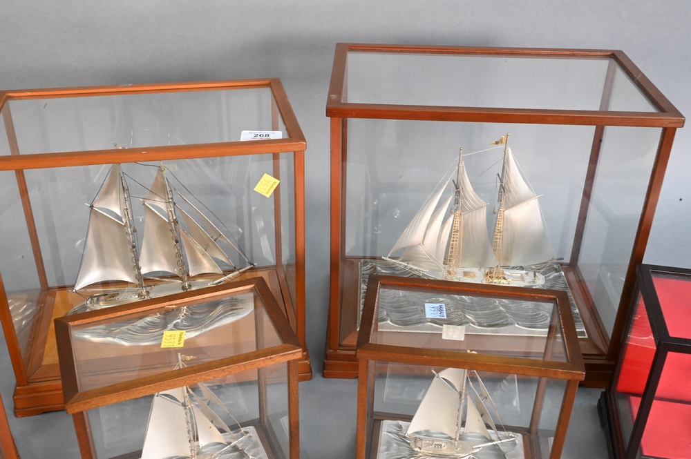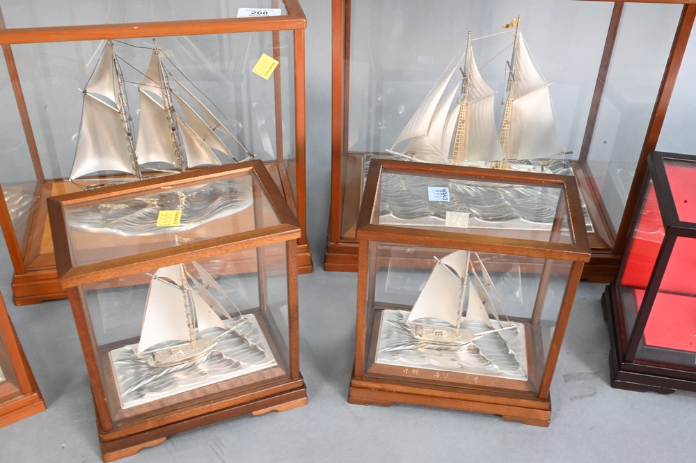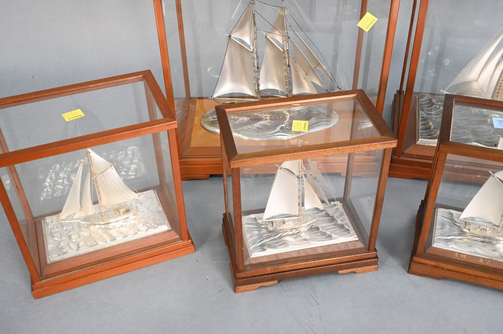 Lot 268: Six Piece Lot, to include five sterling silver sailing boats marked Sterling 960, along with crane and turtle; all in glass cases; h…