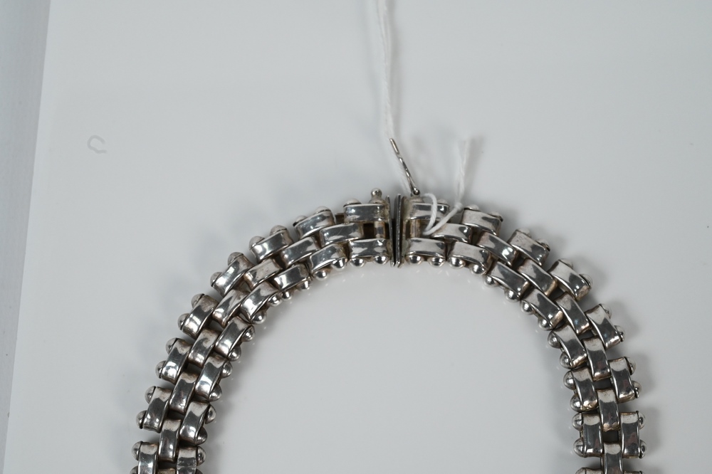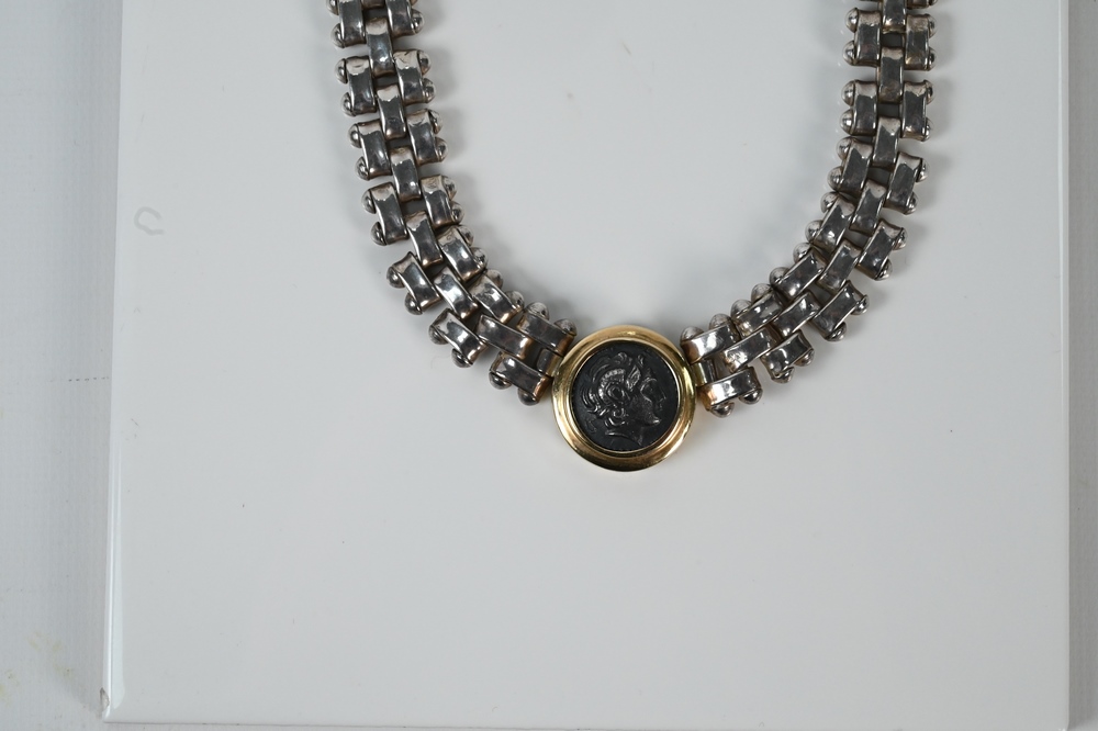 Sterling Silver and 18 Karat Gold Necklace, having sterling chain with 18 karat gold framed pendant, makers mark 1338 MI, 750, 925, length 16 inches, 70.1 grams.