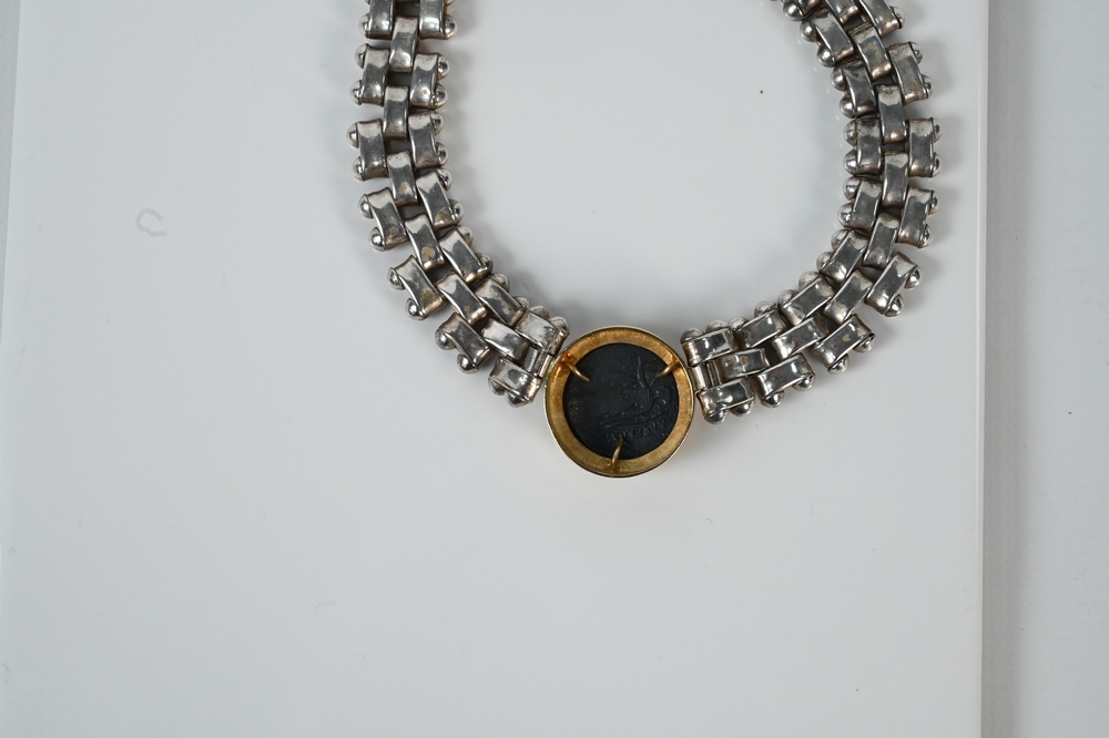 Lot 268: Sterling Silver and 18 Karat Gold Necklace, having sterling chain with 18 karat gold framed pendant, makers mark 1338 MI, 750, 925, …