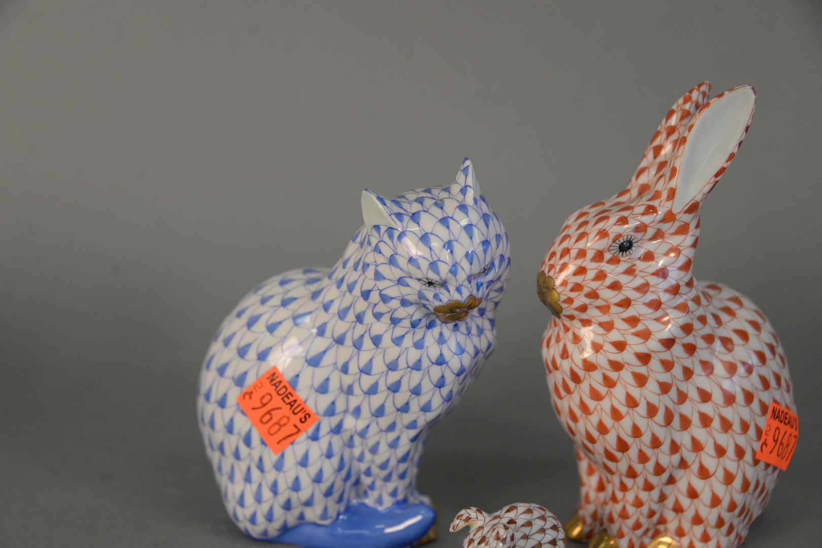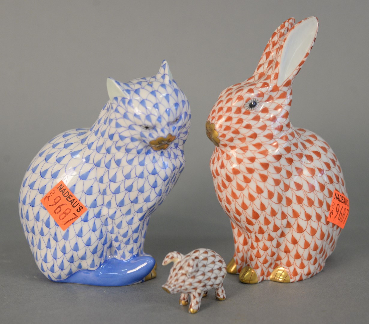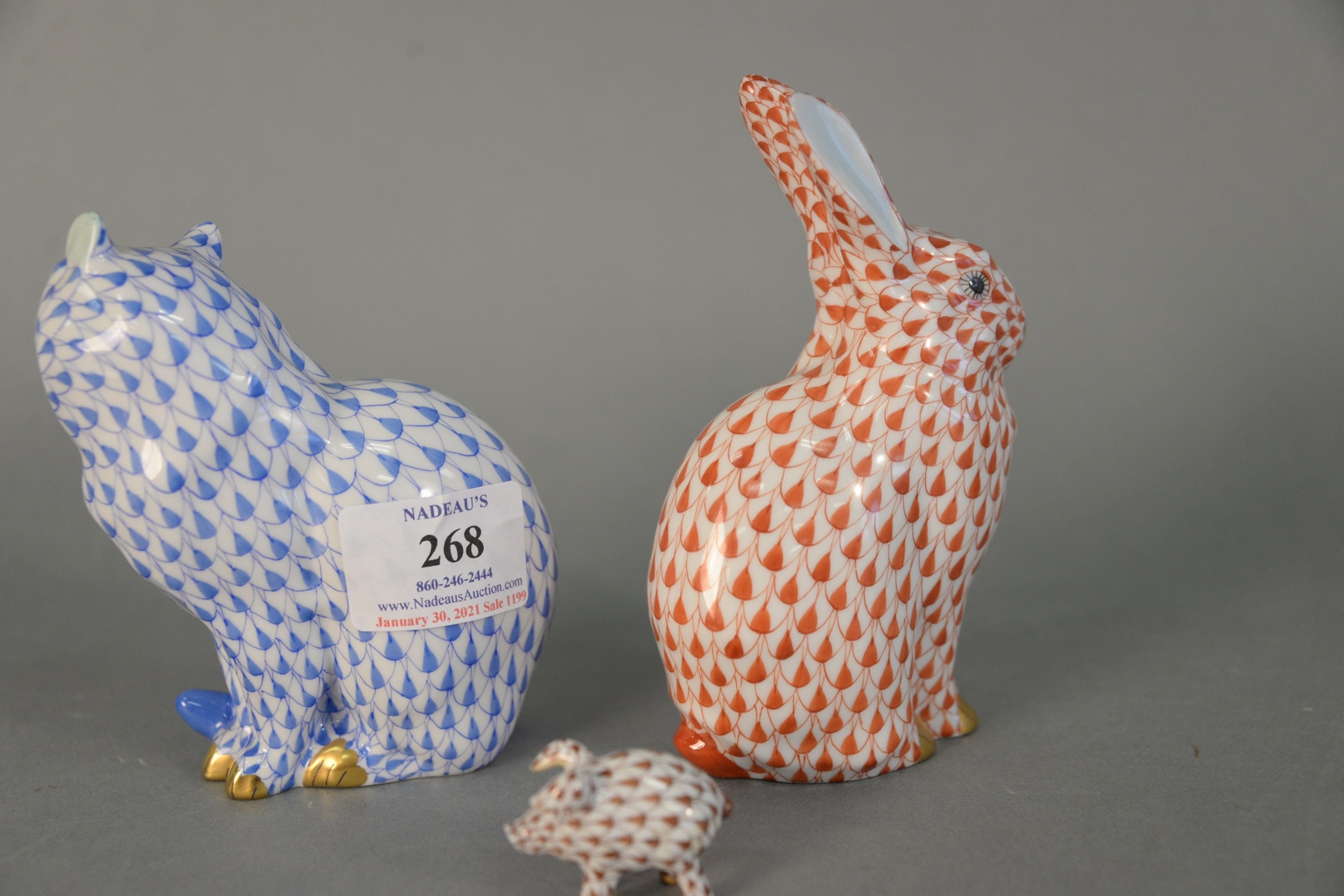Lot 268: Three Herend Animal Figures to include rabbit, height 5 1/2 cat, height 4 1/2 and miniature pig, height 1 1/8′ each marked to the…