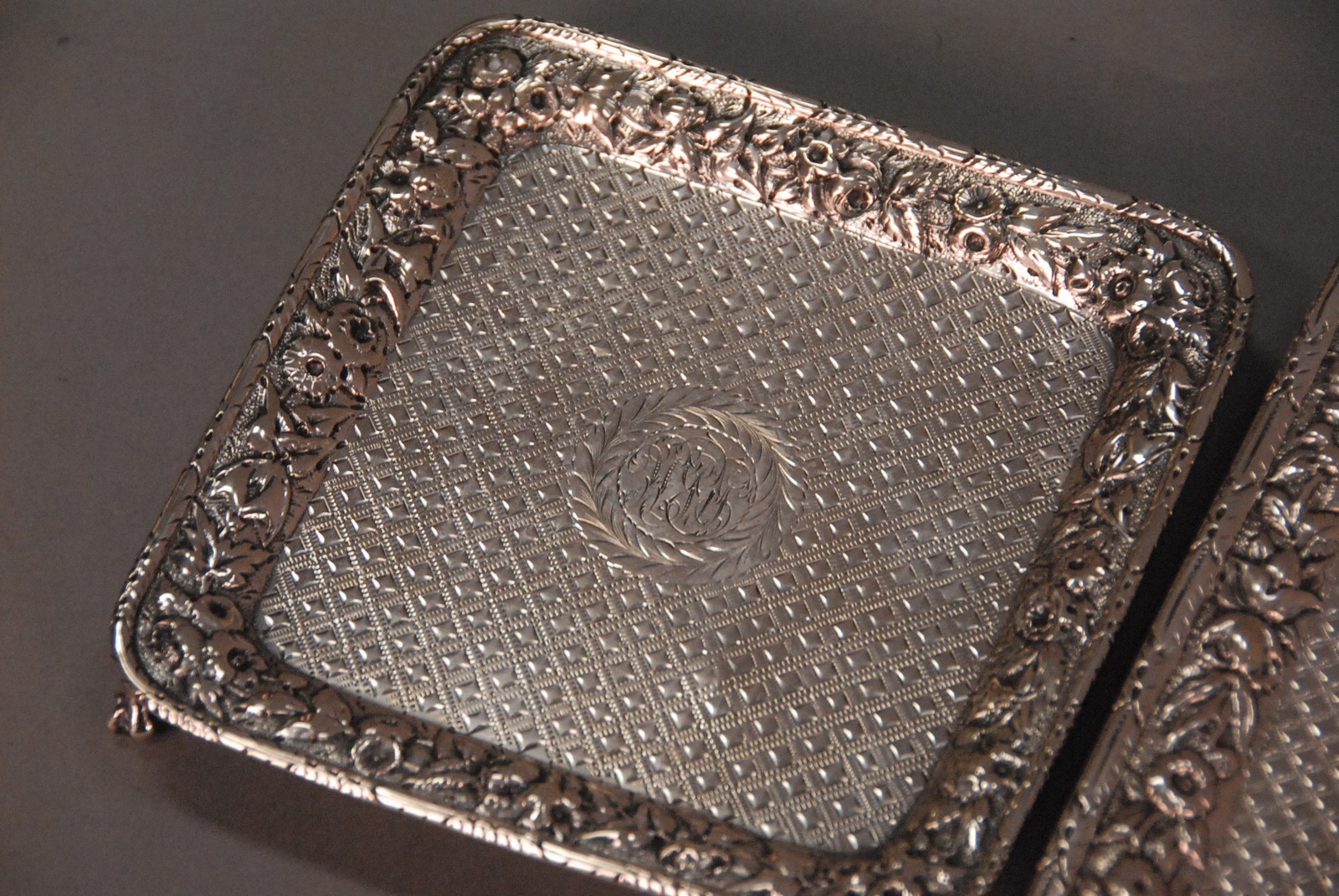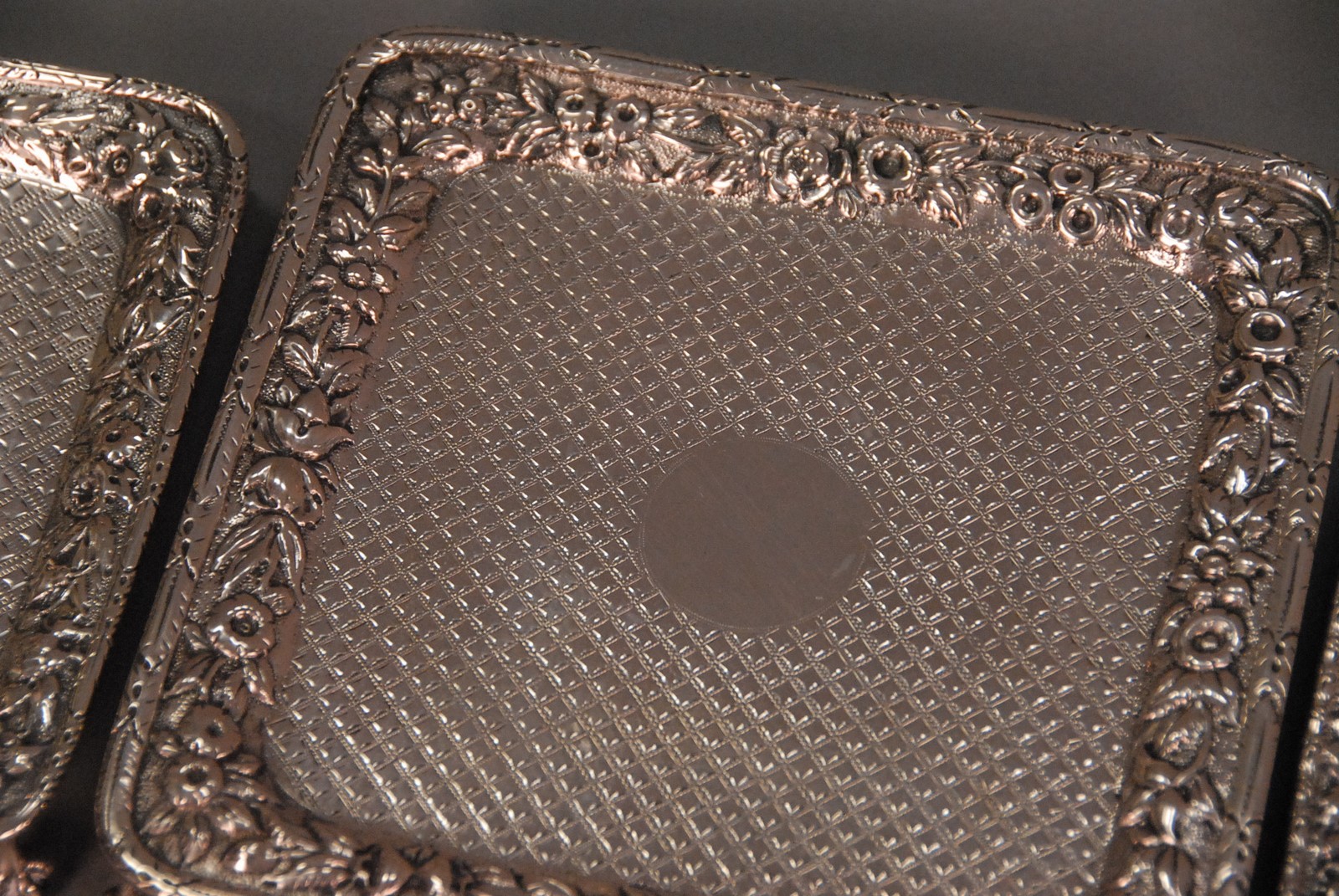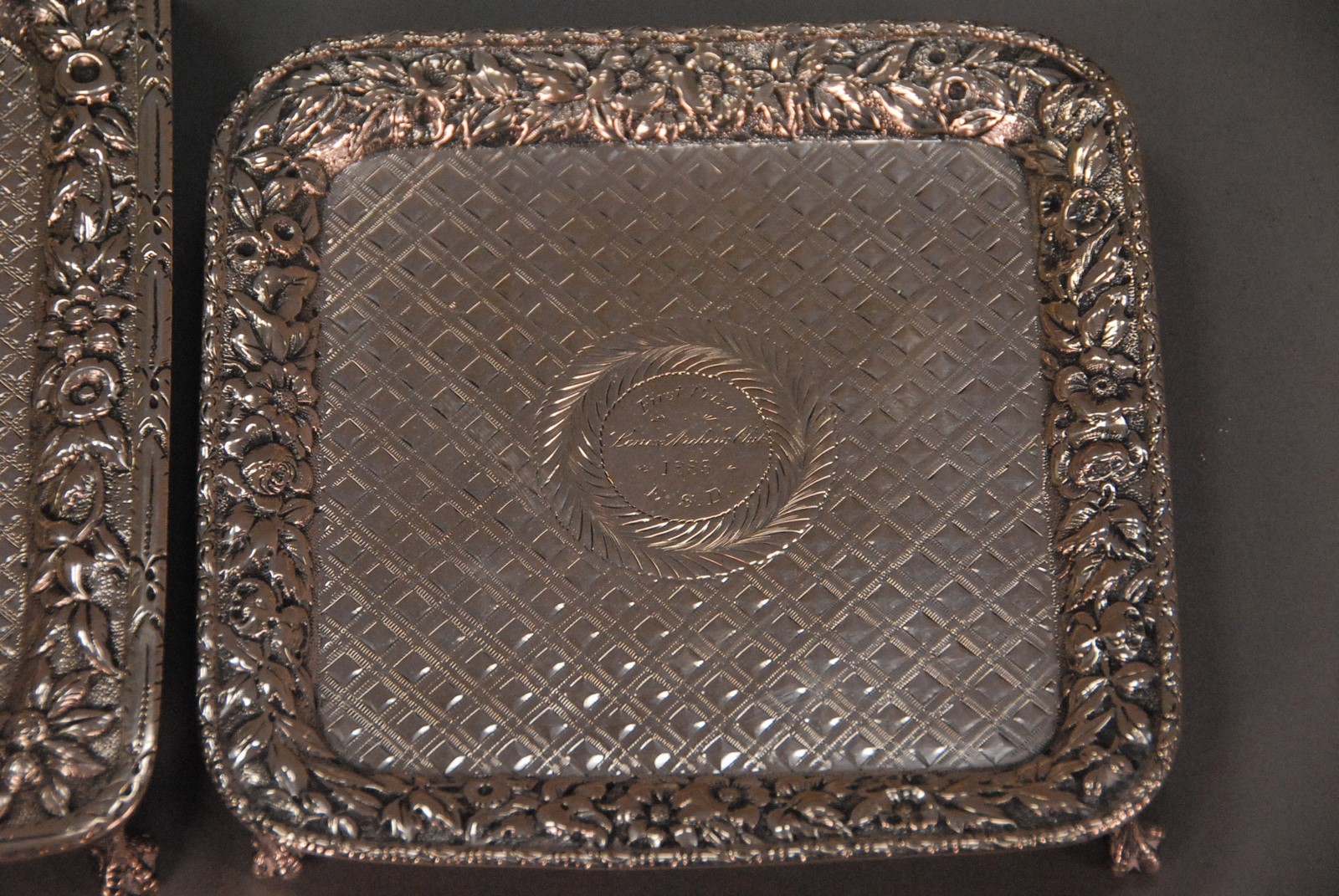 Lot 268: Three sterling silver square trays, each with repousse borders and ball and claw feet, two are monogrammed. 21.2 t oz.