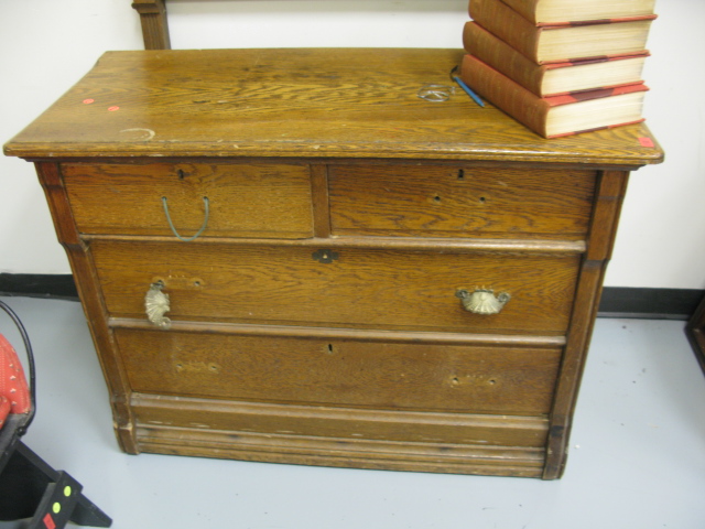Two oak chests, one mirror, one mirror frame and a headboard