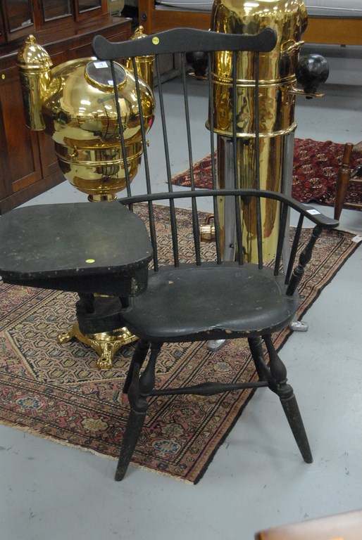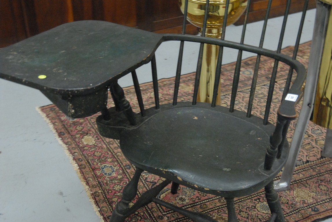 Lot 268: Windsor chair with fan back, writing arm with drawer all set on bold turned legs in old green paint over green paint, 18th century…..